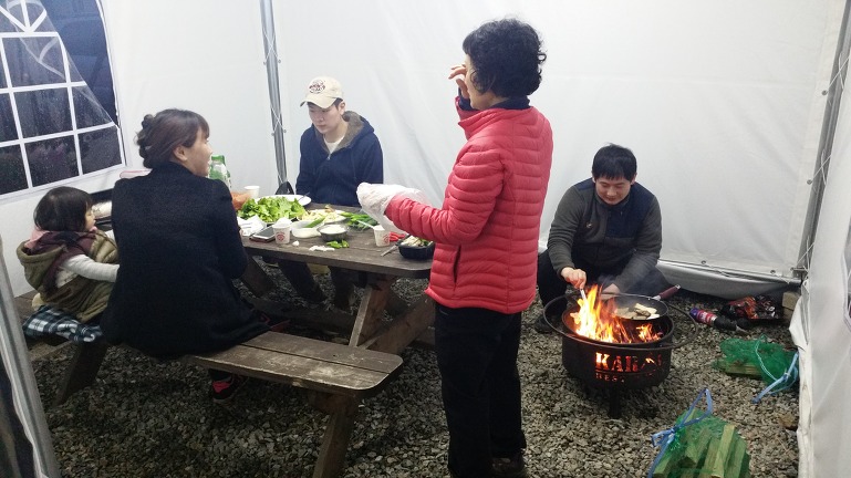 밀폐된 공간에서 장작을 태우니 연기가 나긴하지만 나름 괜찮은 조건에서 술한잔에 이런저런 이야기로 시간을 보내고