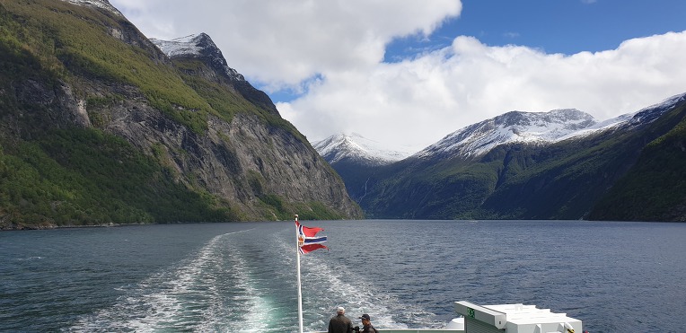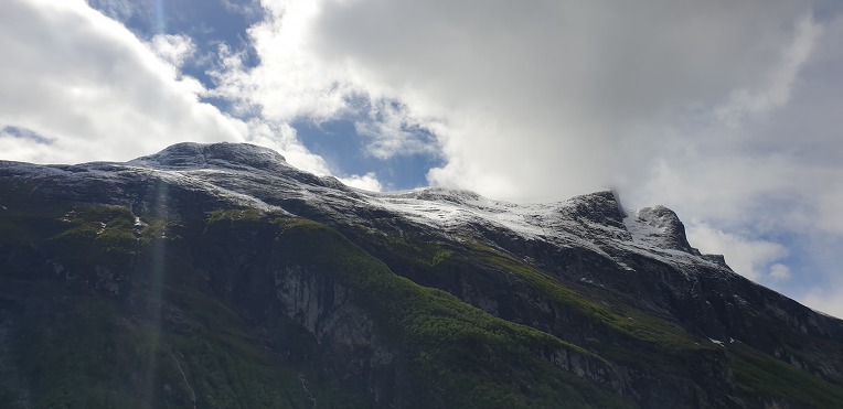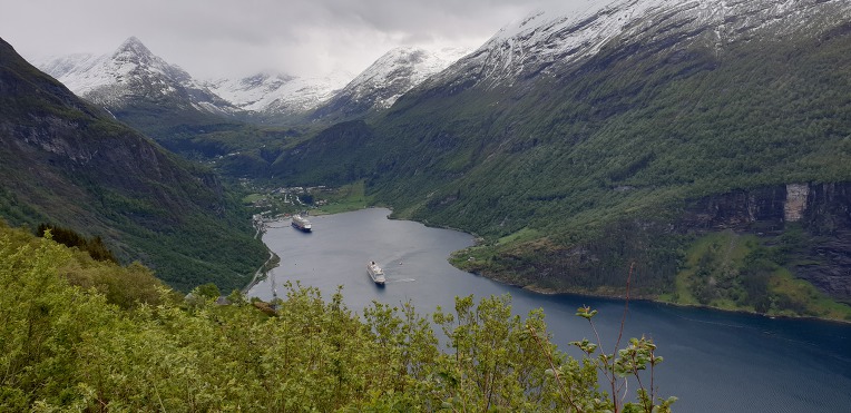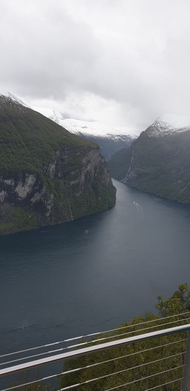 고봉의 눈과 초록의 자연,깊은 계곡과 계곡아래의 시원한 바닷물. 그리고 그위에 떠있는 대형의 크루즈선.