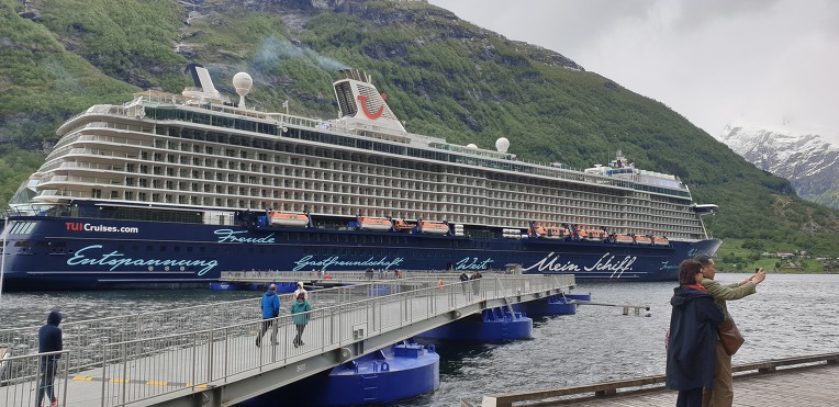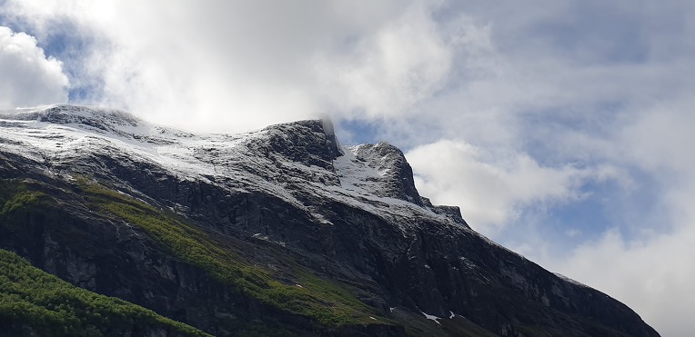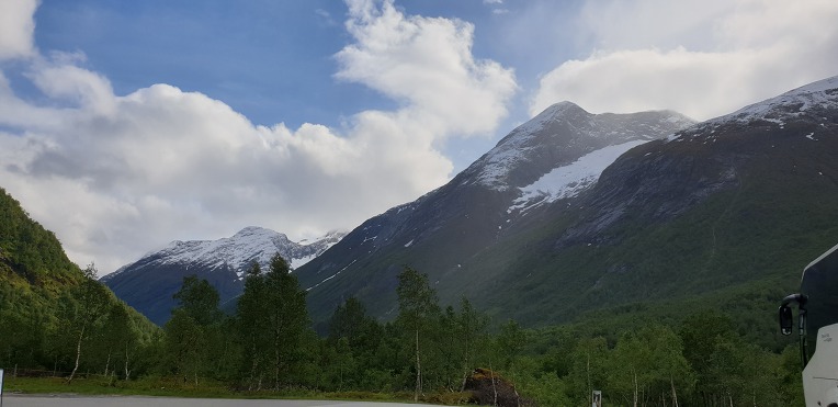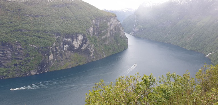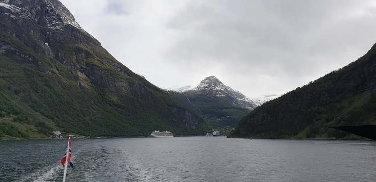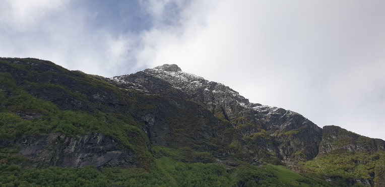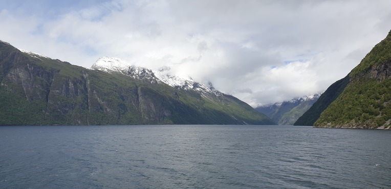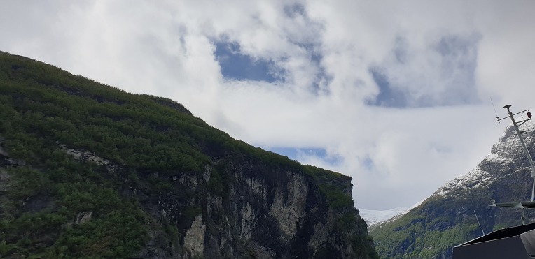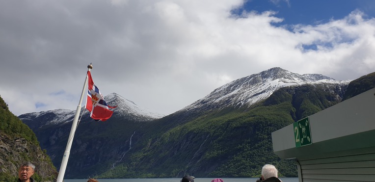 고봉의 눈과 초록의 자연,깊은 계곡과 계곡아래의 시원한 바닷물. 그리고 그위에 떠있는 대형의 크루즈선.