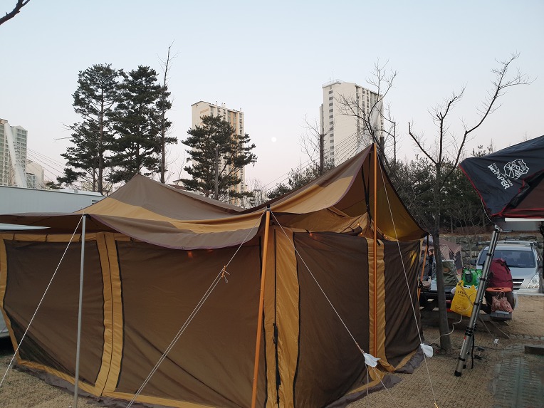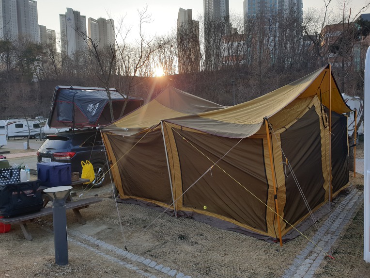 루프탑을 딸네식구에게 내어주고 스크린을 친 텐트에서 자기로 하였는데 바닥이 생각보다 추워