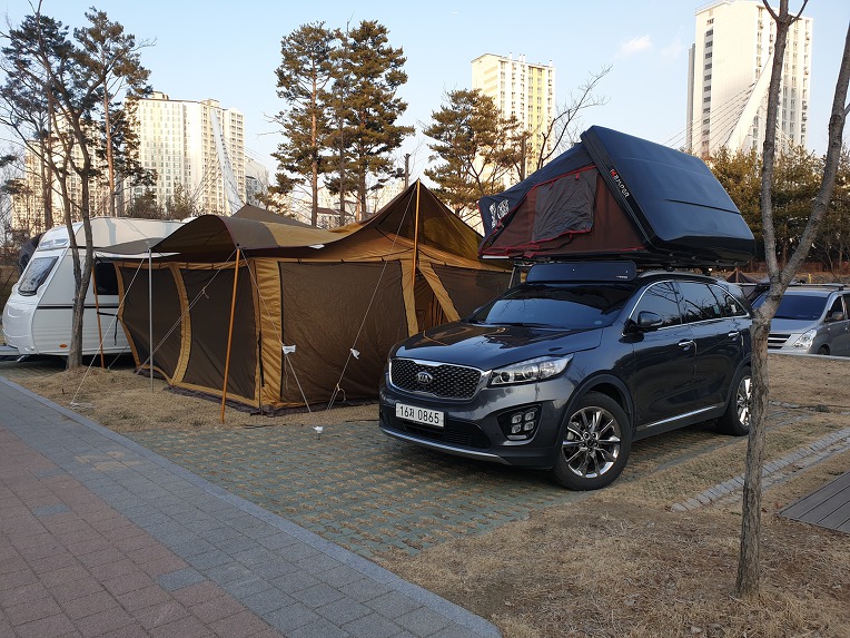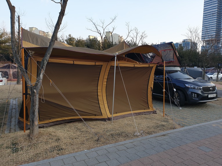 루프탑을 딸네식구에게 내어주고 스크린을 친 텐트에서 자기로 하였는데 바닥이 생각보다 추워