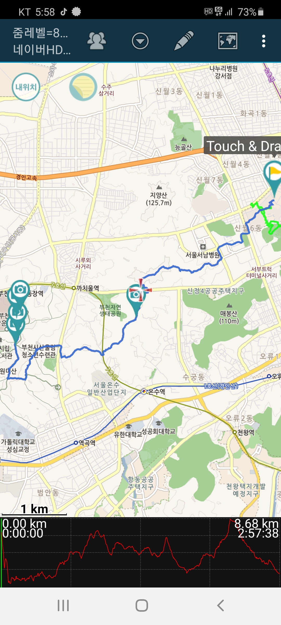 부천종합운동장으로 내려선다. 3시간이 소요된 8.68km의 거리이다.