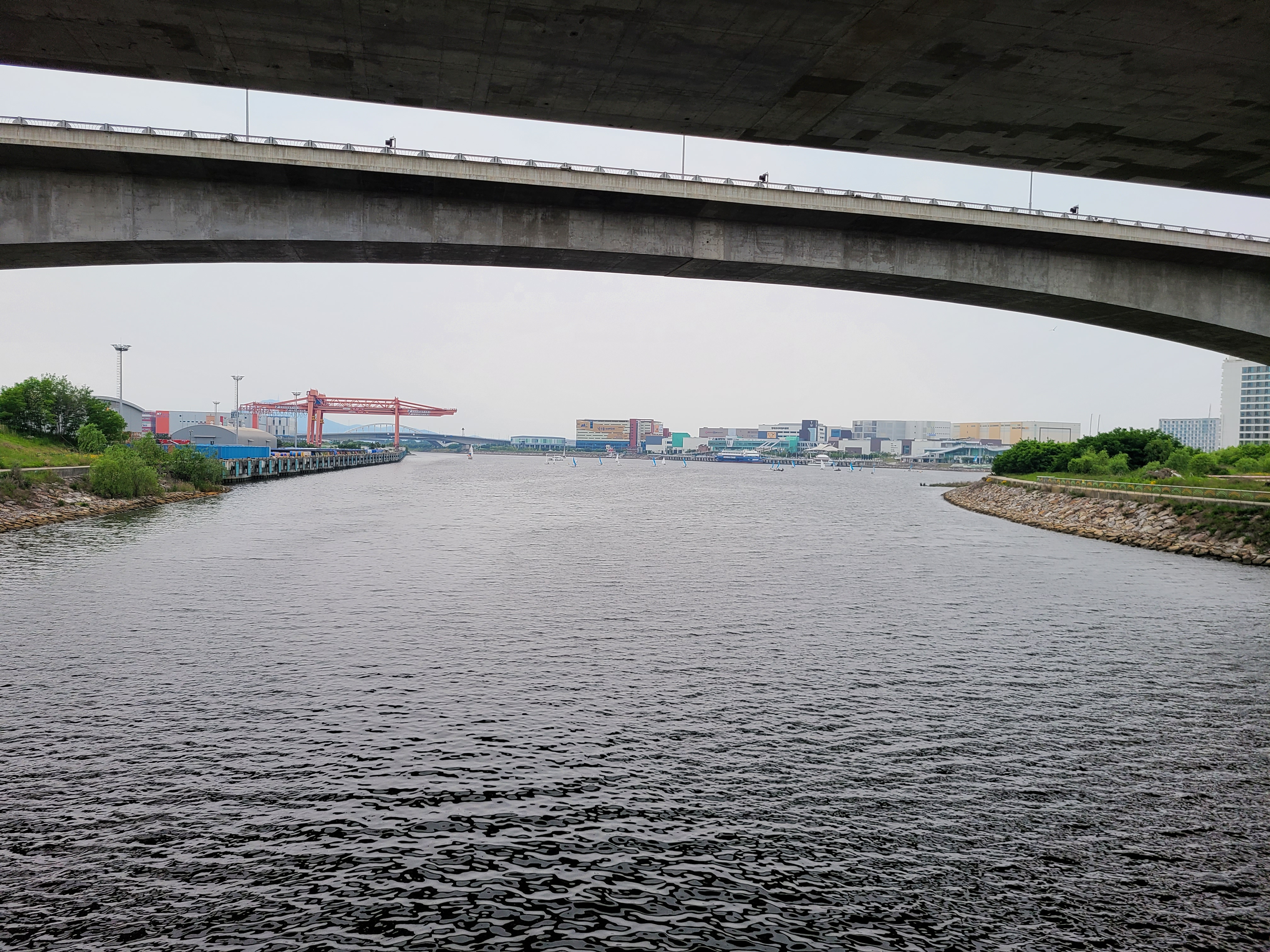 오늘의 목적지인 아라뱃길입구. 많은 숫자의 요트가 서핑을 즐기고 다리아래에서는