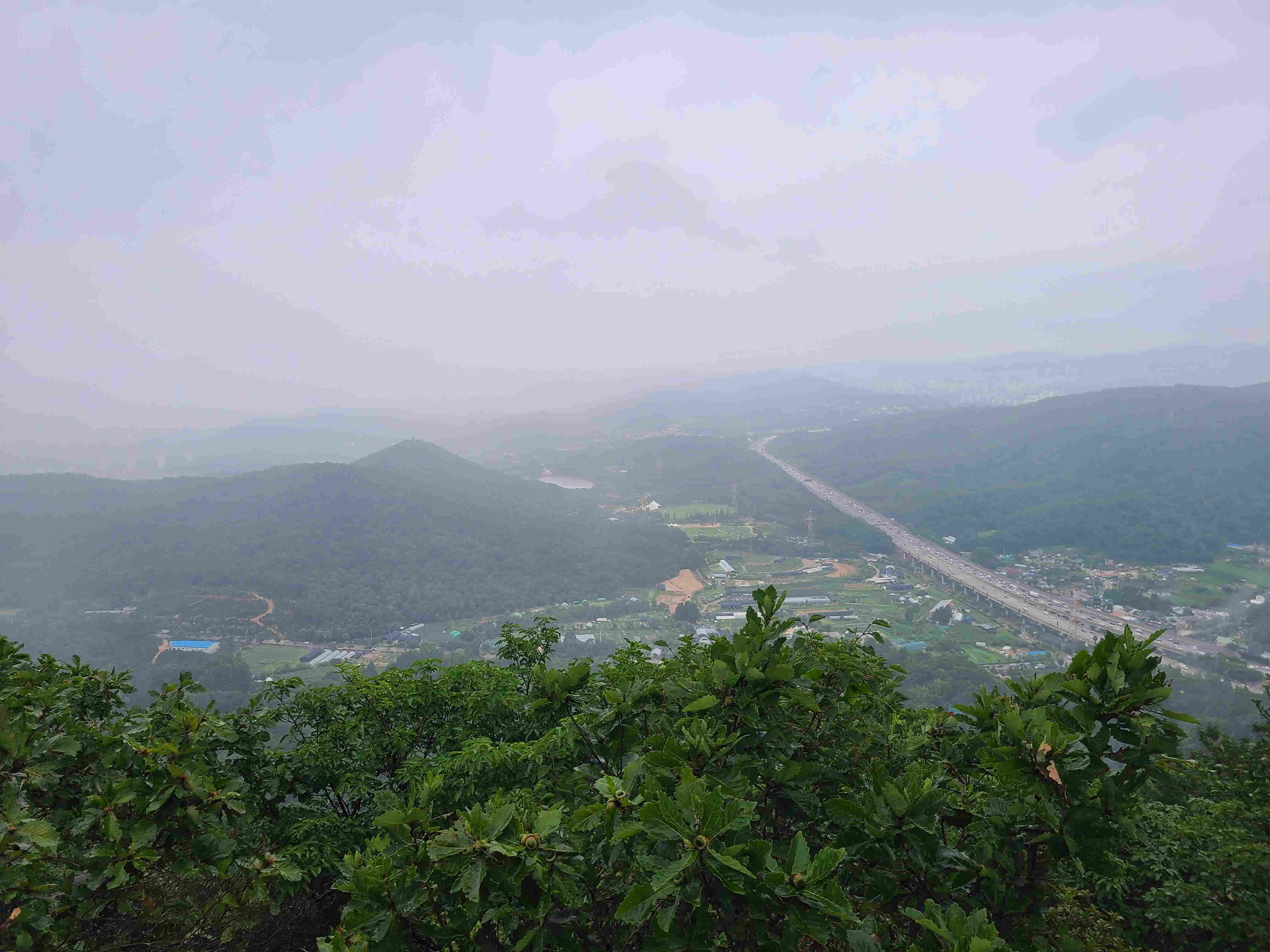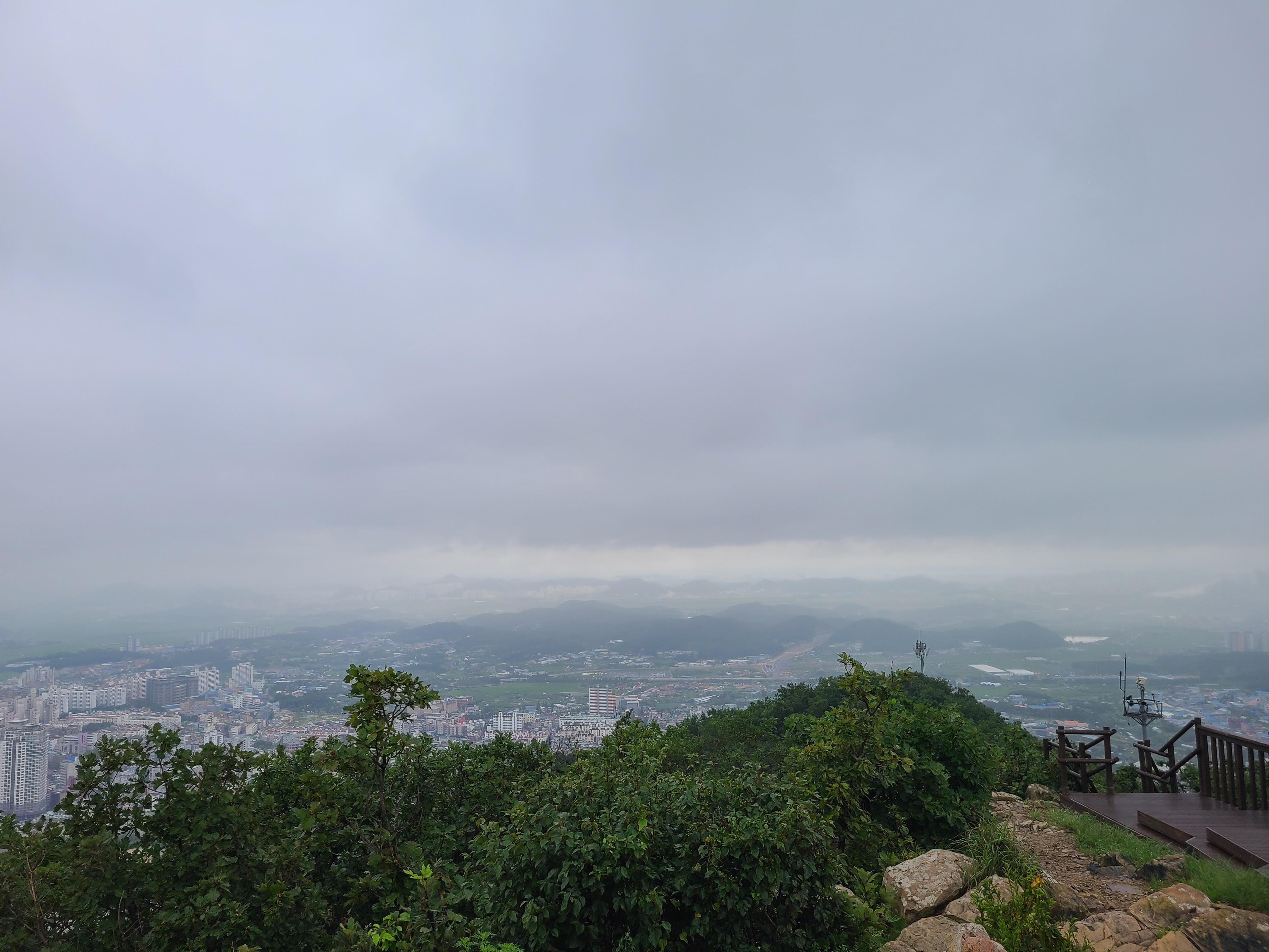 가랑비가 내리는 가운데 정상에 도착하여 전망을 조망하고 참외하나를 먹고는 바로 하산길로 들어선다.