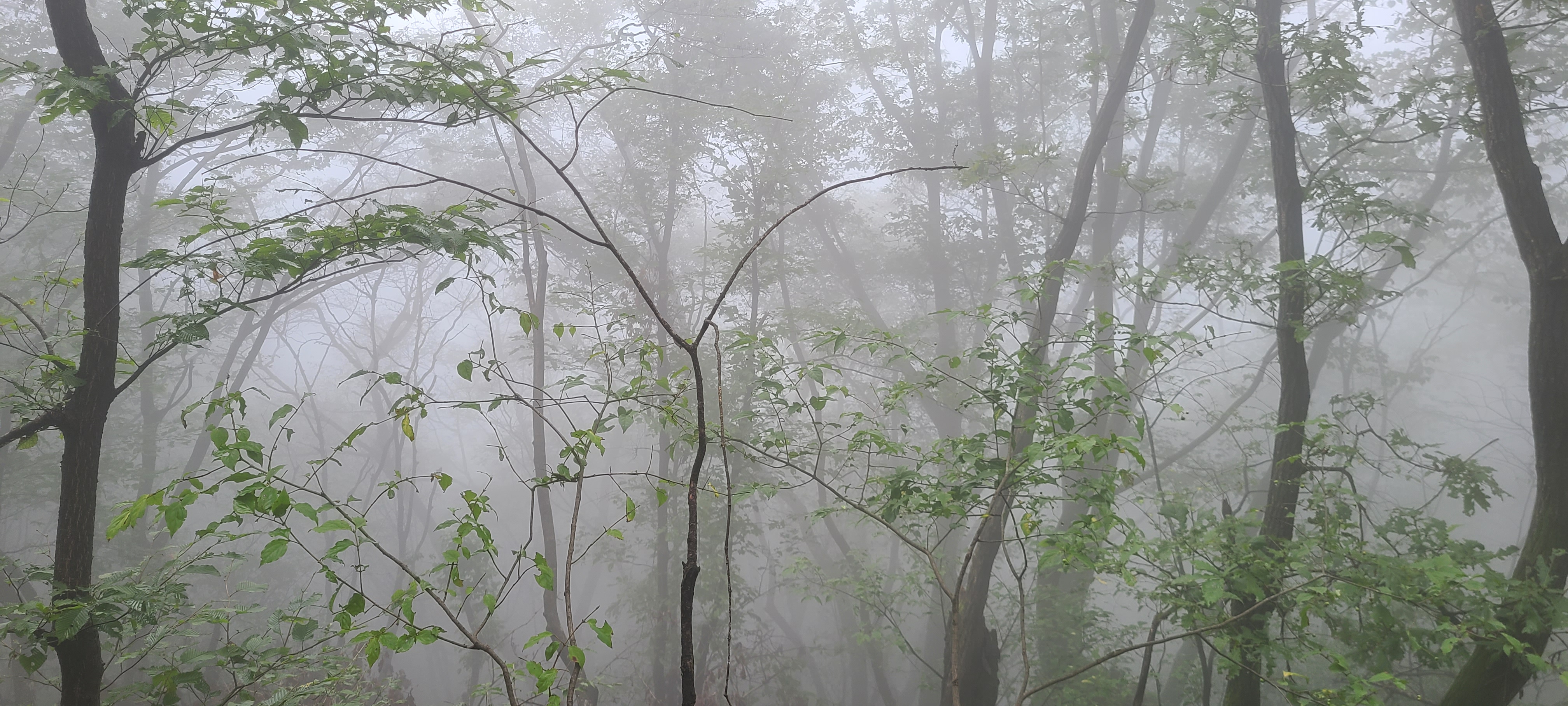 내려다보이는 숲속이 해무에 잠겨 몽환적인 분위기를 연출한다.
