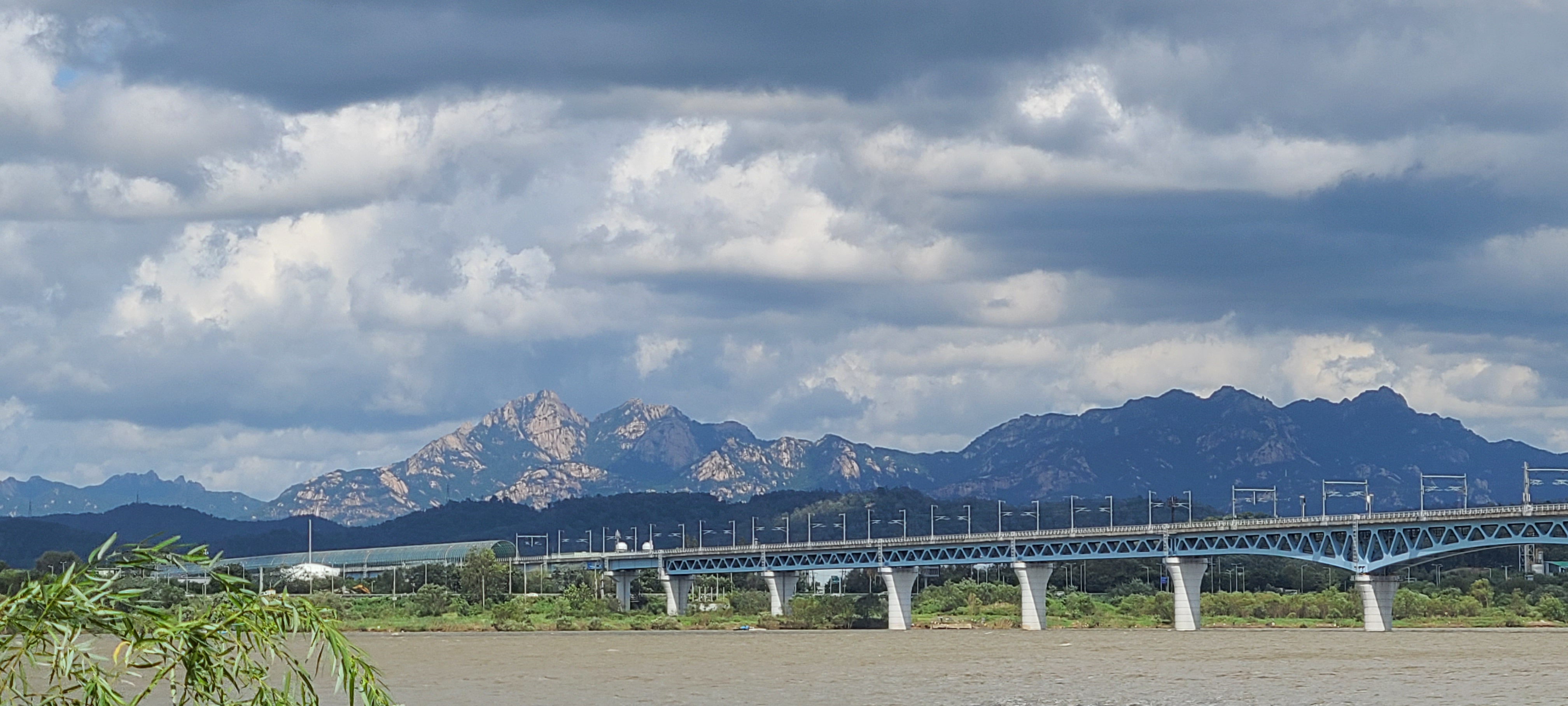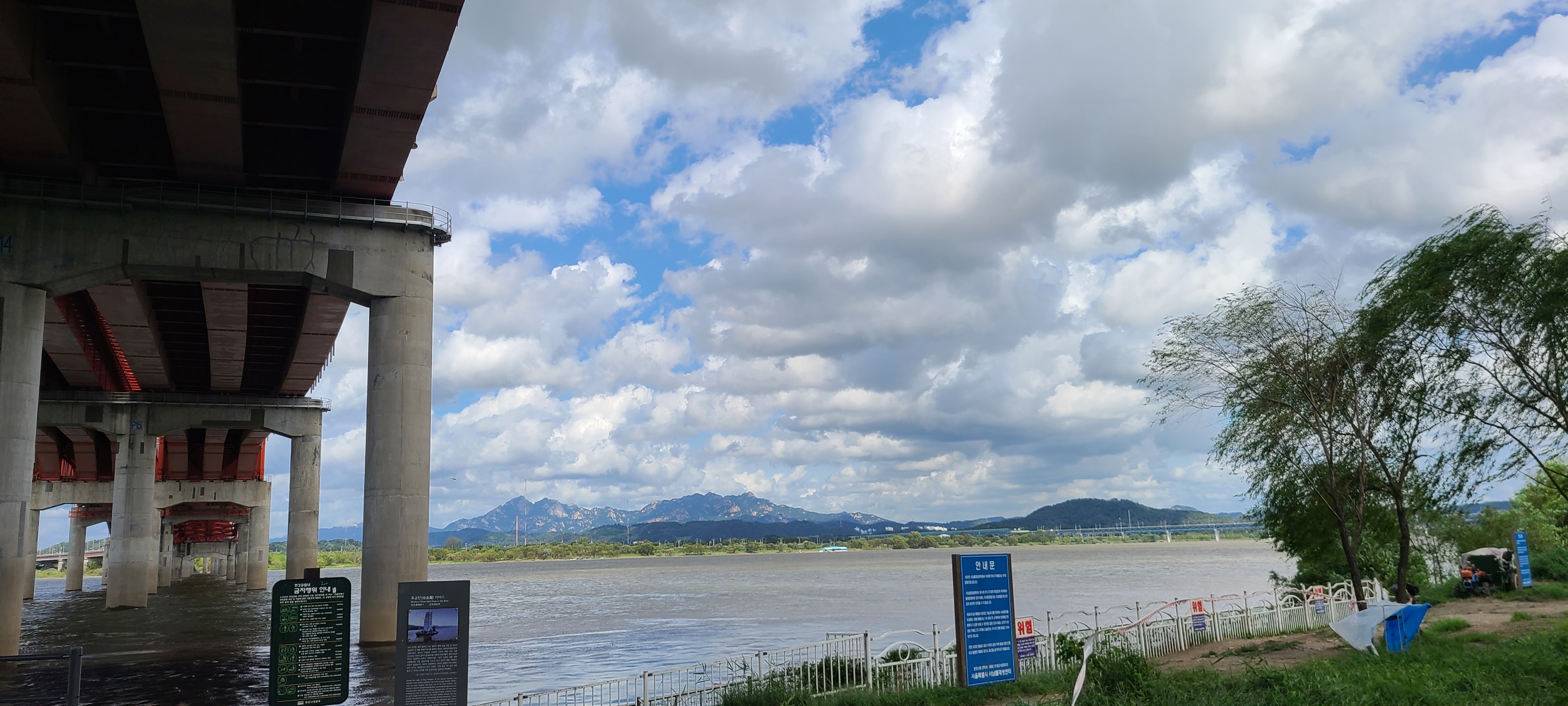 방화대교에서 잠시 휴식을 취하여 눈앞에 다가선듯 선명히 보이는 북한산의 전경과 일렁이는 강물,
