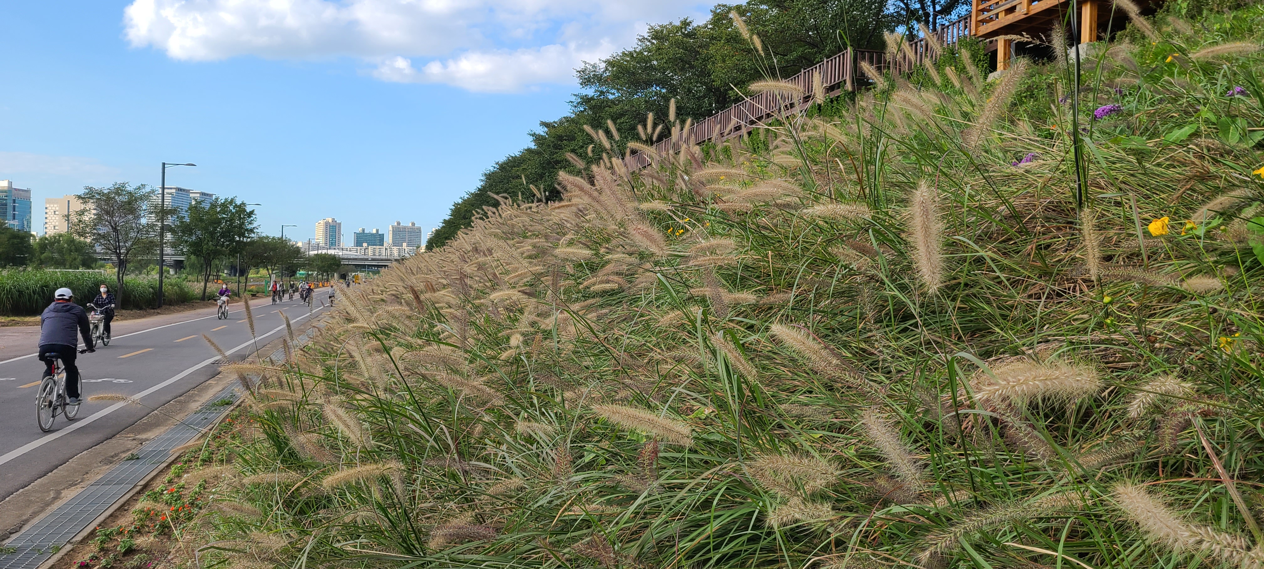 안양천을 올라서니 주말이라 사람들이 많다. 둑방에는 강아지풀이 탐스럽게 바람이 휘날리고