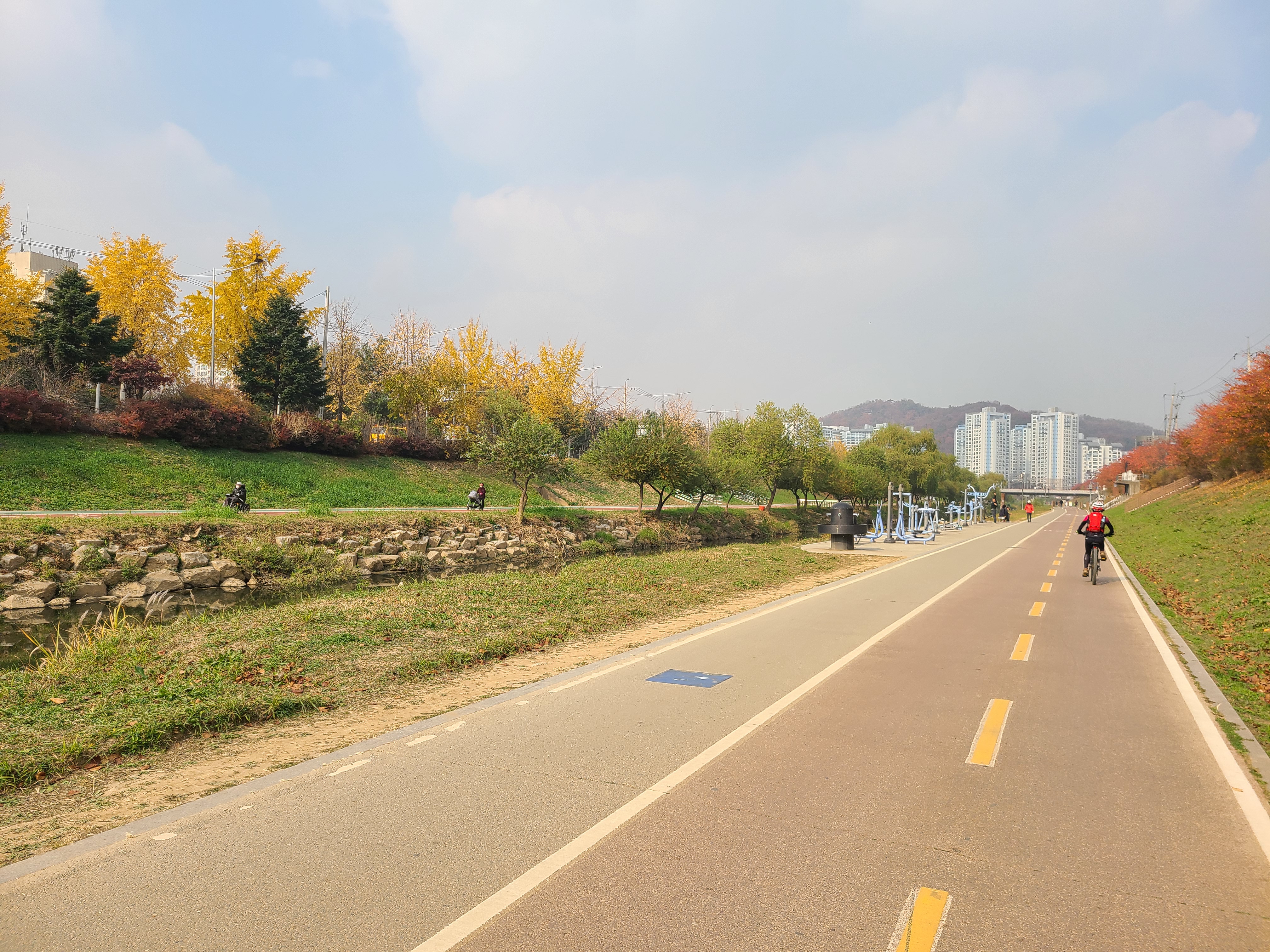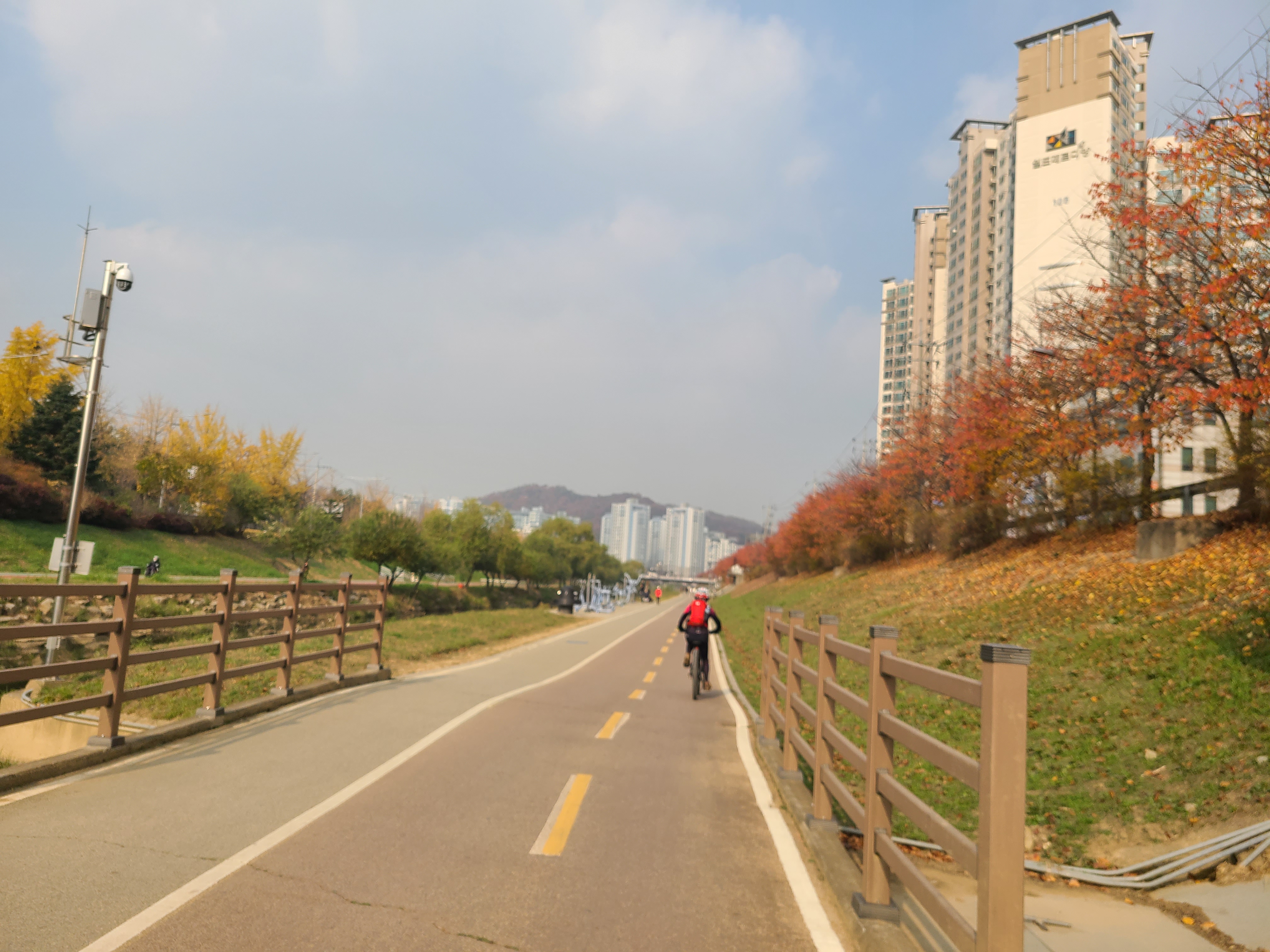 한참을 달리니 멀리 천왕동이 바라보이고 경륜장도 바라보이며 자전거 전용도로를 끝이난다.
