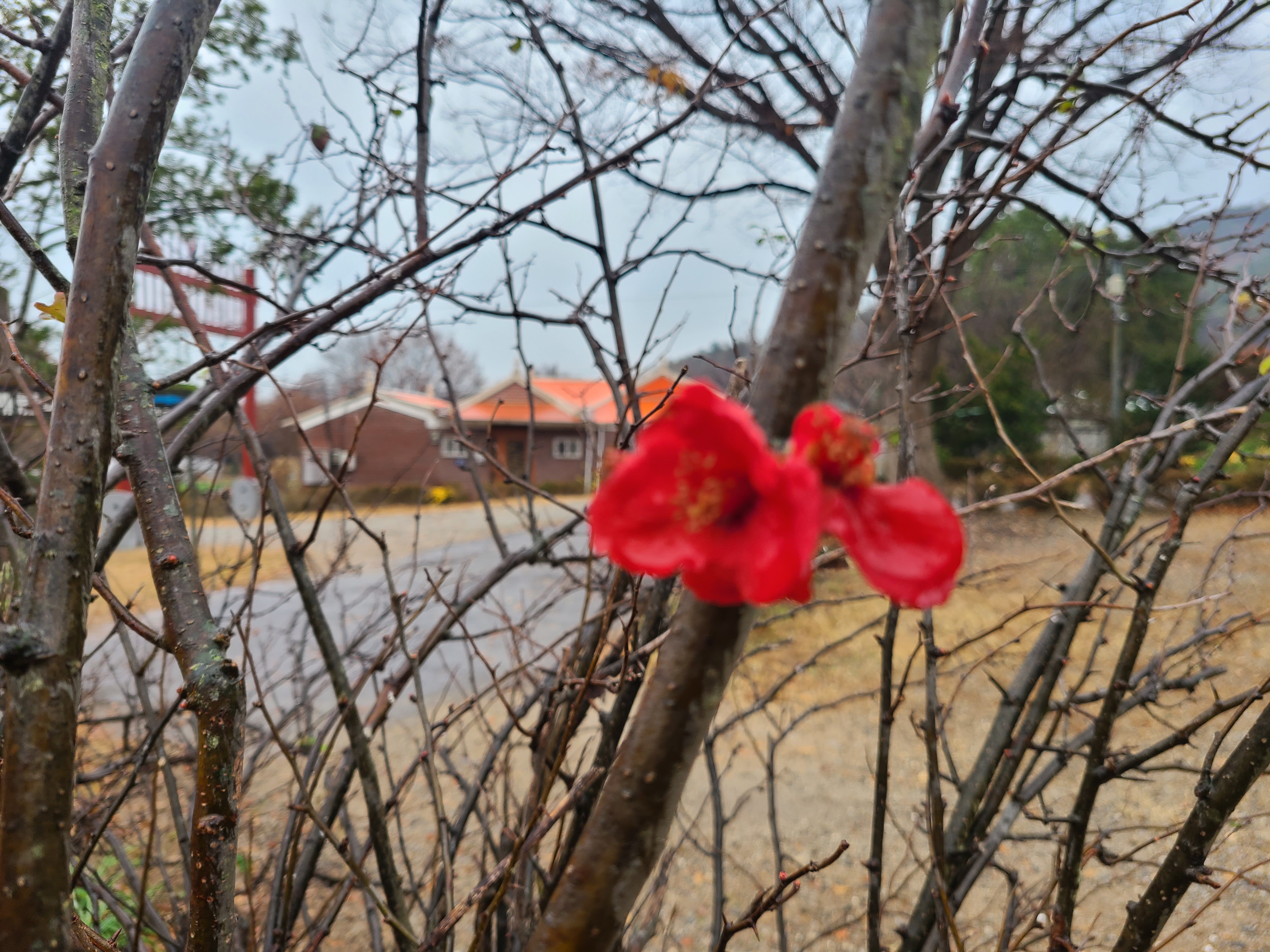 가을비 속을 걷는다. 어느곳엔 겨울에 접어드는 계절에 봄꽃인 명자꽃이 피어있다.