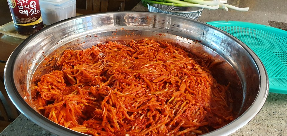 무우채에 고추가루를 섞은것을 생새우,마늘,생강,파,쑥갓 및 찹쌀죽을 넣어 적당량의 고추가루를 추가하여