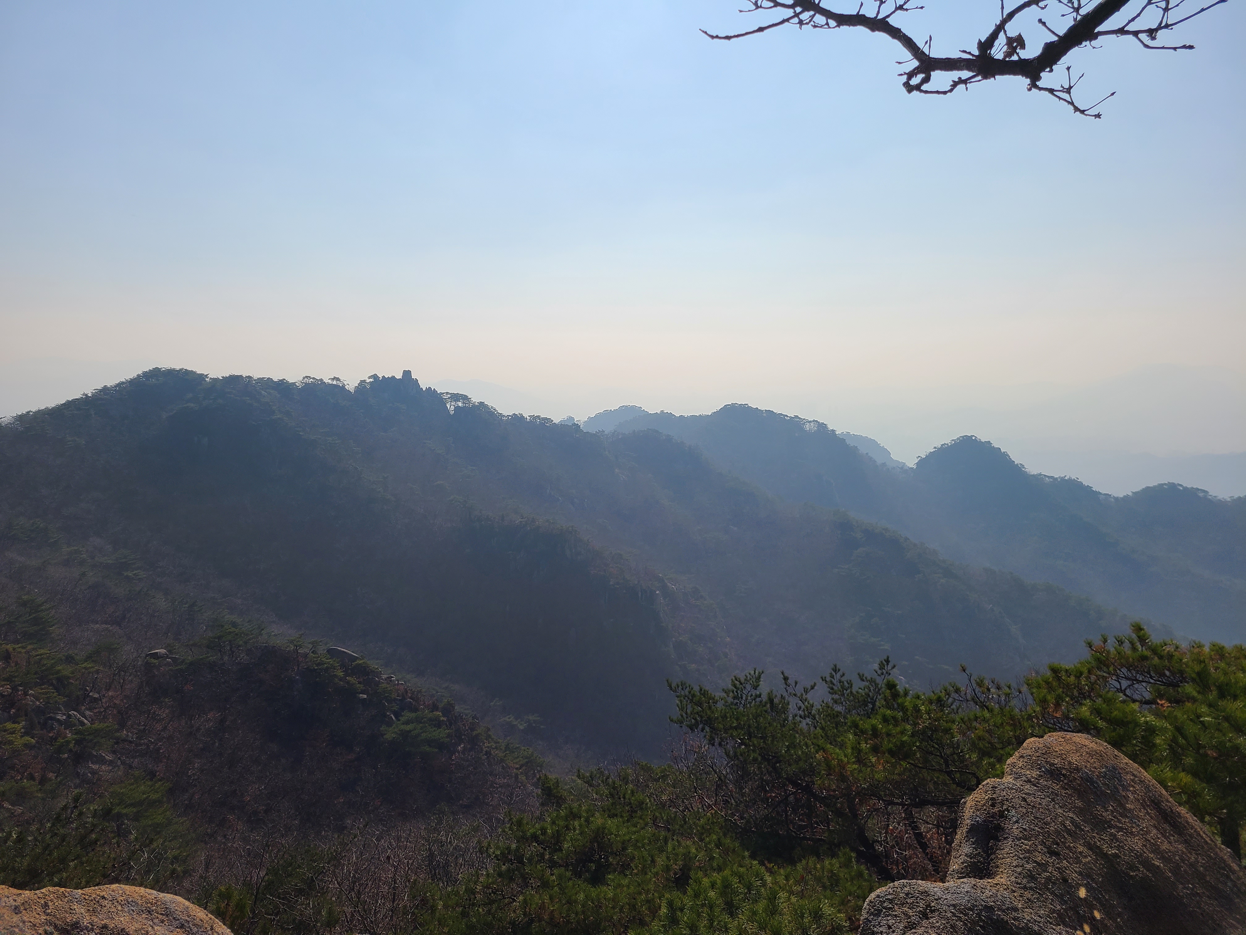 미세먼지로 시계가 좋지않은데 팔봉능선의 산그리메는 한폭의 수묵화 같다.