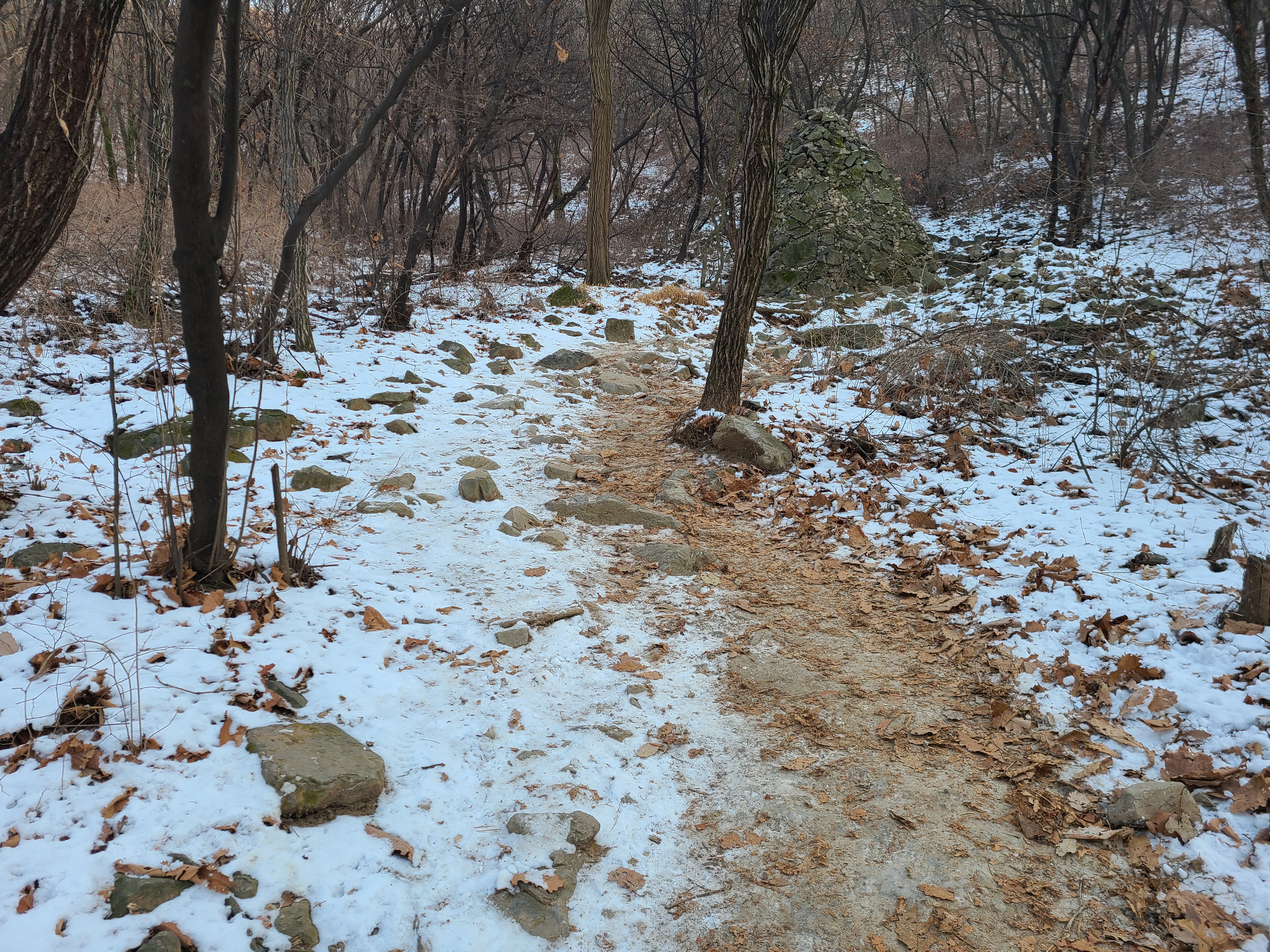 목장방향으로 접어드니 그늘이라 군데군데 눈이 쌓여있고 얼음길이나 사람들이 다녀 흙으로 다져져 그렇게