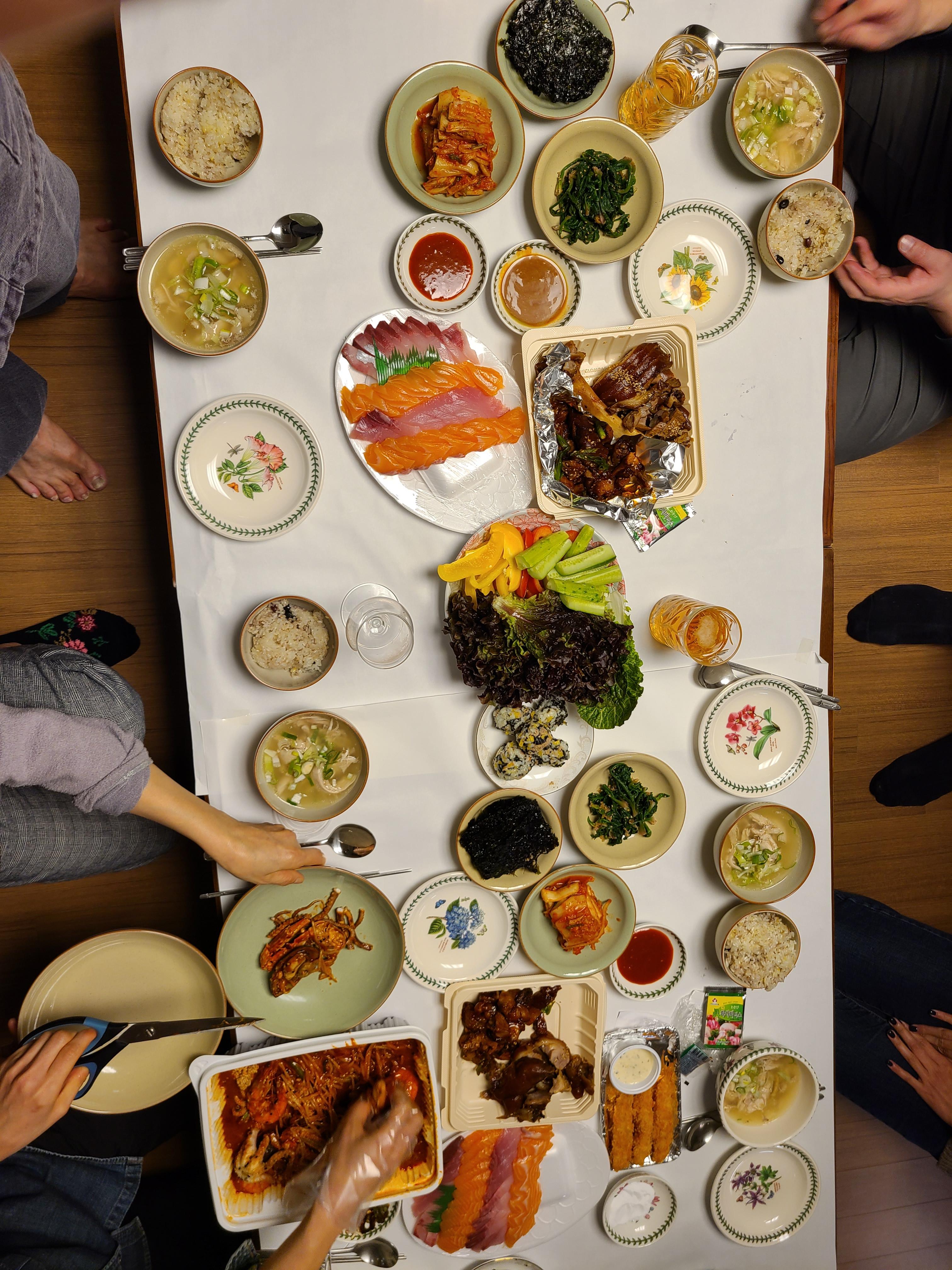 딸이 주문한 해물탕과 족발등이 속속 도착하고 상을 차리니 두시간이나 걸려 차를 몰고 며느리가 들어온다.