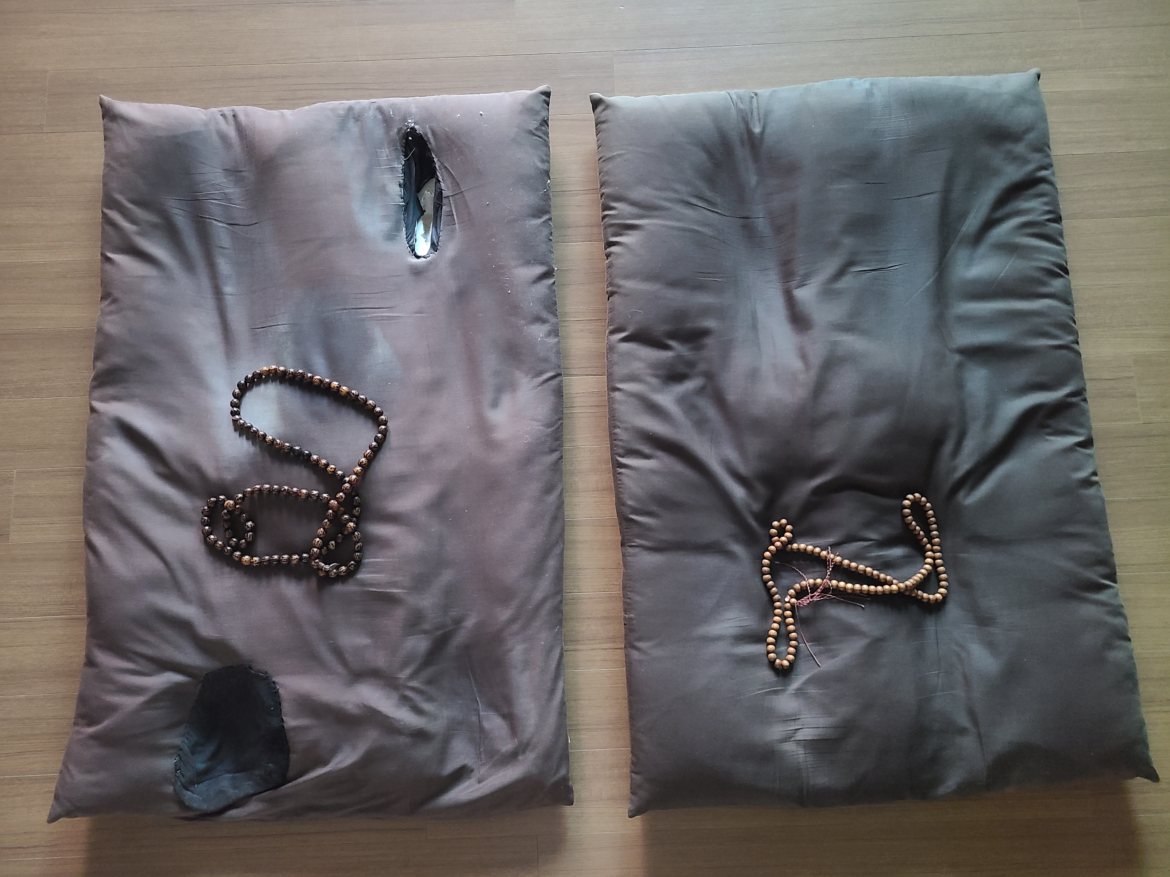아마도 염주를 돌리면서 방석의 일정부분을 누루다보니 그부위가 딿고딿아 구멍이 뚤리는가보다.