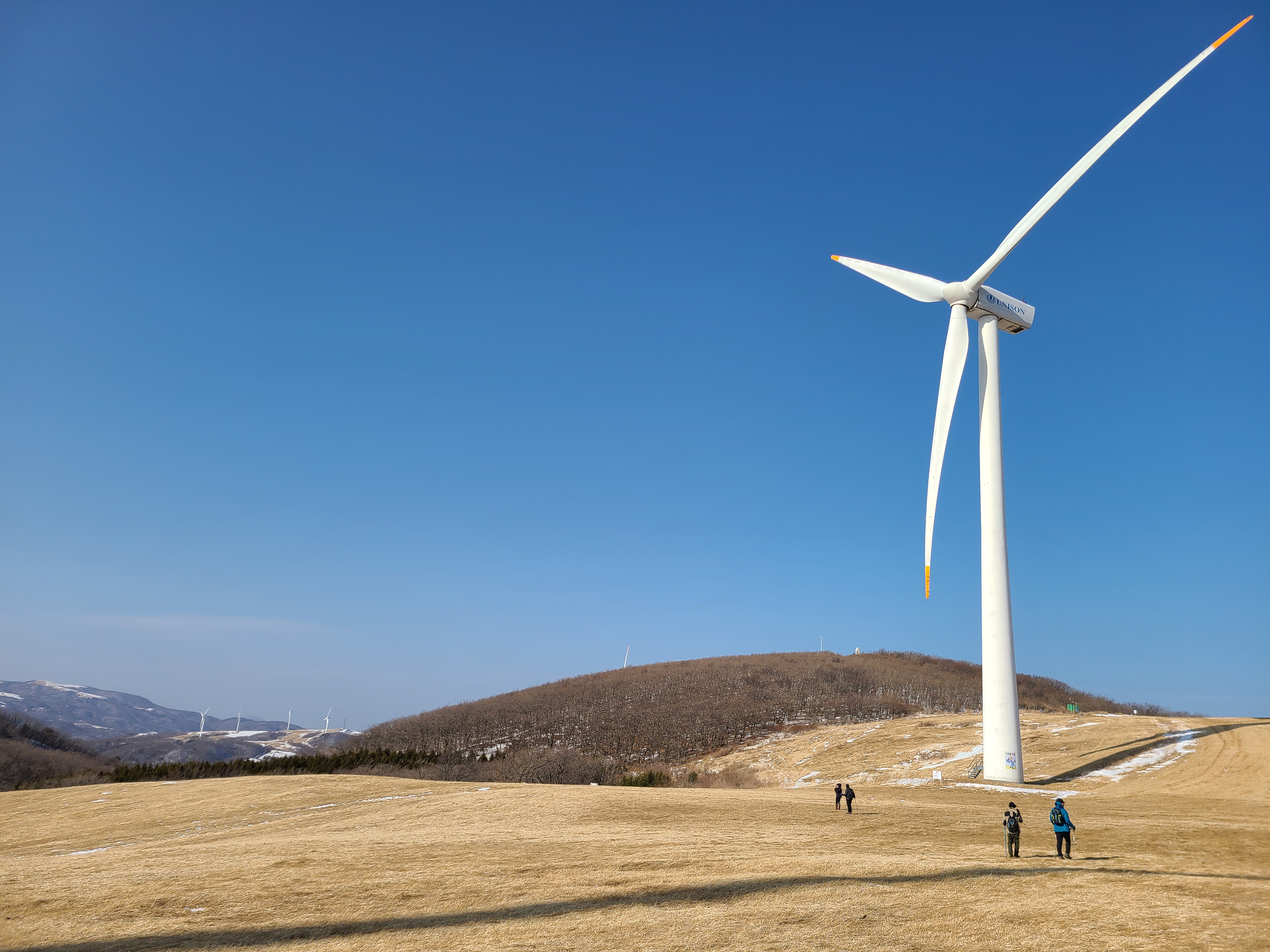 풍력발전소가 있는 능선의 부분도 눈은 녹아버리고 마른잔디들만 바람에 흔들리고있다.