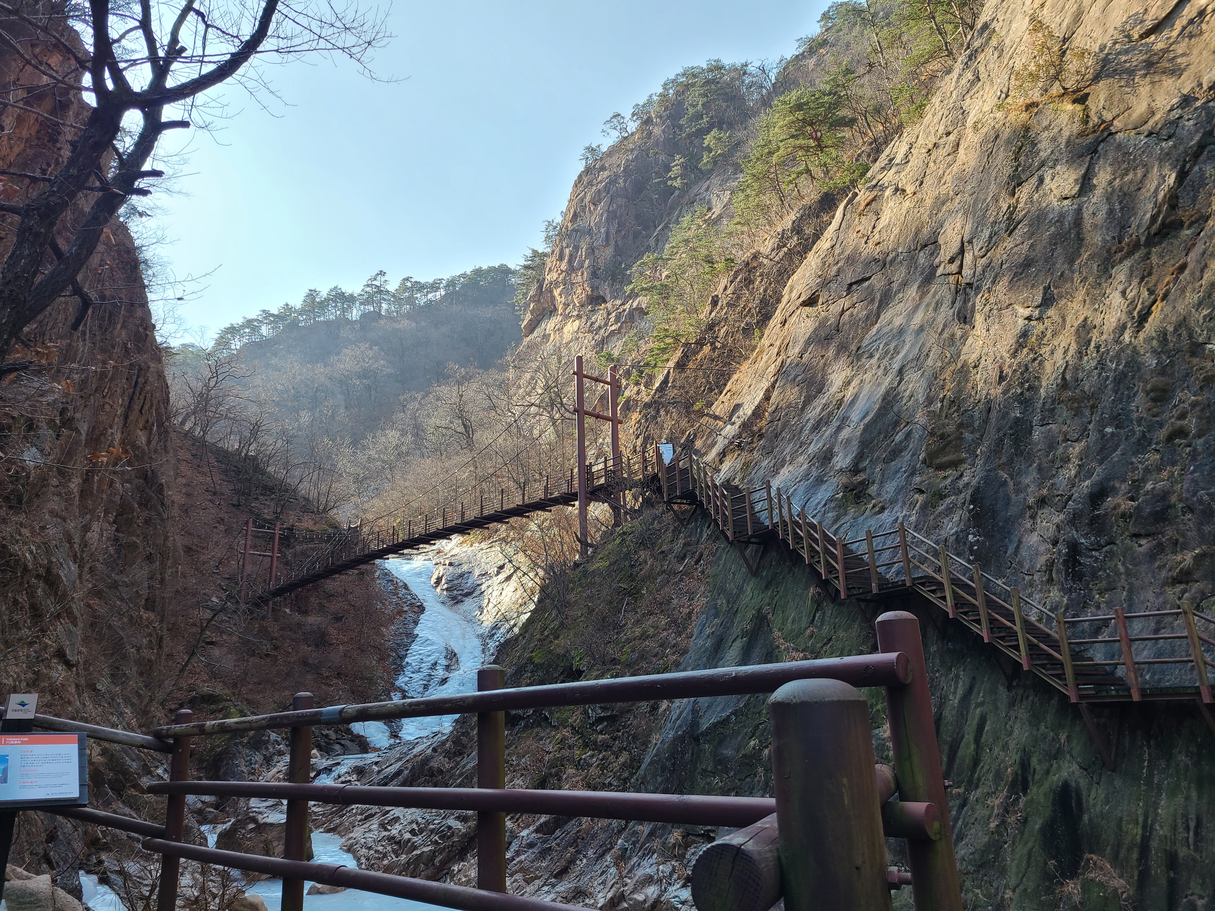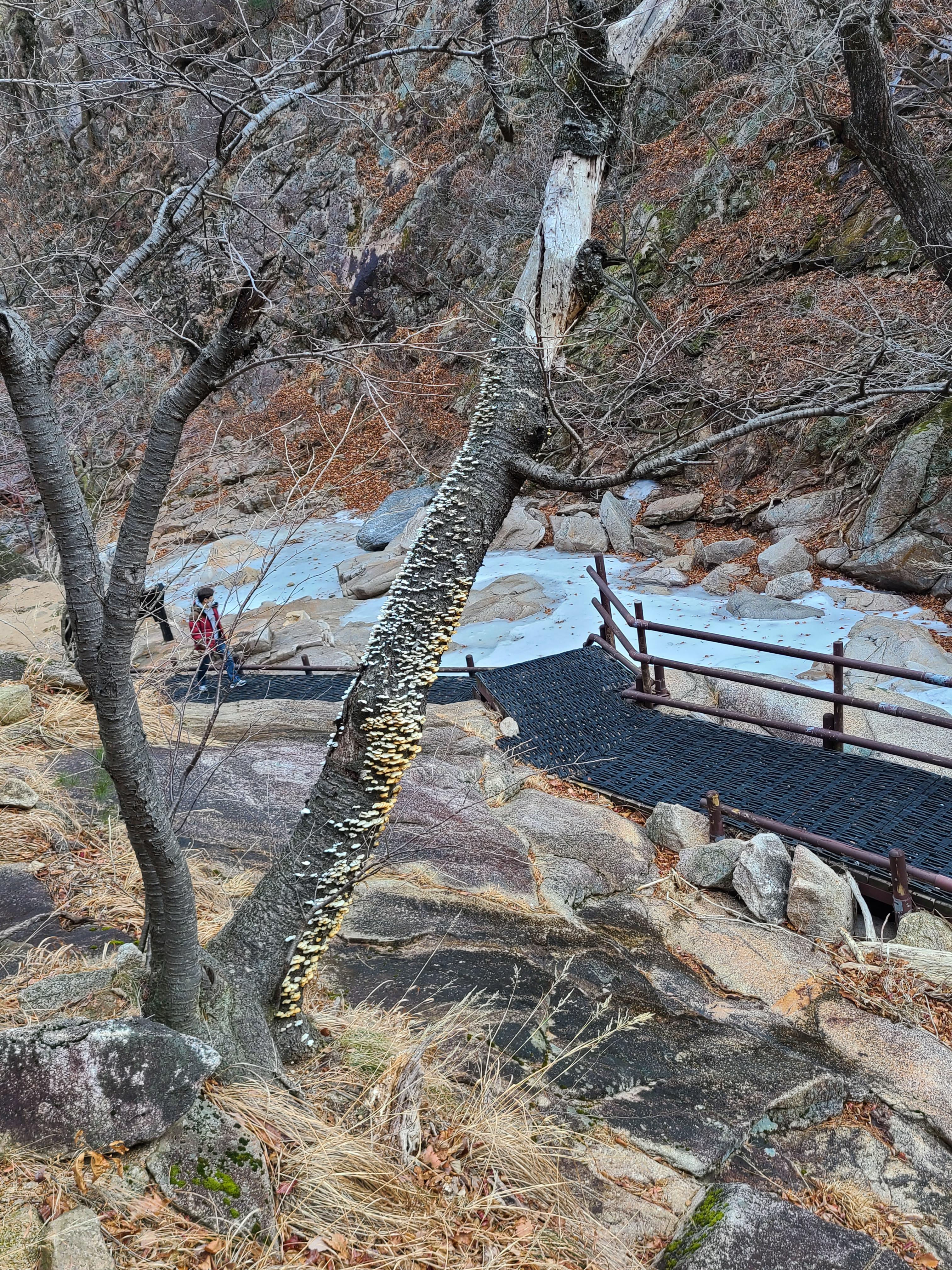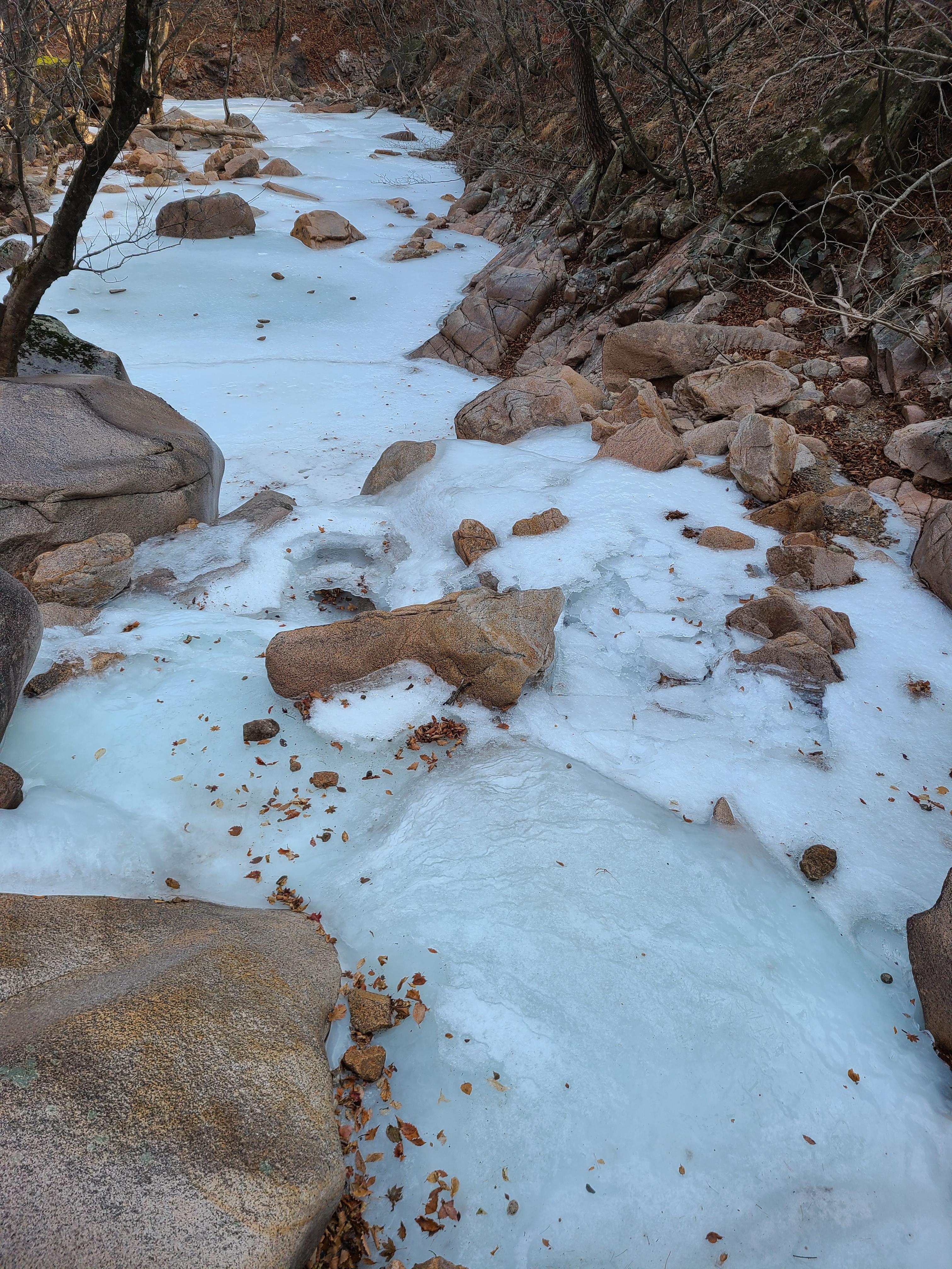 계곡이 얼어 얼음으로 뒤덮여 있지만 얼음밑으로 흐르는 물소리가 우렁차게 들리기도하고