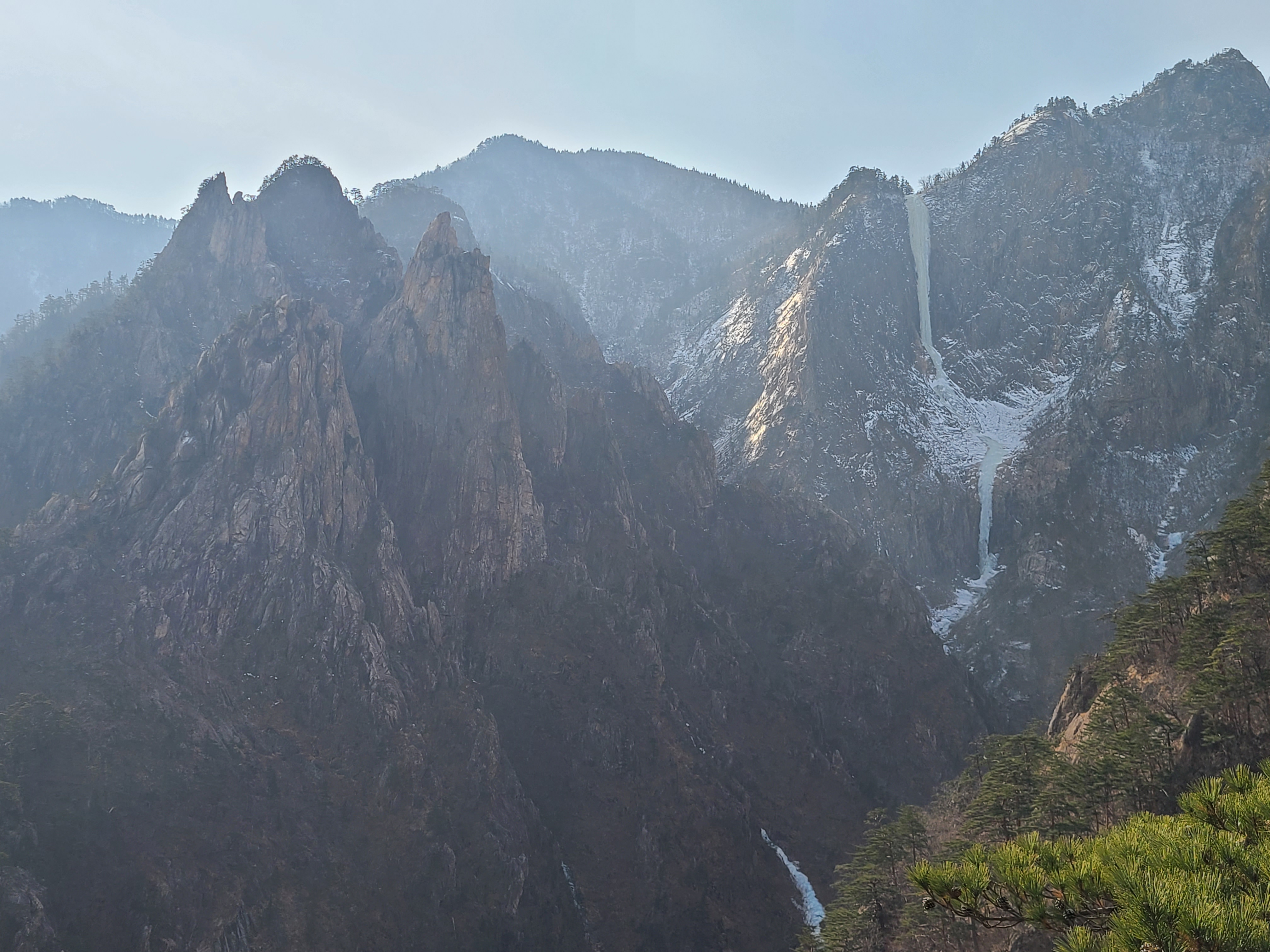 멀리 바라보이는 토왕성폭포는 이단의 물줄기가 얼어 장관을 이룬다.