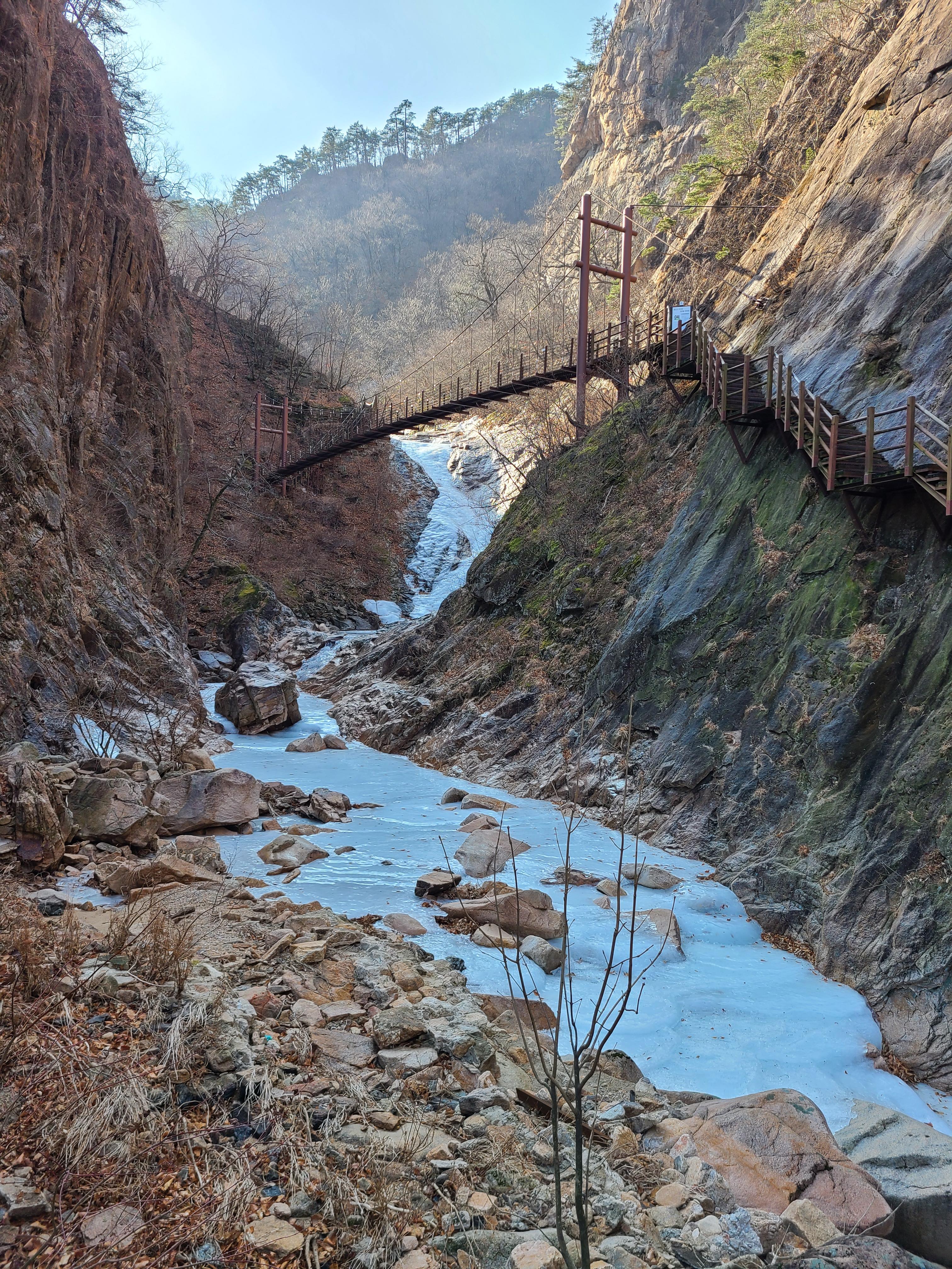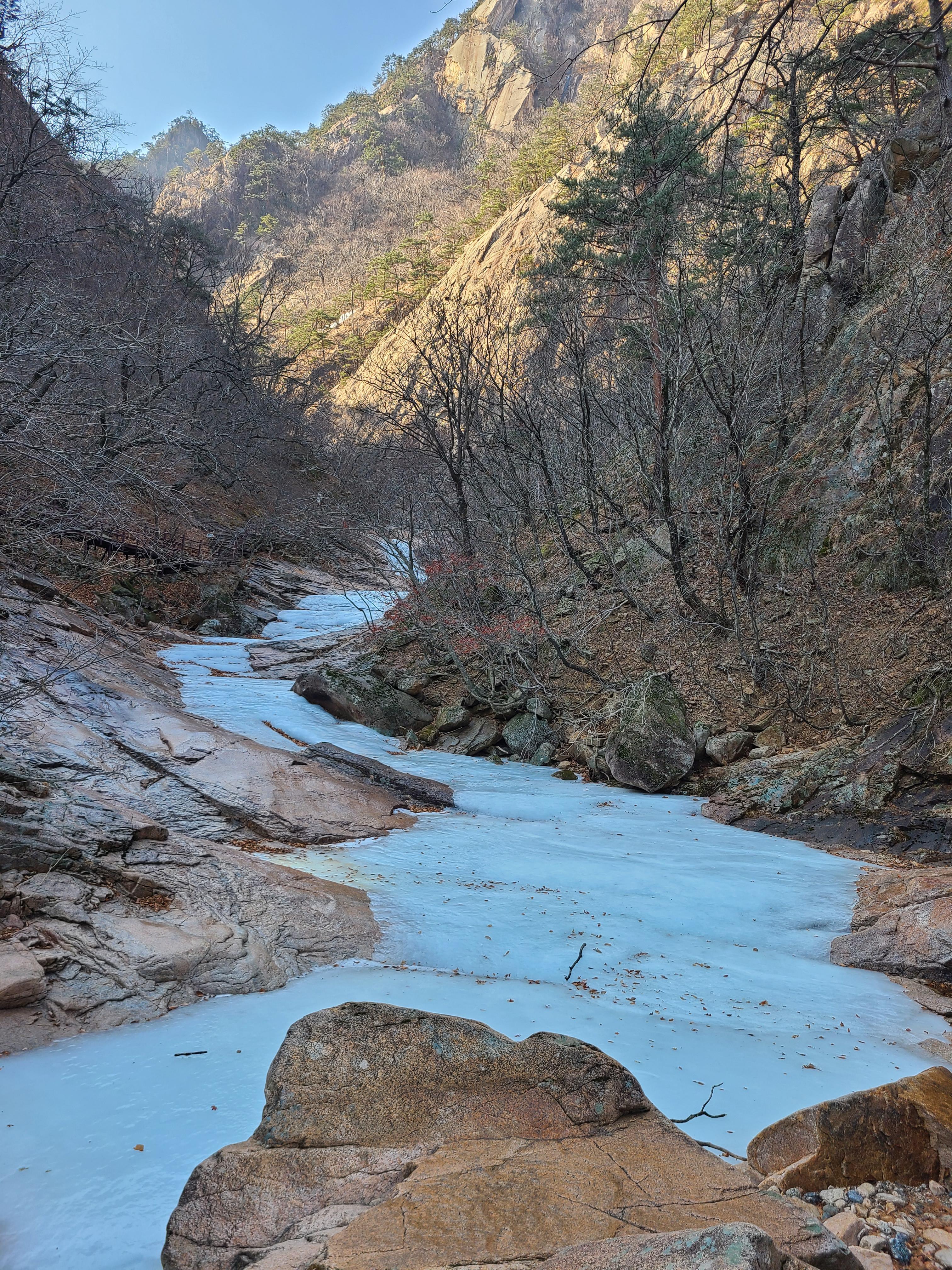 계곡이 얼어 얼음으로 뒤덮여 있지만 얼음밑으로 흐르는 물소리가 우렁차게 들리기도하고