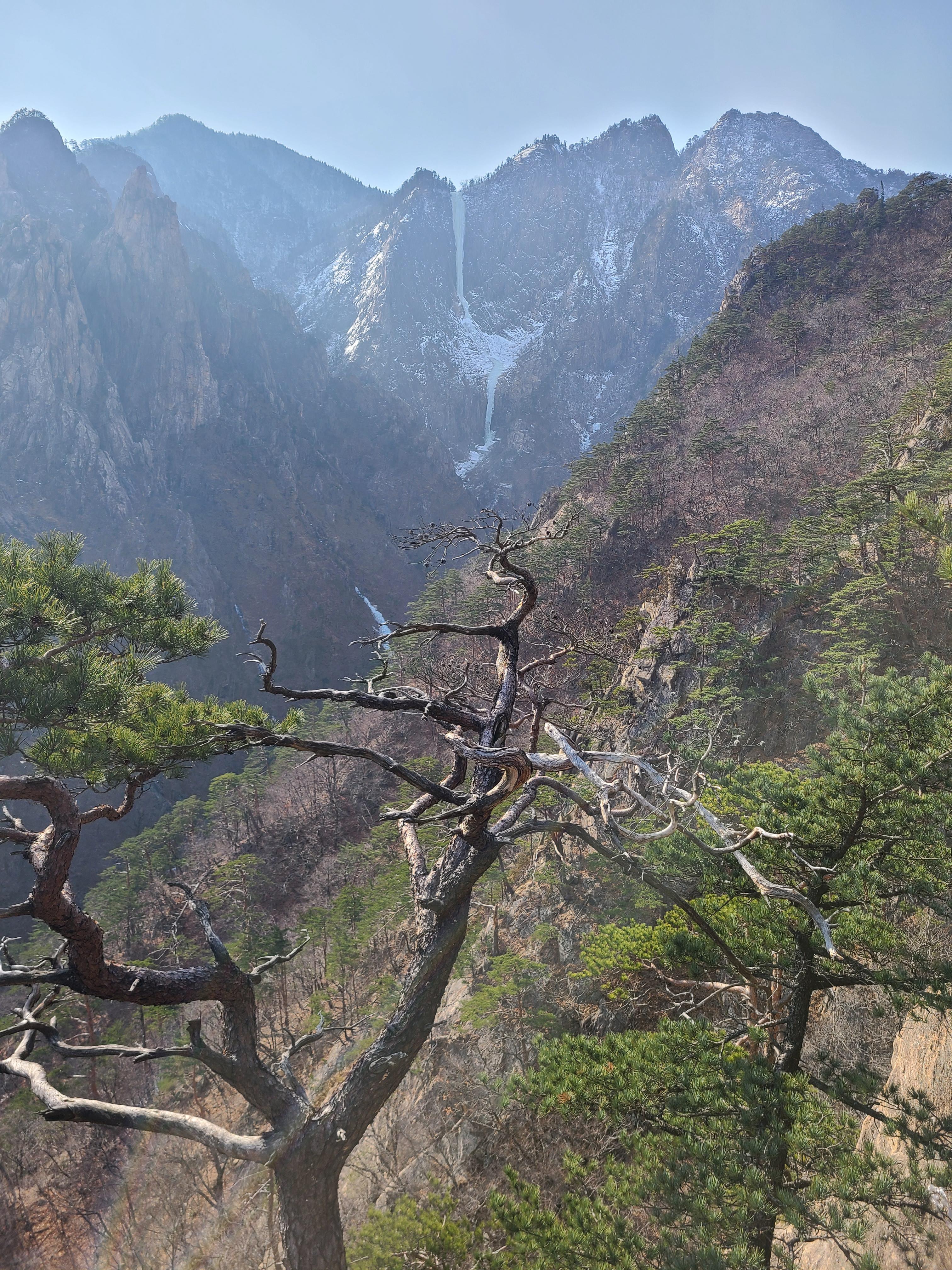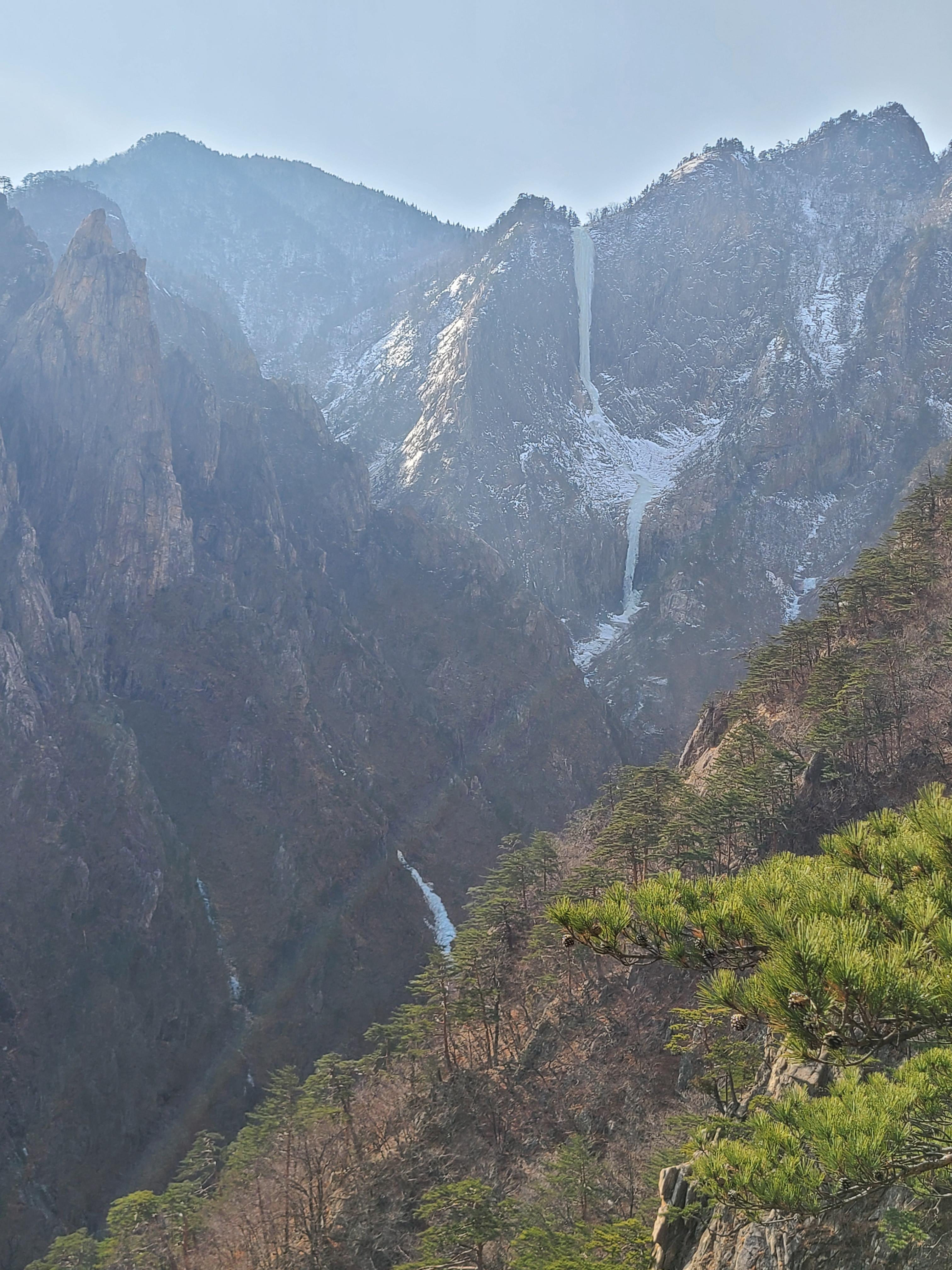 멀리 바라보이는 토왕성폭포는 이단의 물줄기가 얼어 장관을 이룬다.