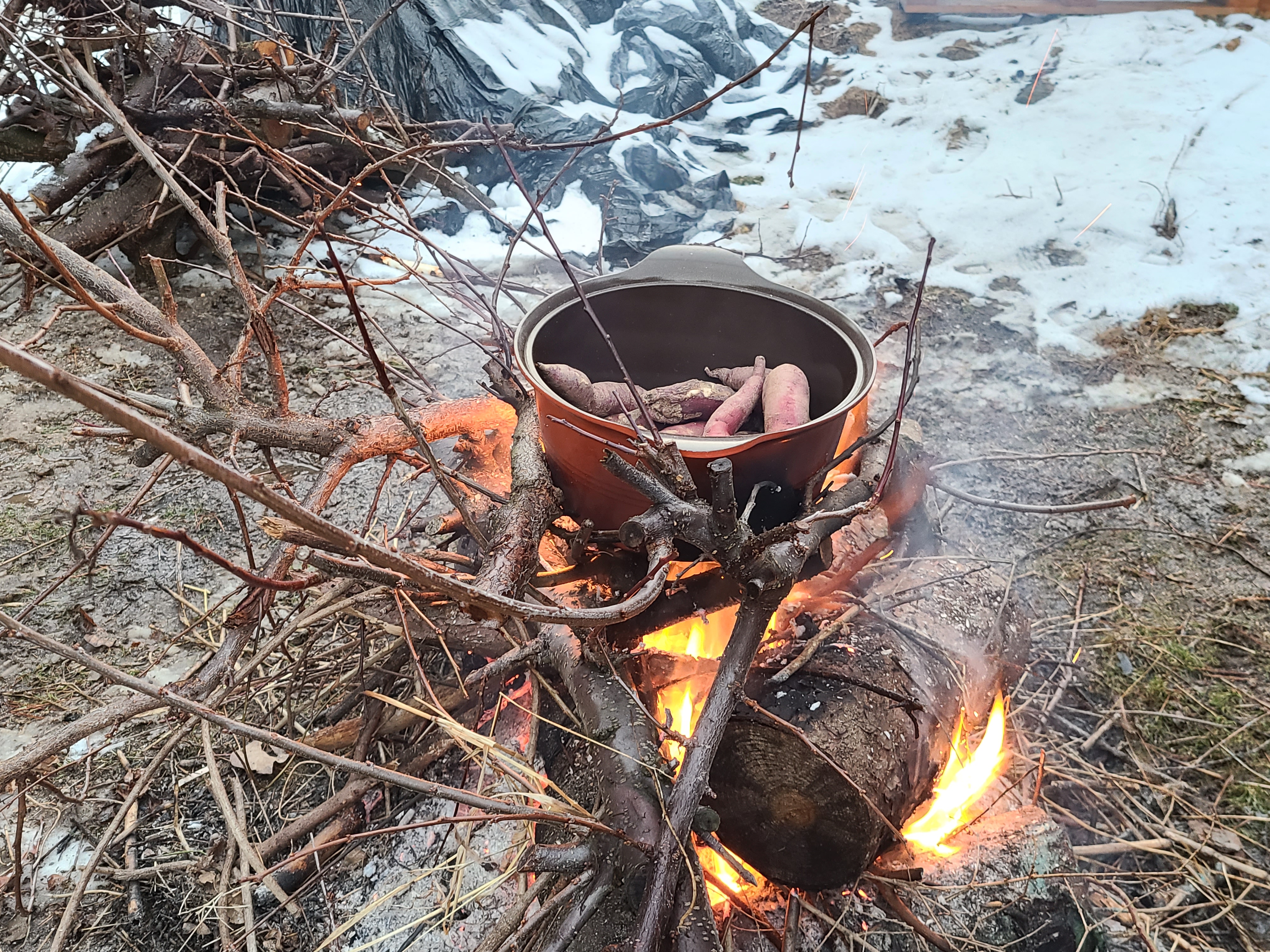 젖어 쉽게 불이 붙지않아 애를 먹는다. 모닥불위에 솥을 걸고는 고구마를 굽는데 하나도 먹지않았다.