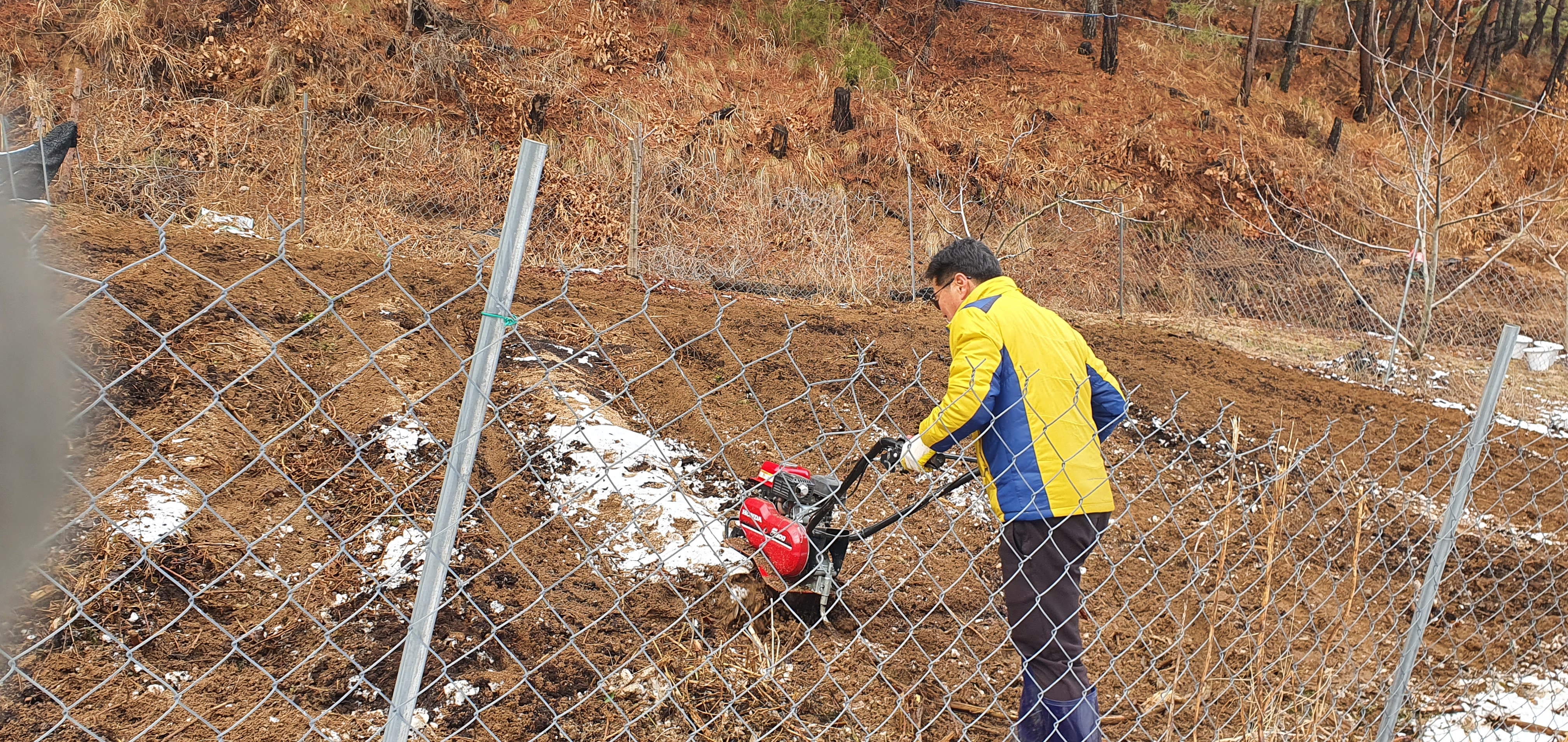 식후에 짐승들이 접근하지 못하게 울타리를 친 밭을 관리기로 흙을 갈아 엎는다.