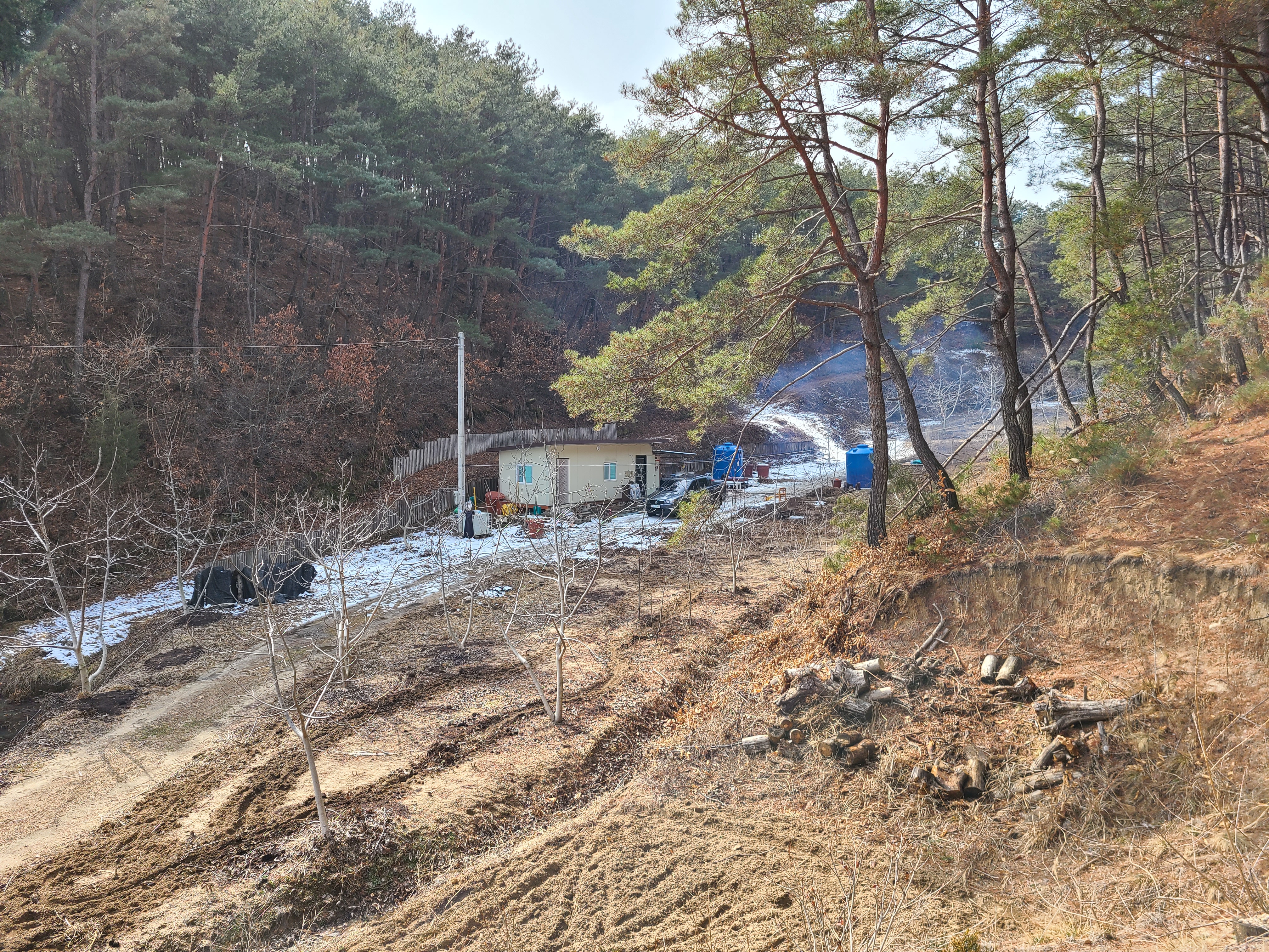 불을 피워 물부터 데우고 산소오르는 길을 나무둥치를 심어 계단으로 정리하니 땀이 난다.