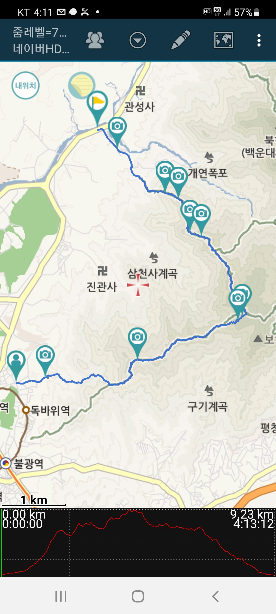 거의 휴식시간이 없이 걸어 6시간만에 불광사를 지나 불광지킴터로 내린다.