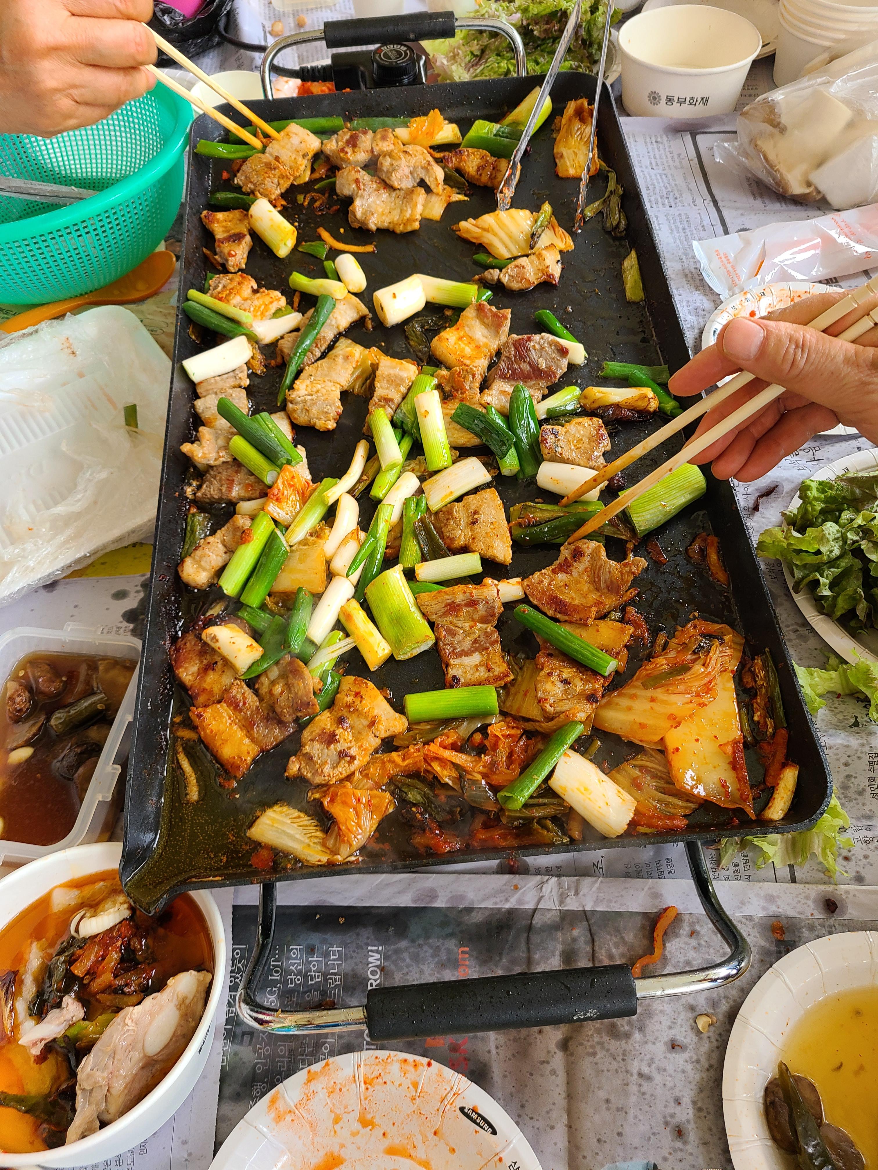 점심시간이 지났으니 큰처남댁이 준비한 삼겹살을 구워 소주한잔과 식사를 한다.