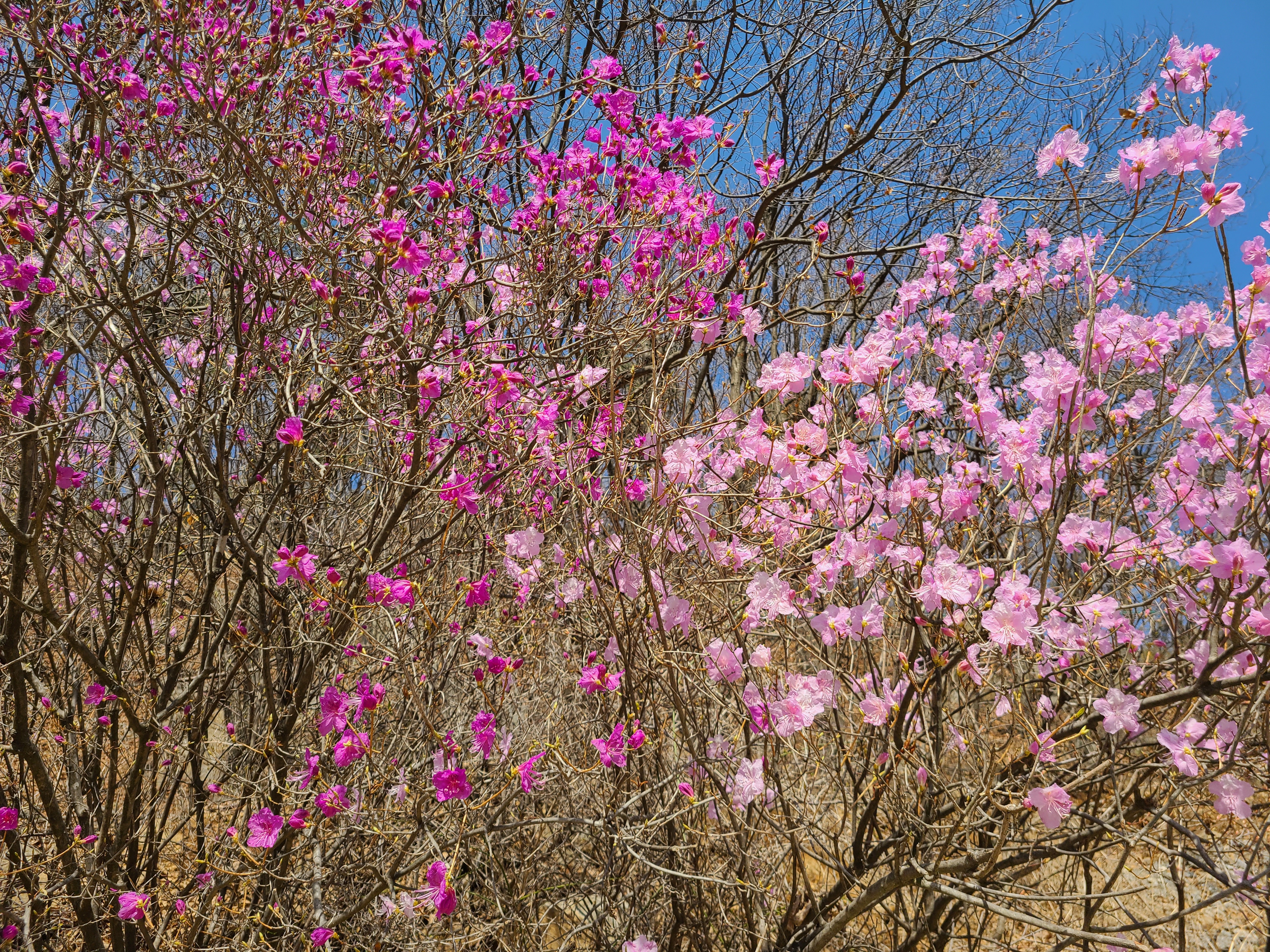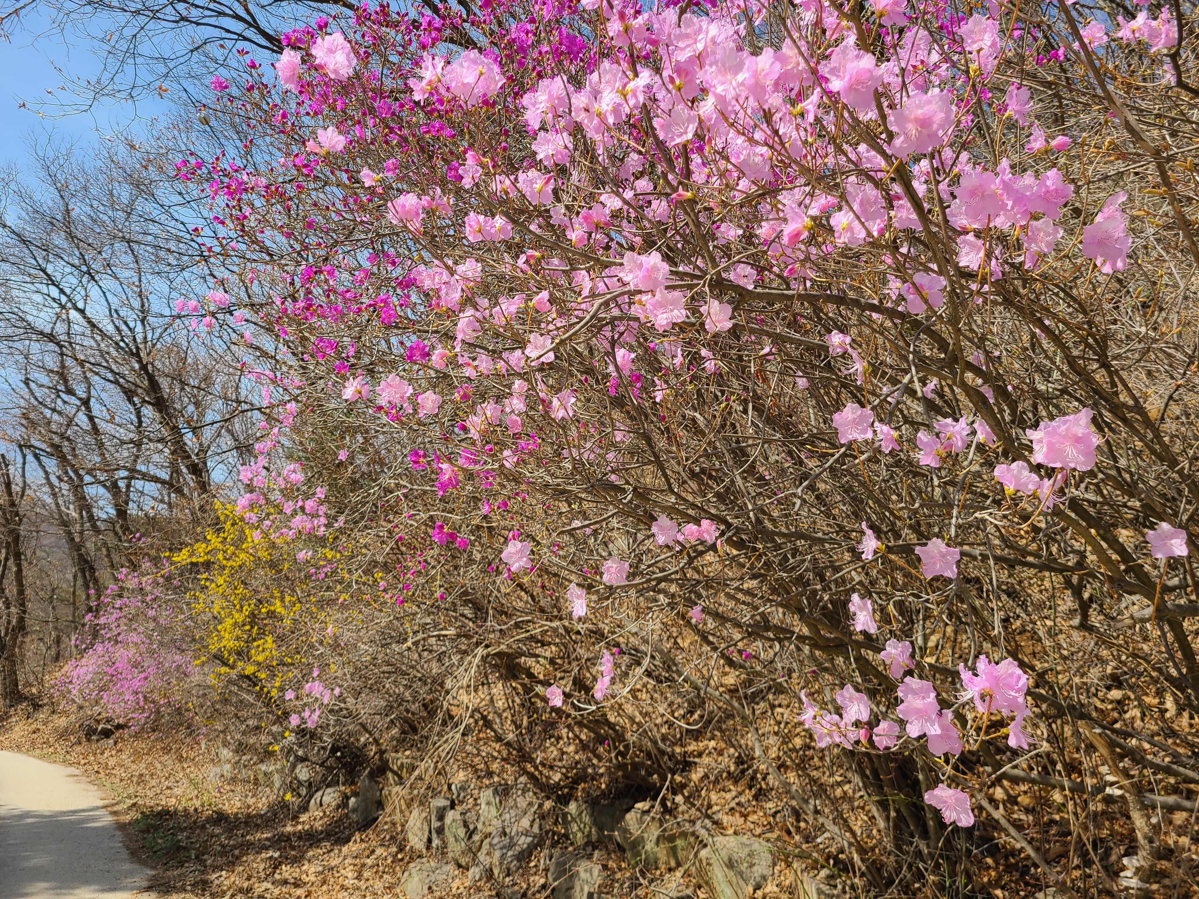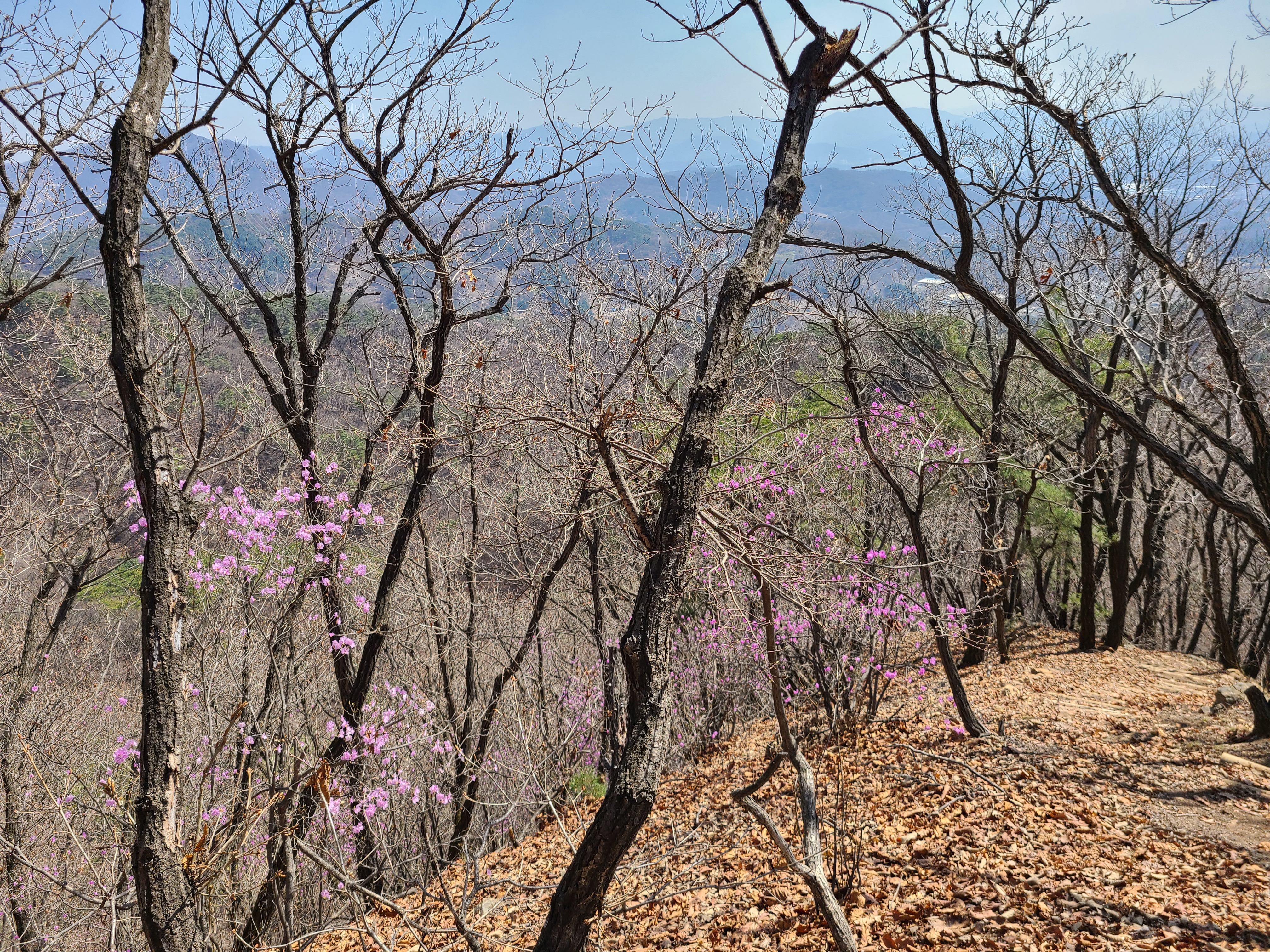 여기저기 진달래가 아름답게 피어있고 전망대에 서니 올라온 길이 뒤편에 아스라히보인다.