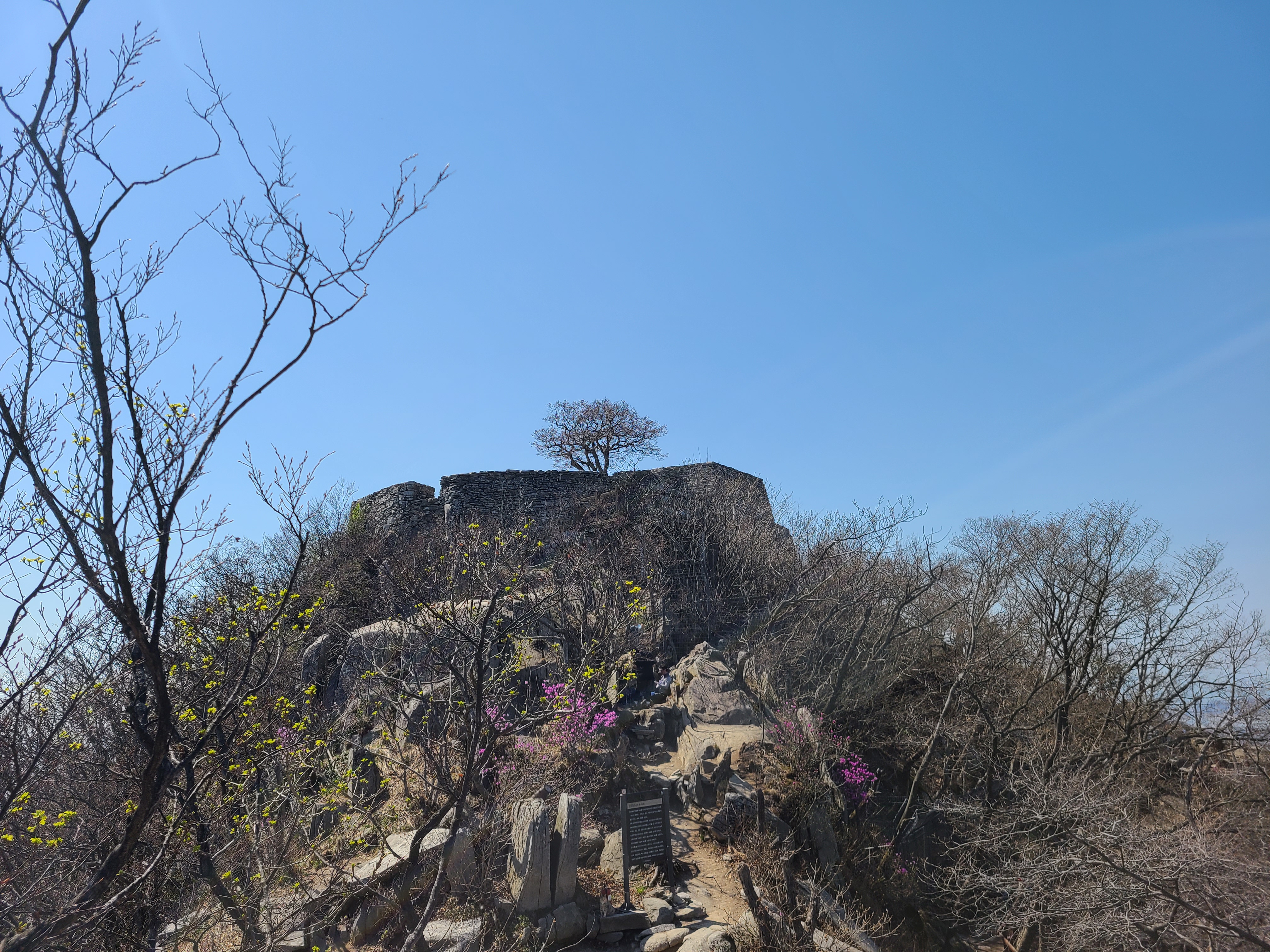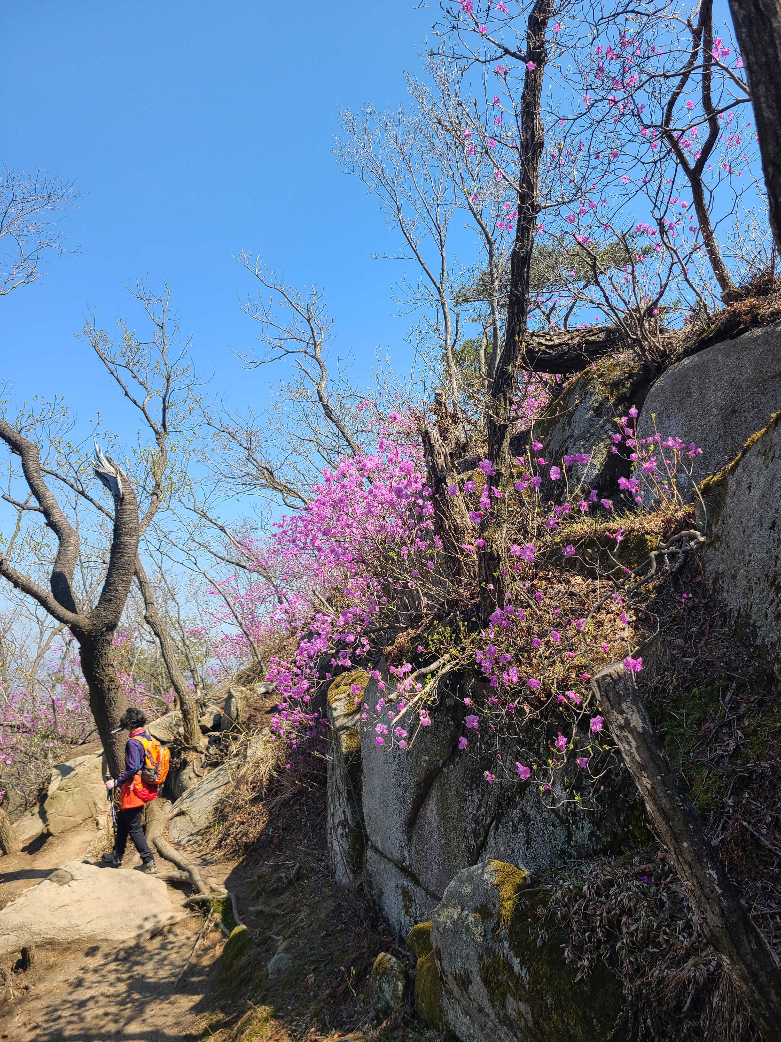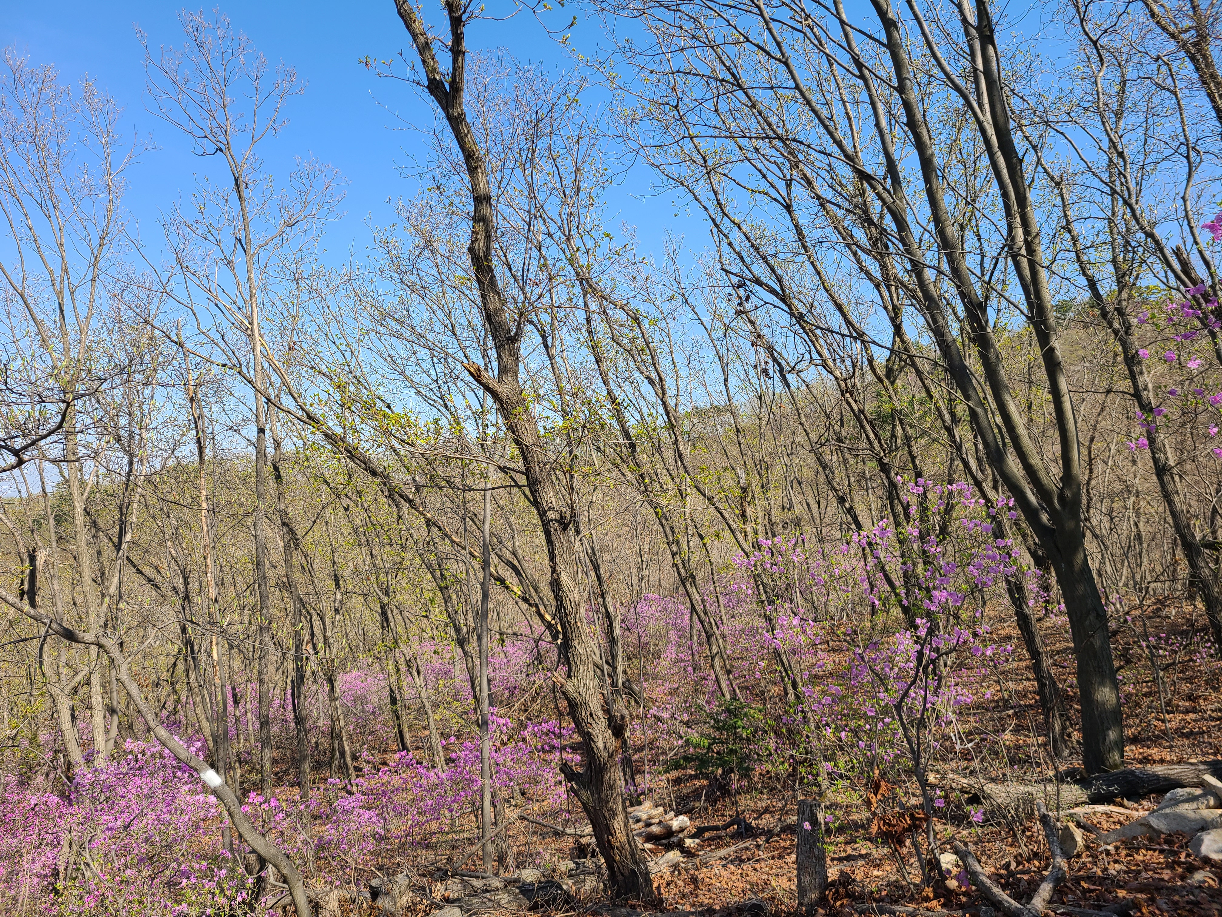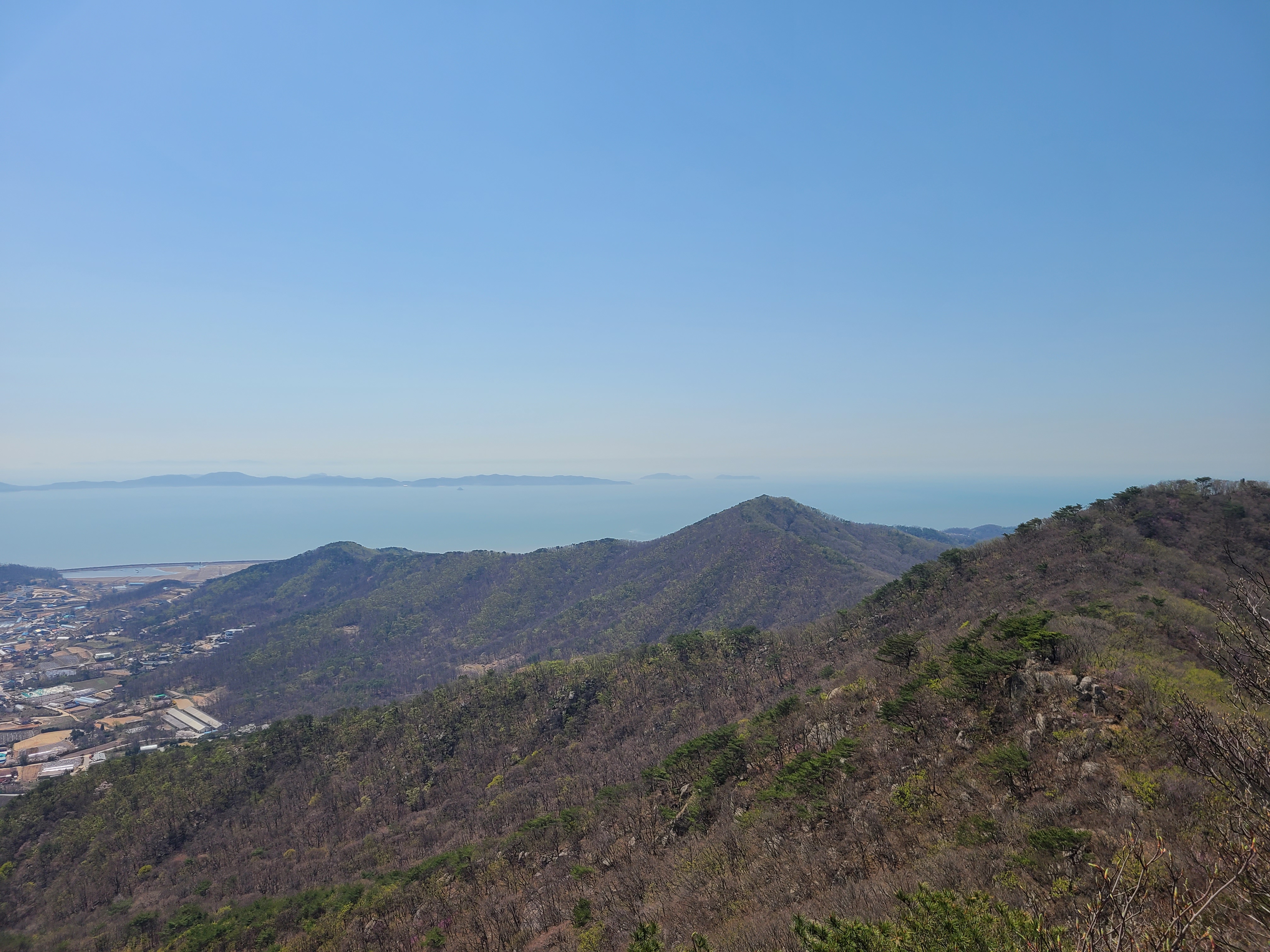 능선을 오르니 서해바다가 눈아래이고 진달래꽃이 여기저기 피어있고 나무들은 푸르러 간다.