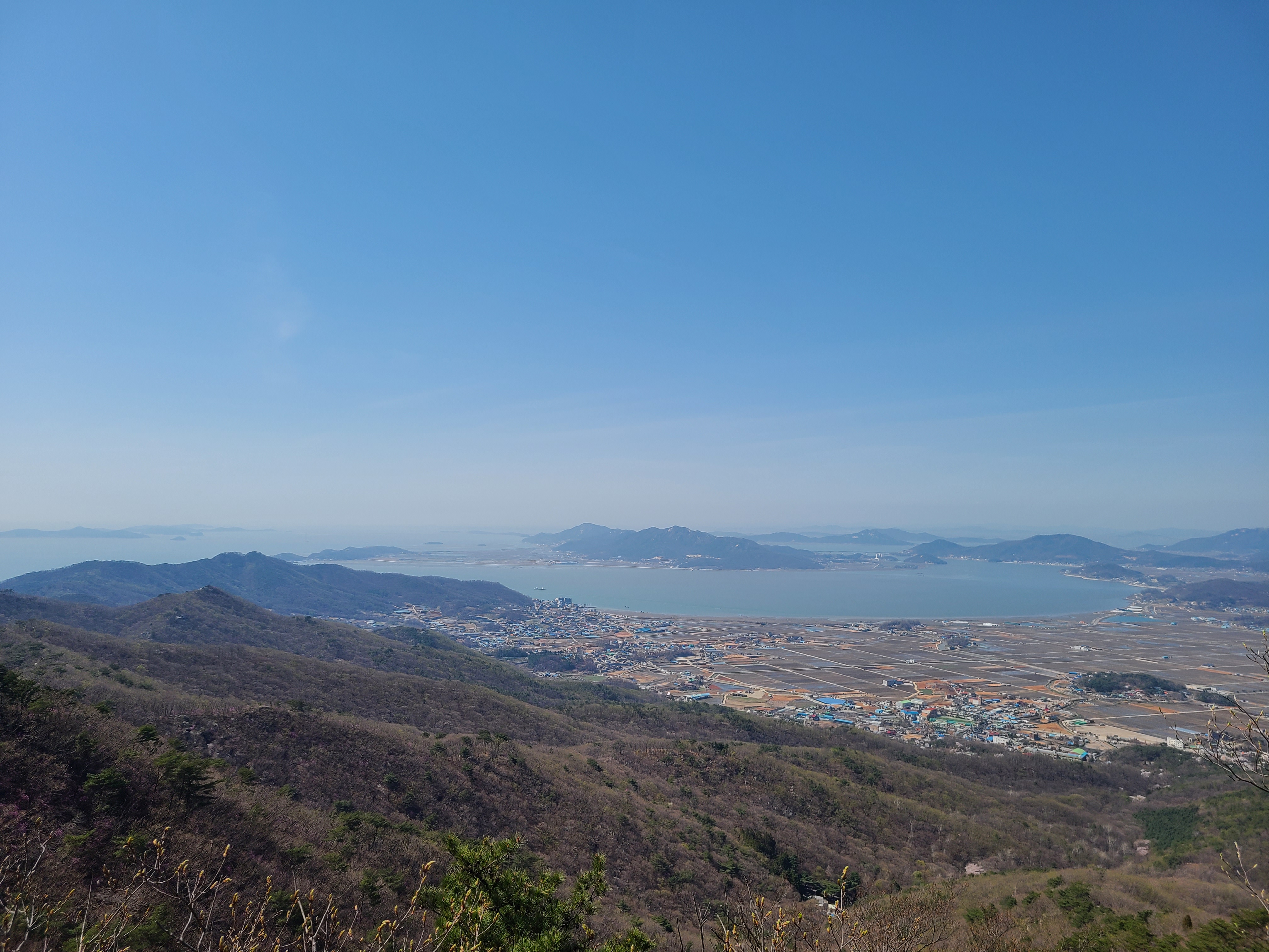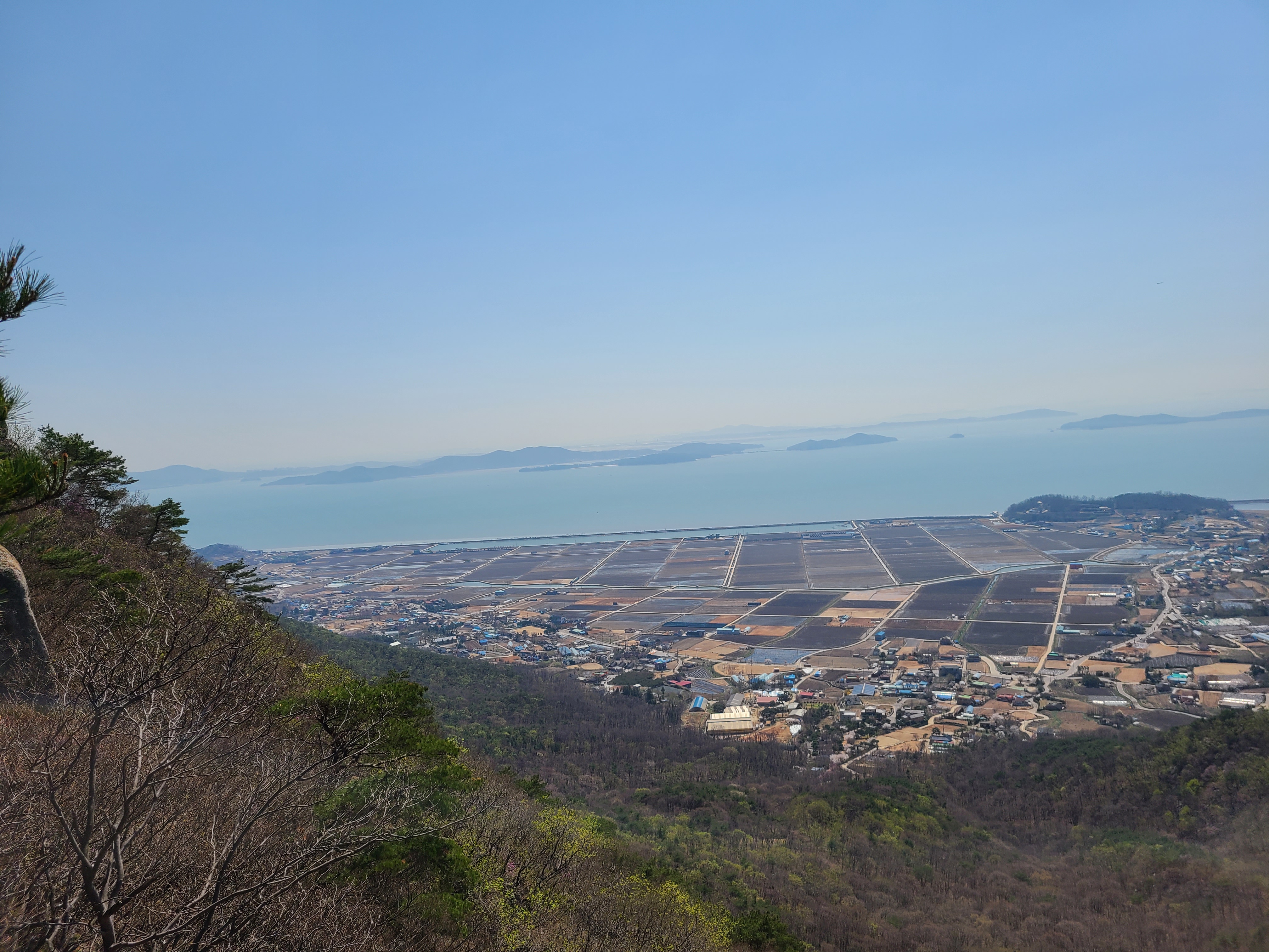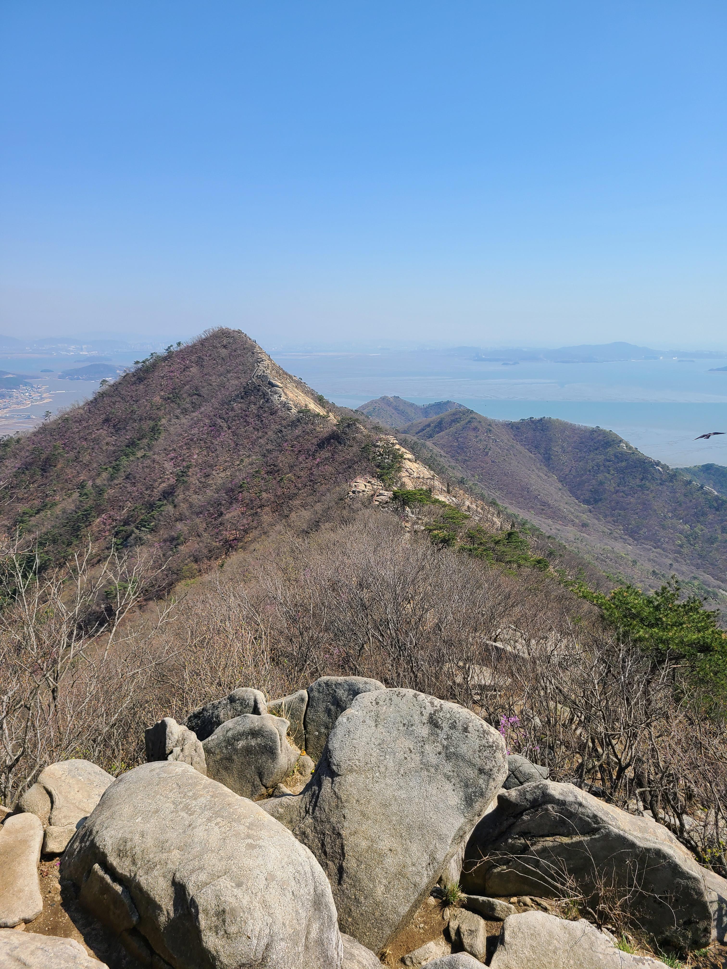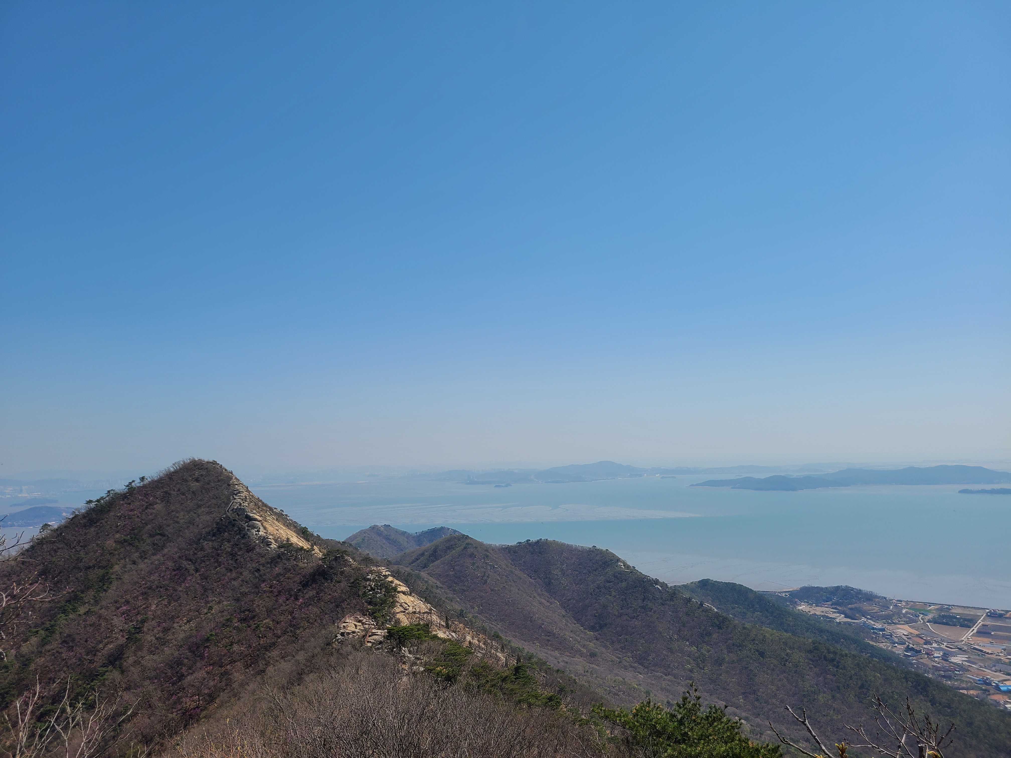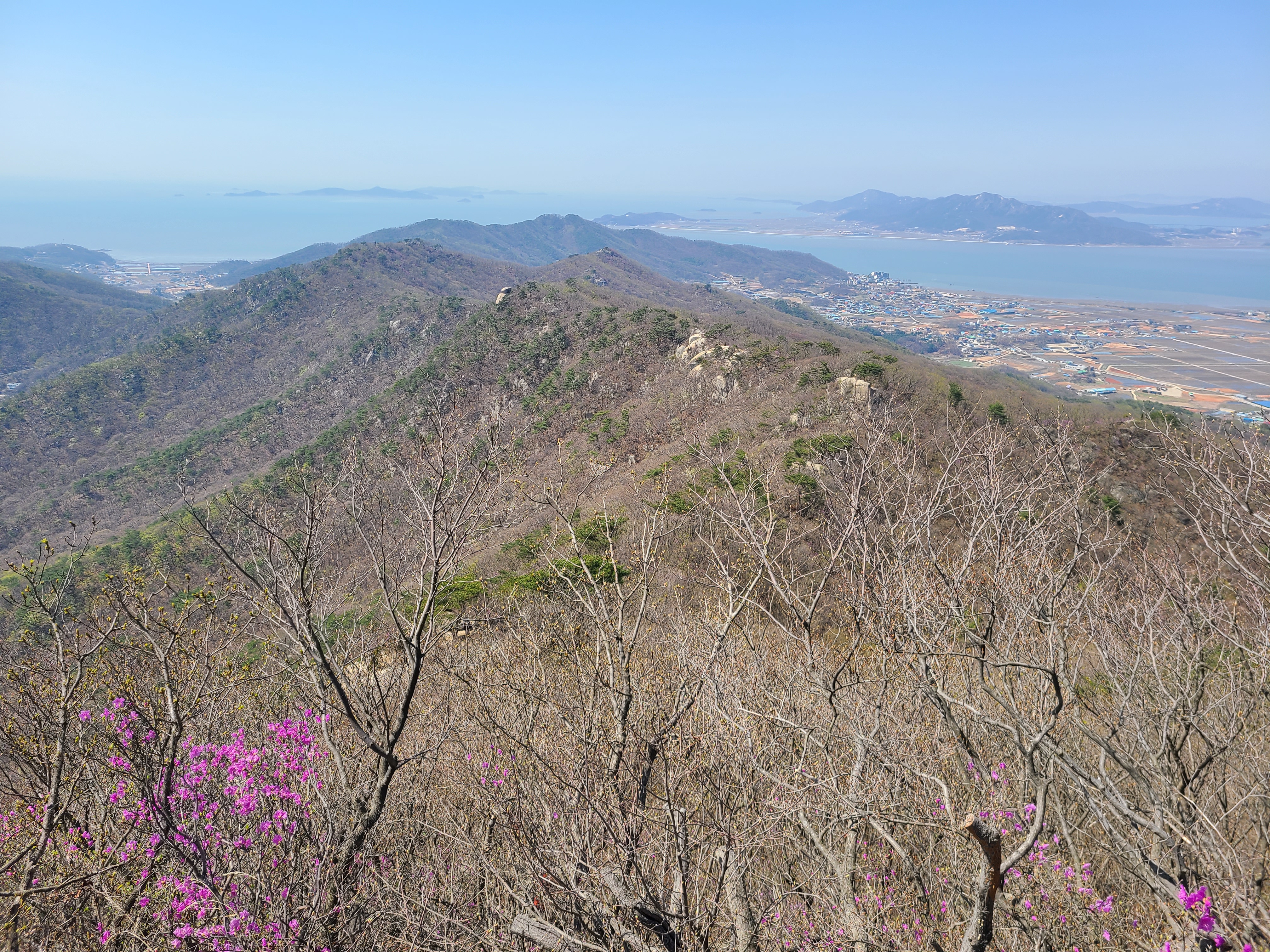 능선을 오르니 서해바다가 눈아래이고 진달래꽃이 여기저기 피어있고 나무들은 푸르러 간다.