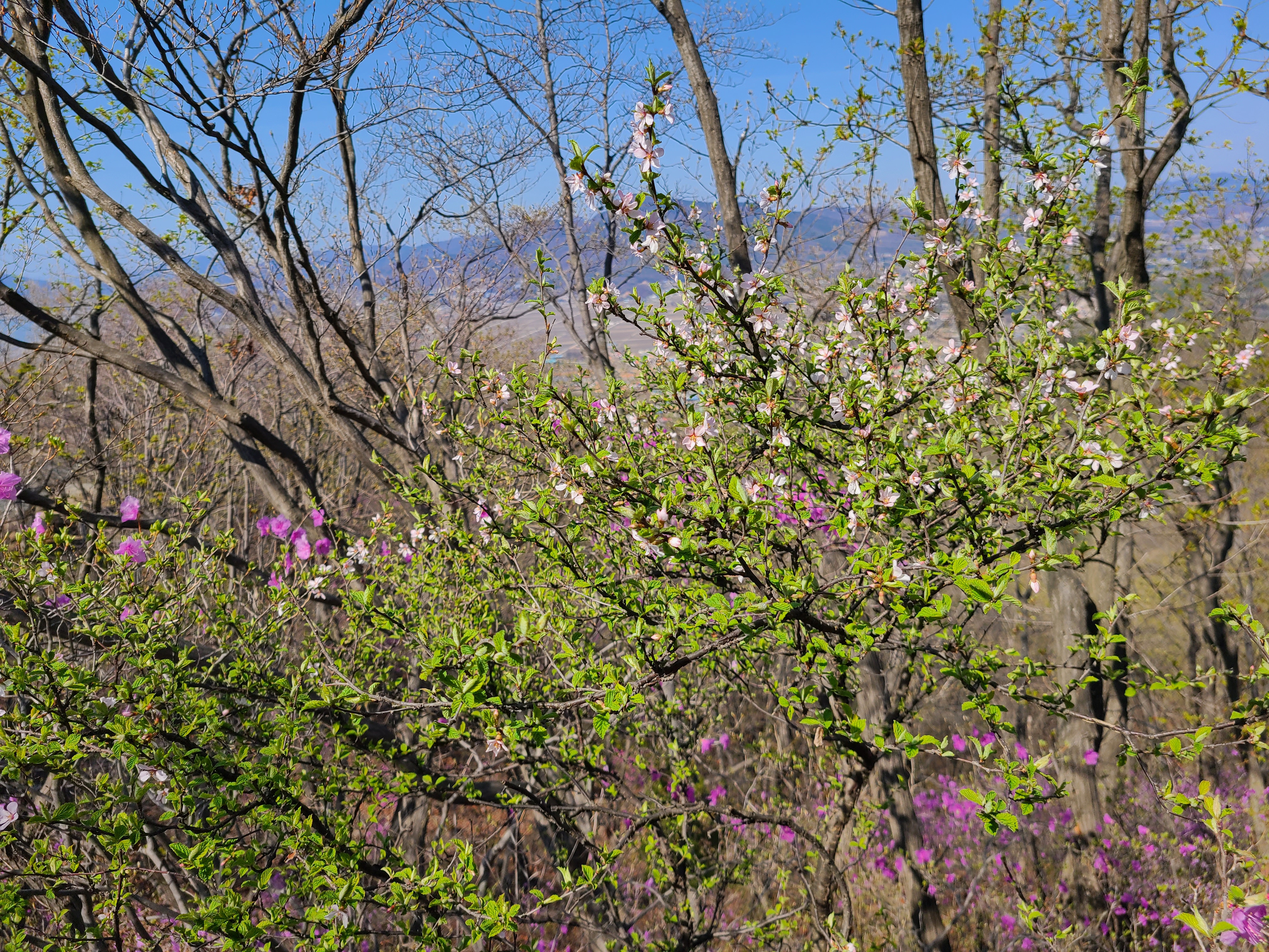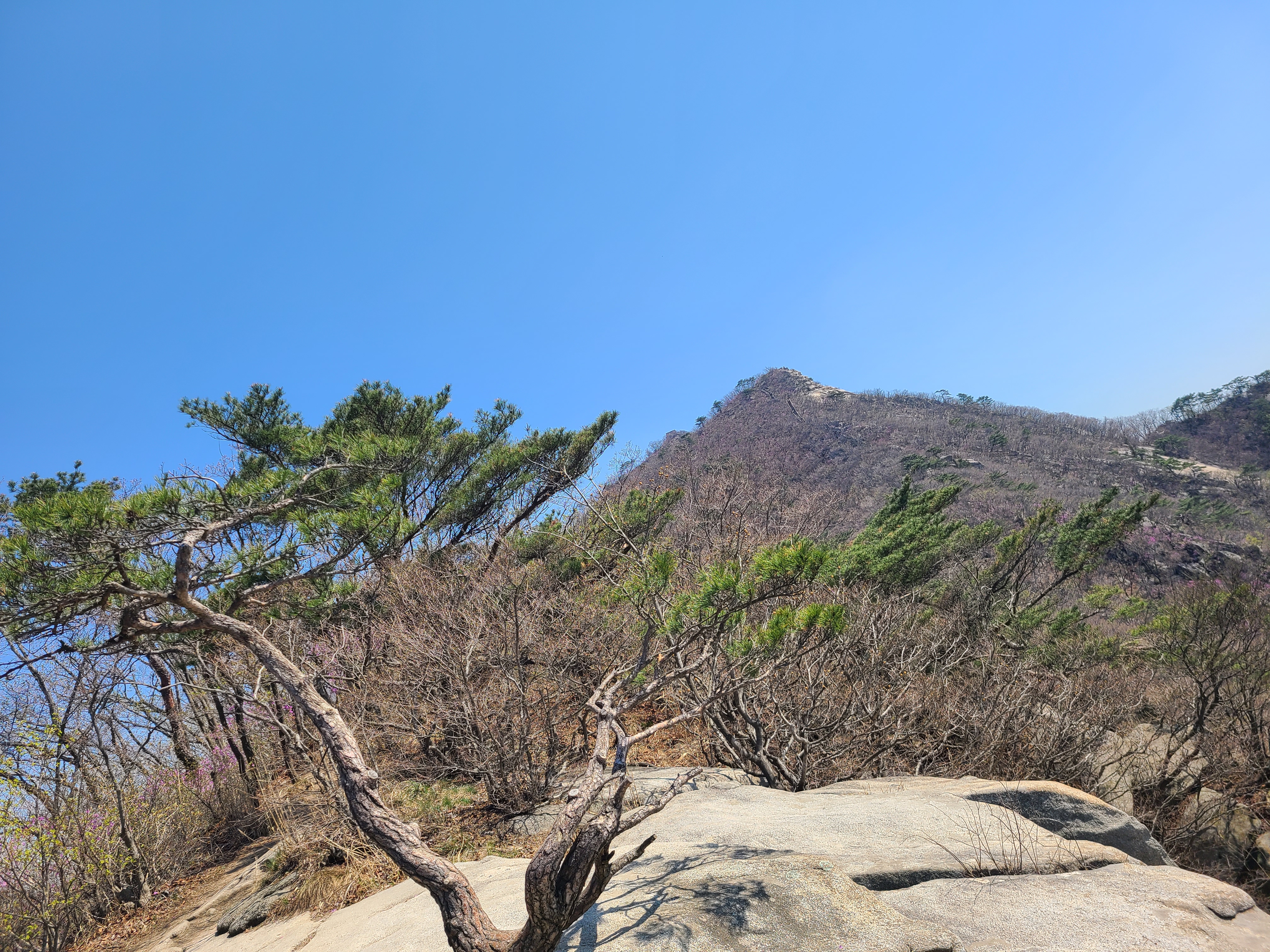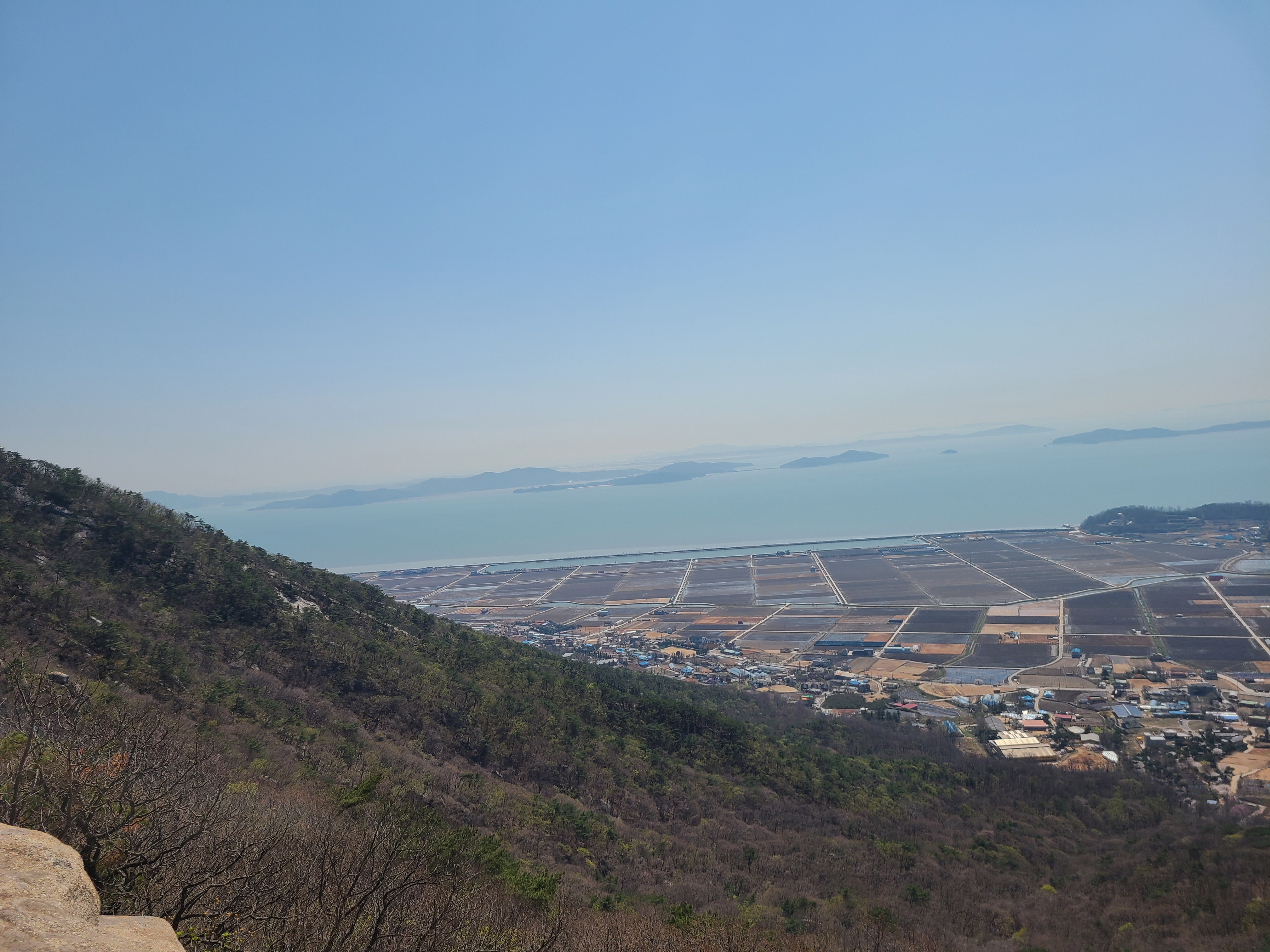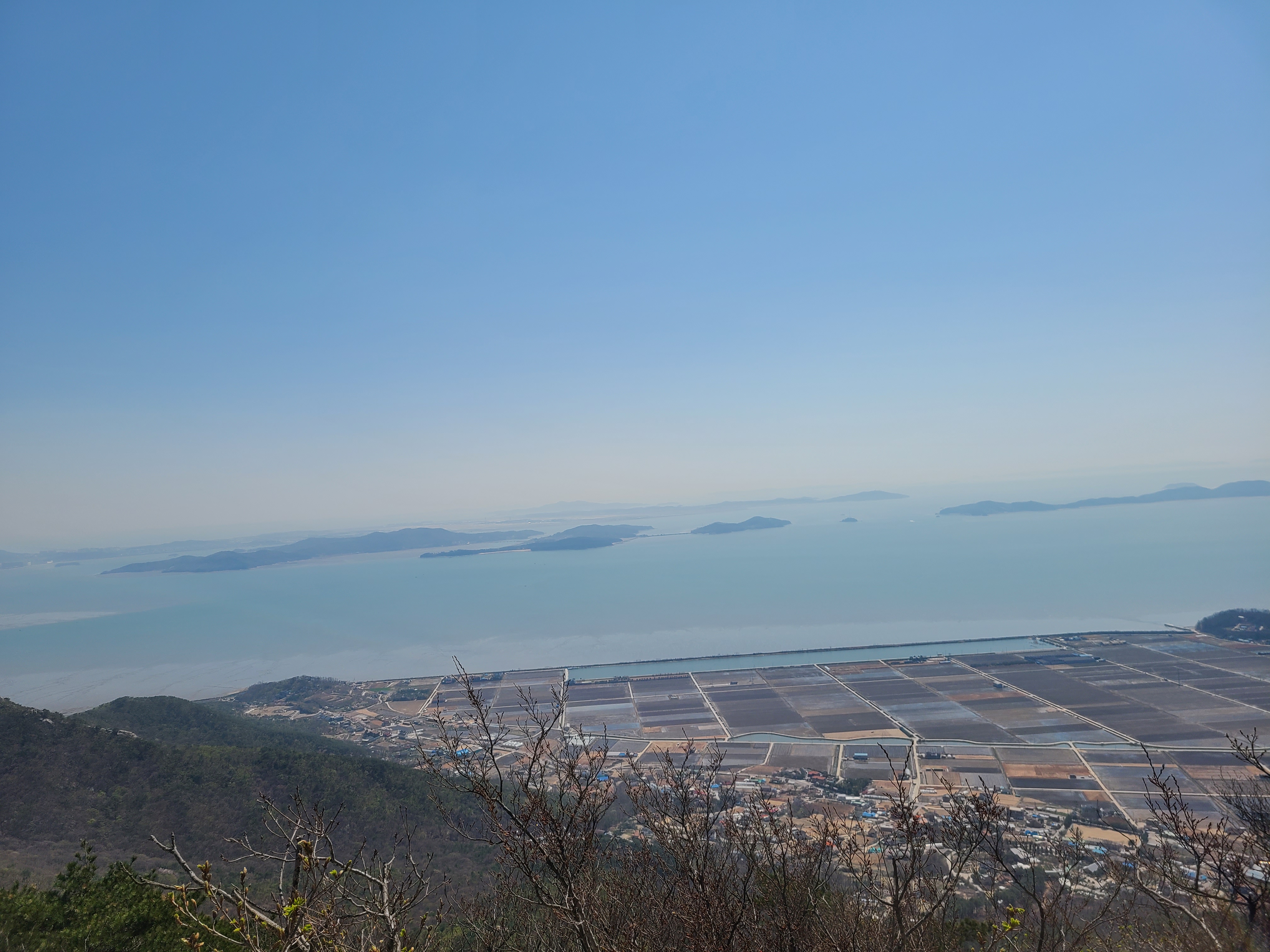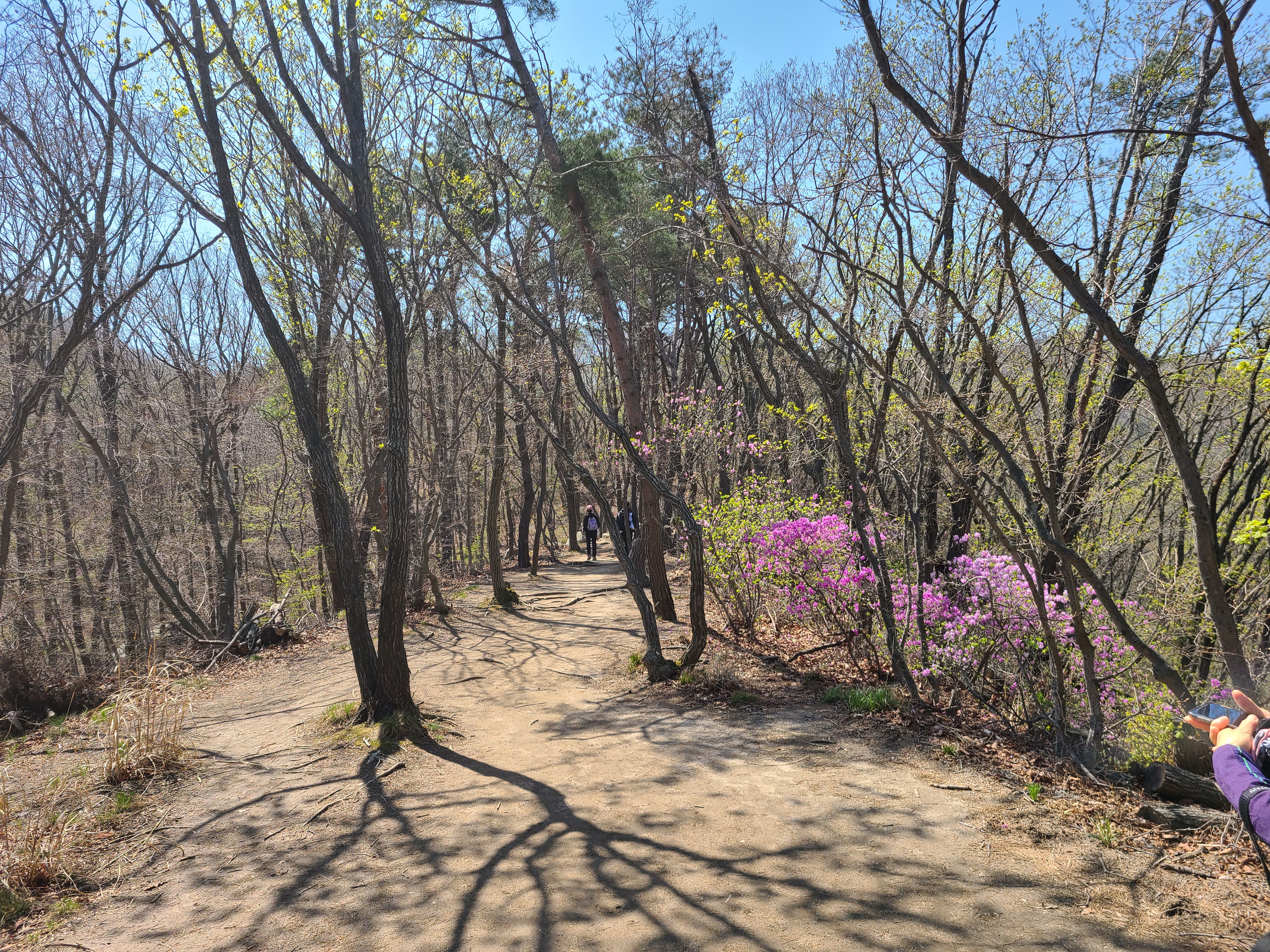 능선을 오르니 서해바다가 눈아래이고 진달래꽃이 여기저기 피어있고 나무들은 푸르러 간다.