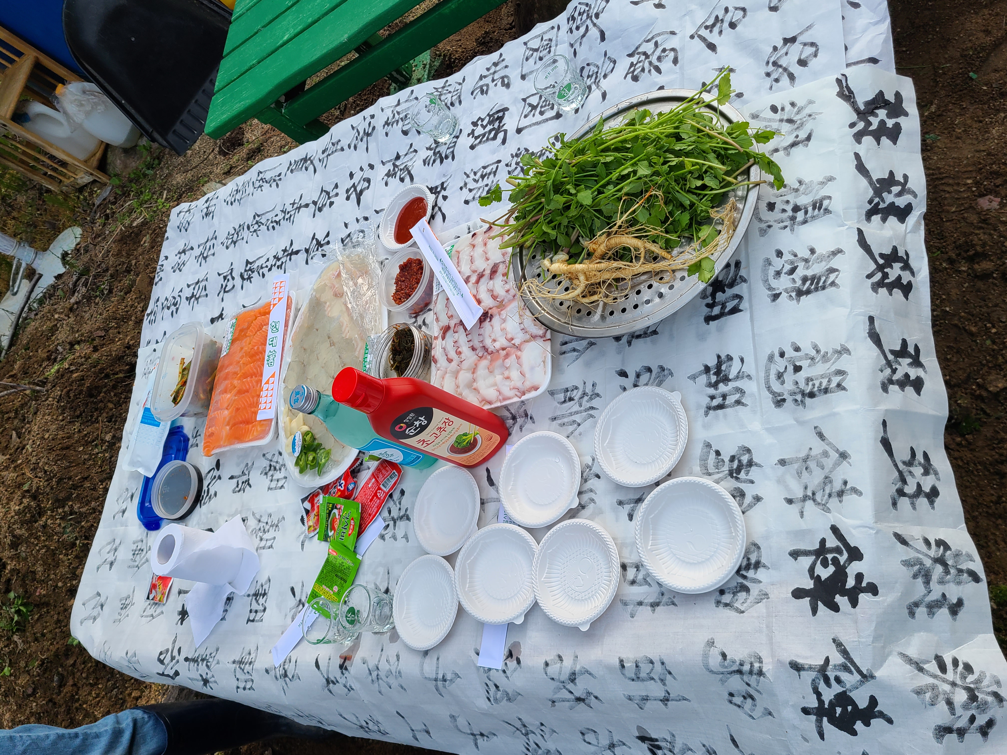 너무많은 땀을 흘리고 이미 해가 서산에 기우니 작업을 종료하고 가져갔던 캠프파이어 통에 불을