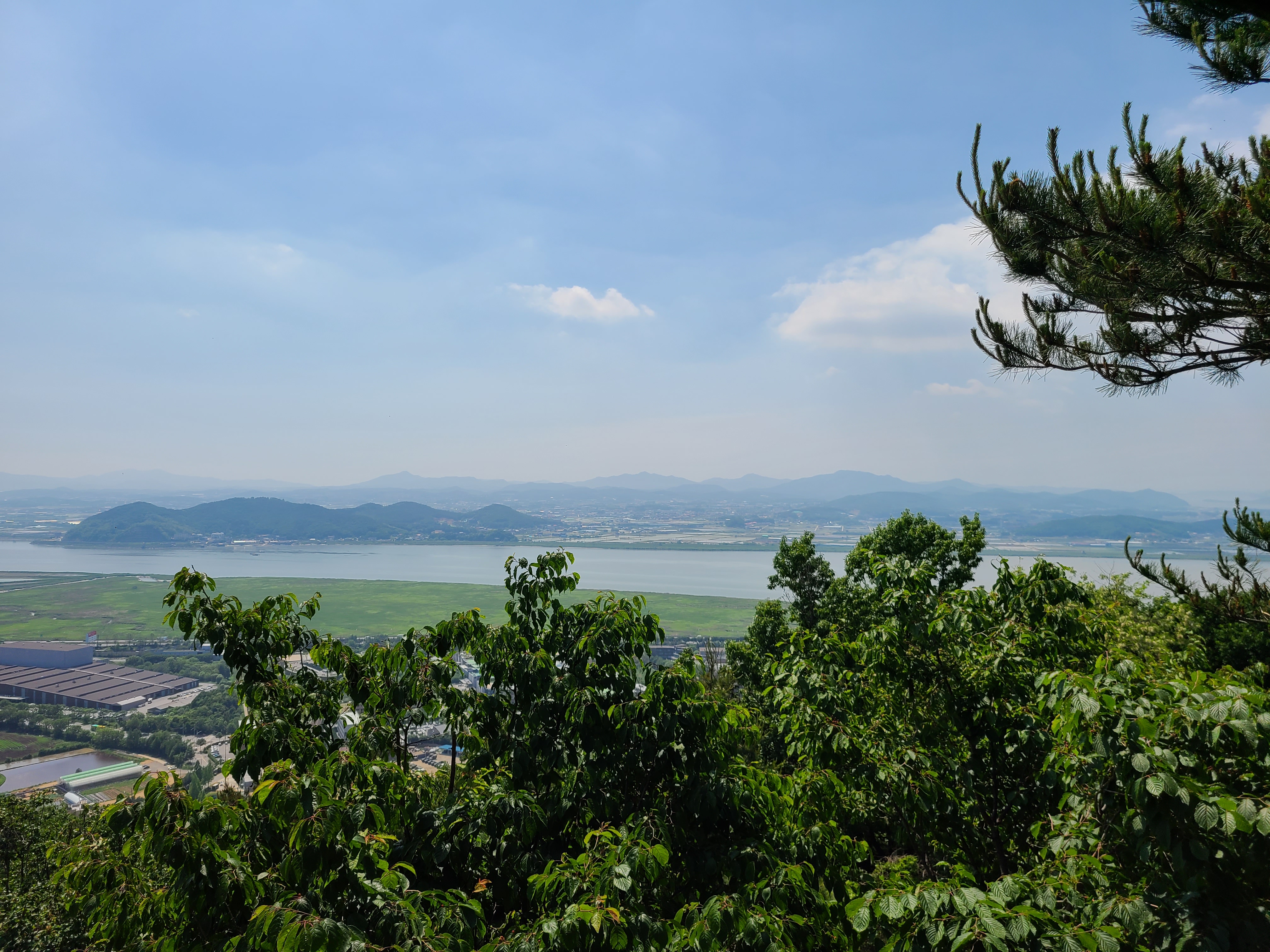 한강과 김포,통일전망대와 멀리 개풍이 바라보이고 반대편은 파주 운정지구의 아파트촌이 내려보인다.