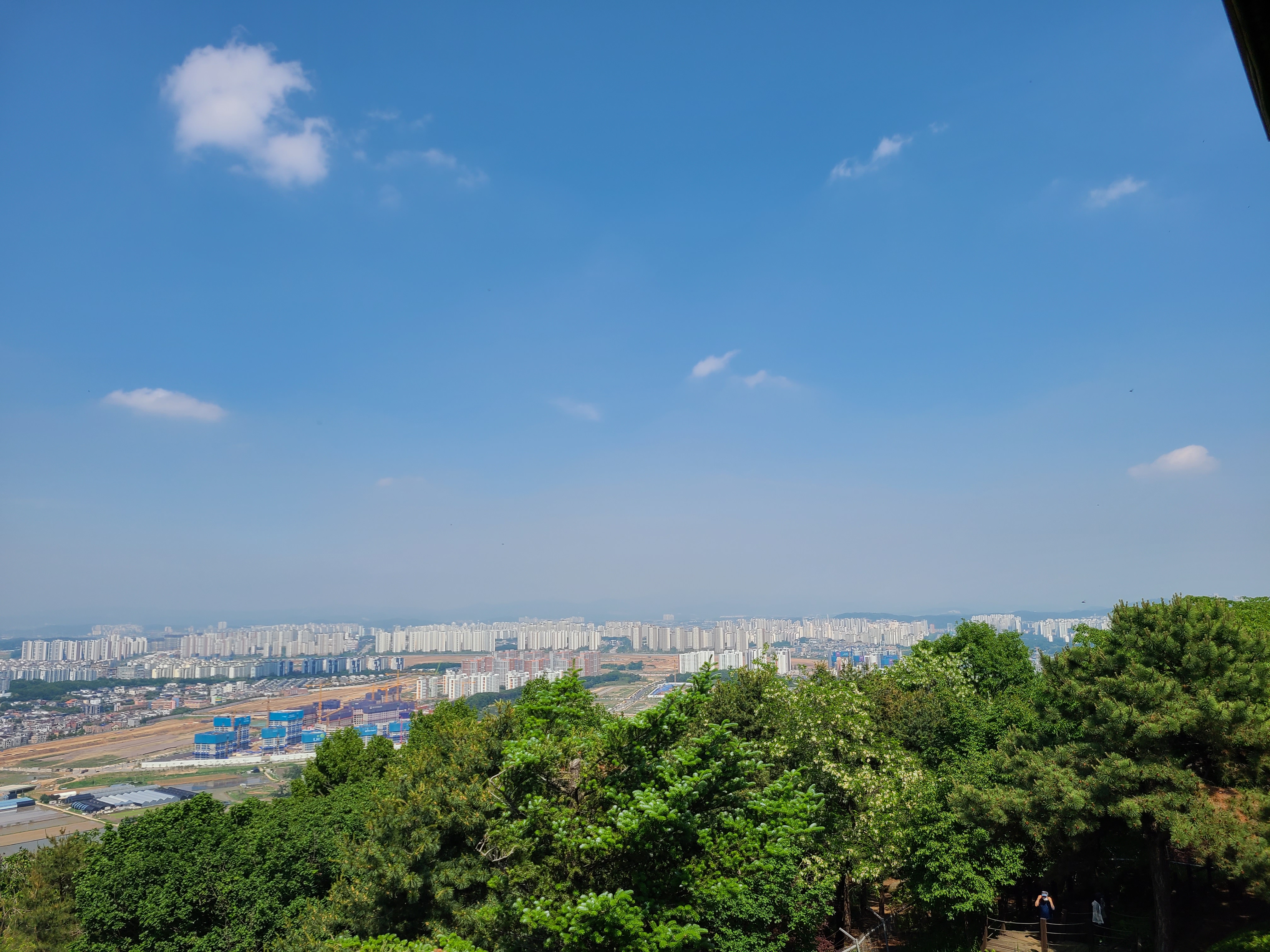 한강과 김포,통일전망대와 멀리 개풍이 바라보이고 반대편은 파주 운정지구의 아파트촌이 내려보인다.