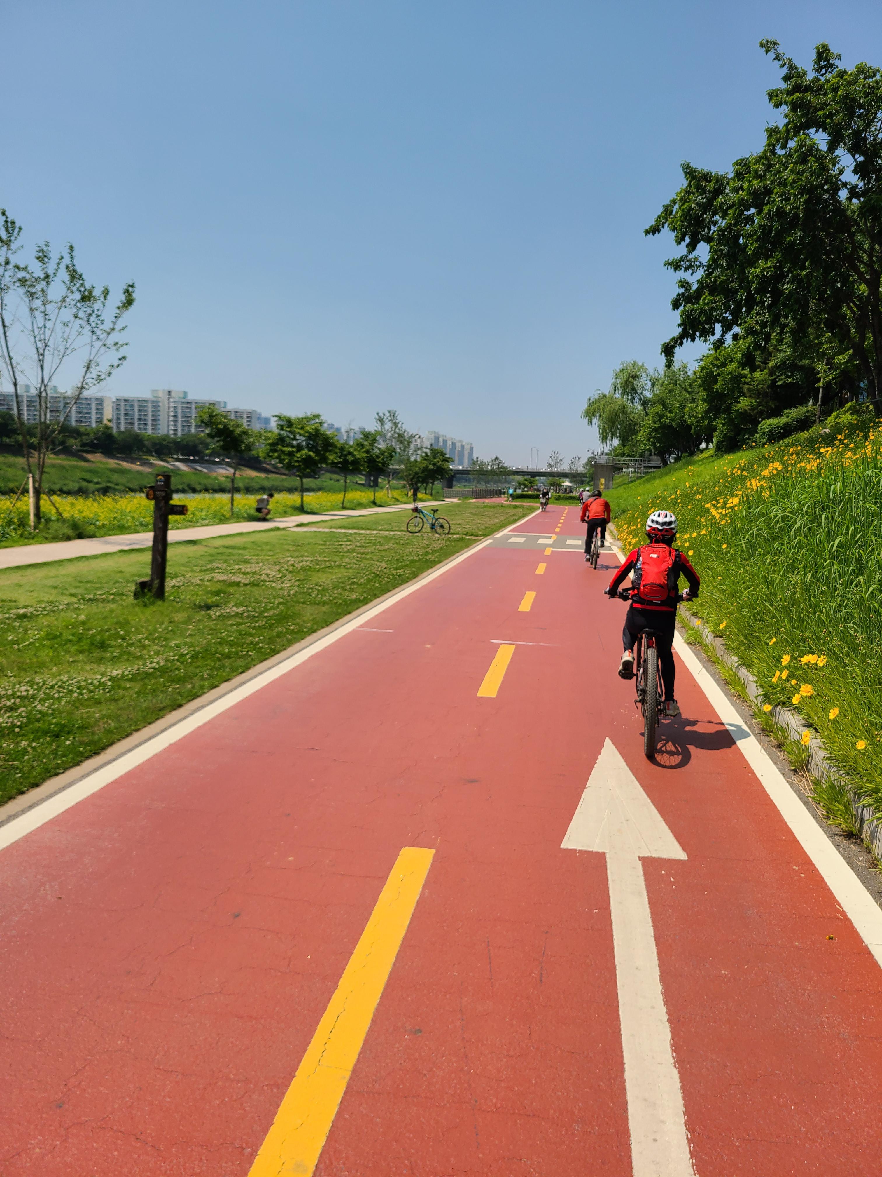 많은 라이딩객이 달리고있고 가끔은 위험한 경우로 있다.