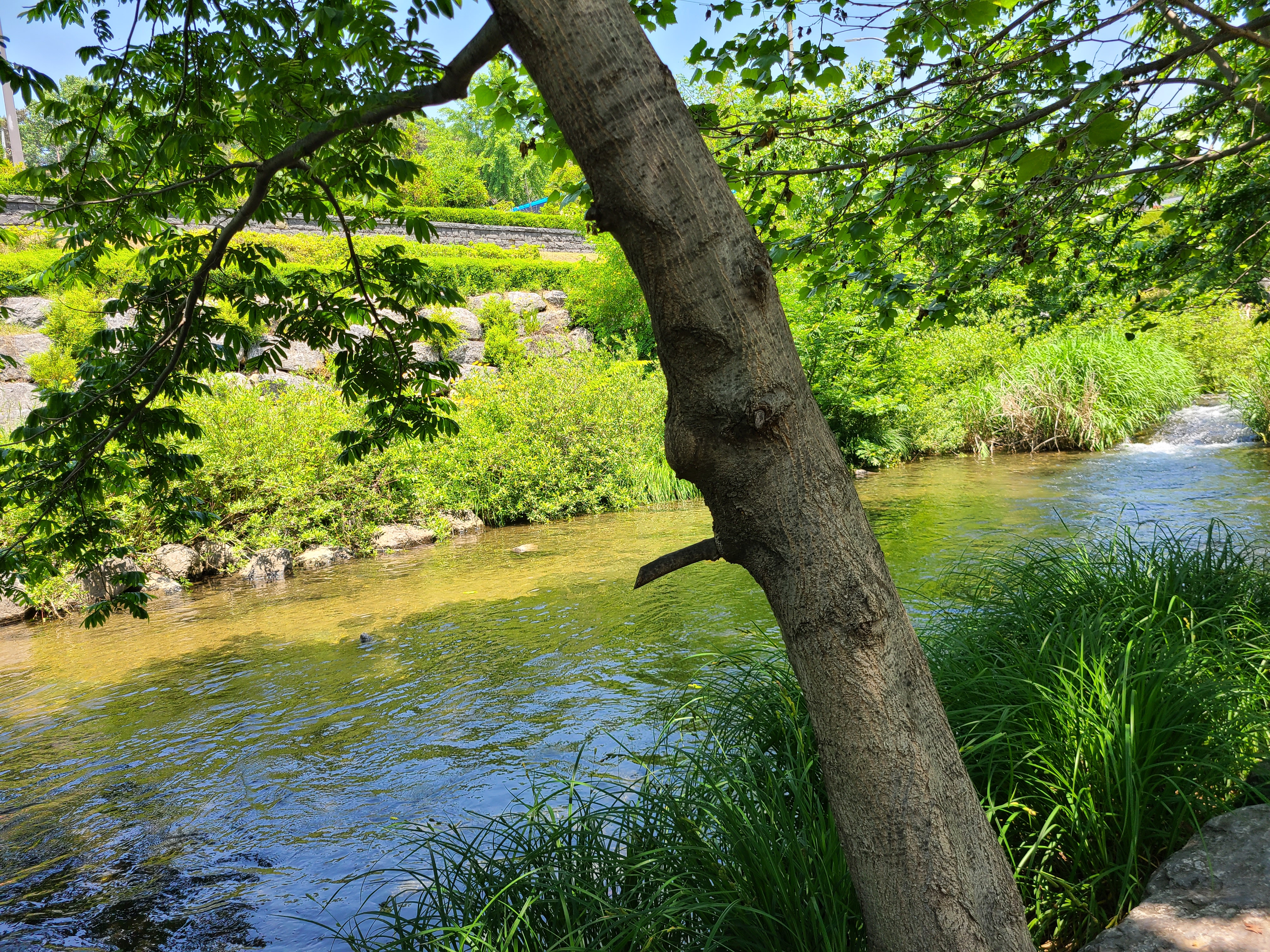 유원지는 무척이나 복잡하여 공원을 포기하고 삼성산에서 흘러오는 천변 그늘에 앉는다.