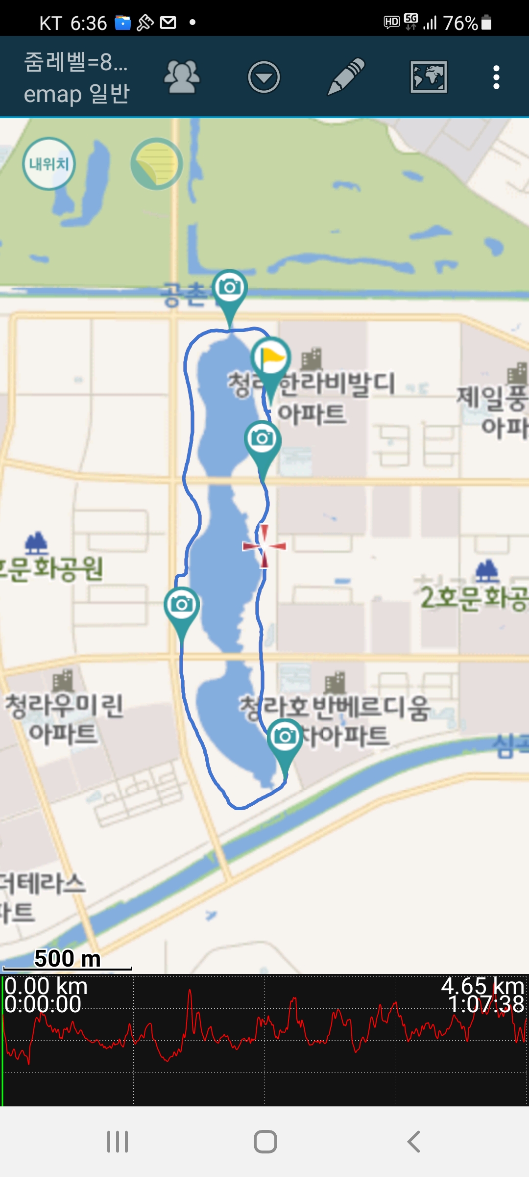 호수를 한바퀴 돌아오니 4.65km에 한시간남짓 걸렸다.