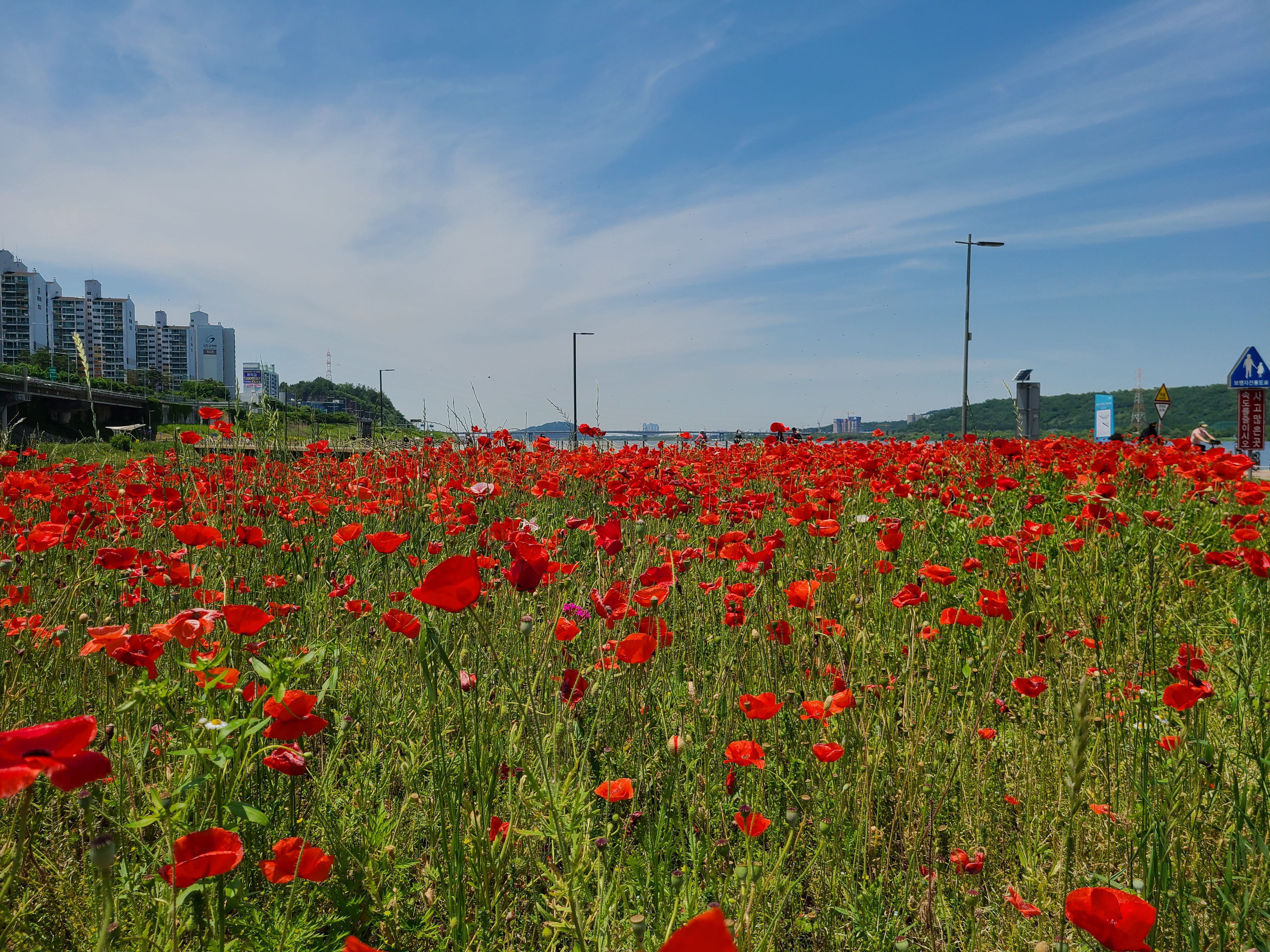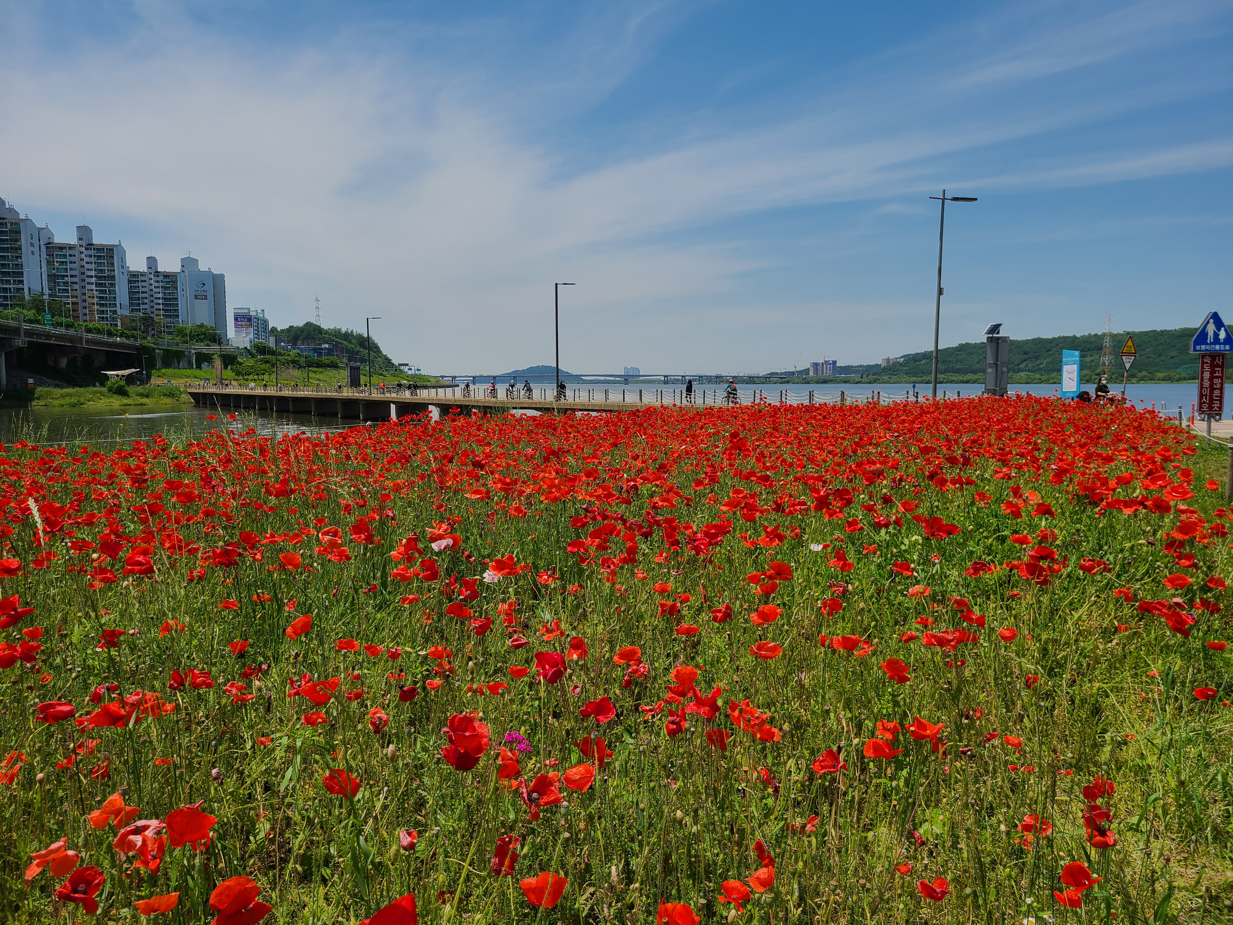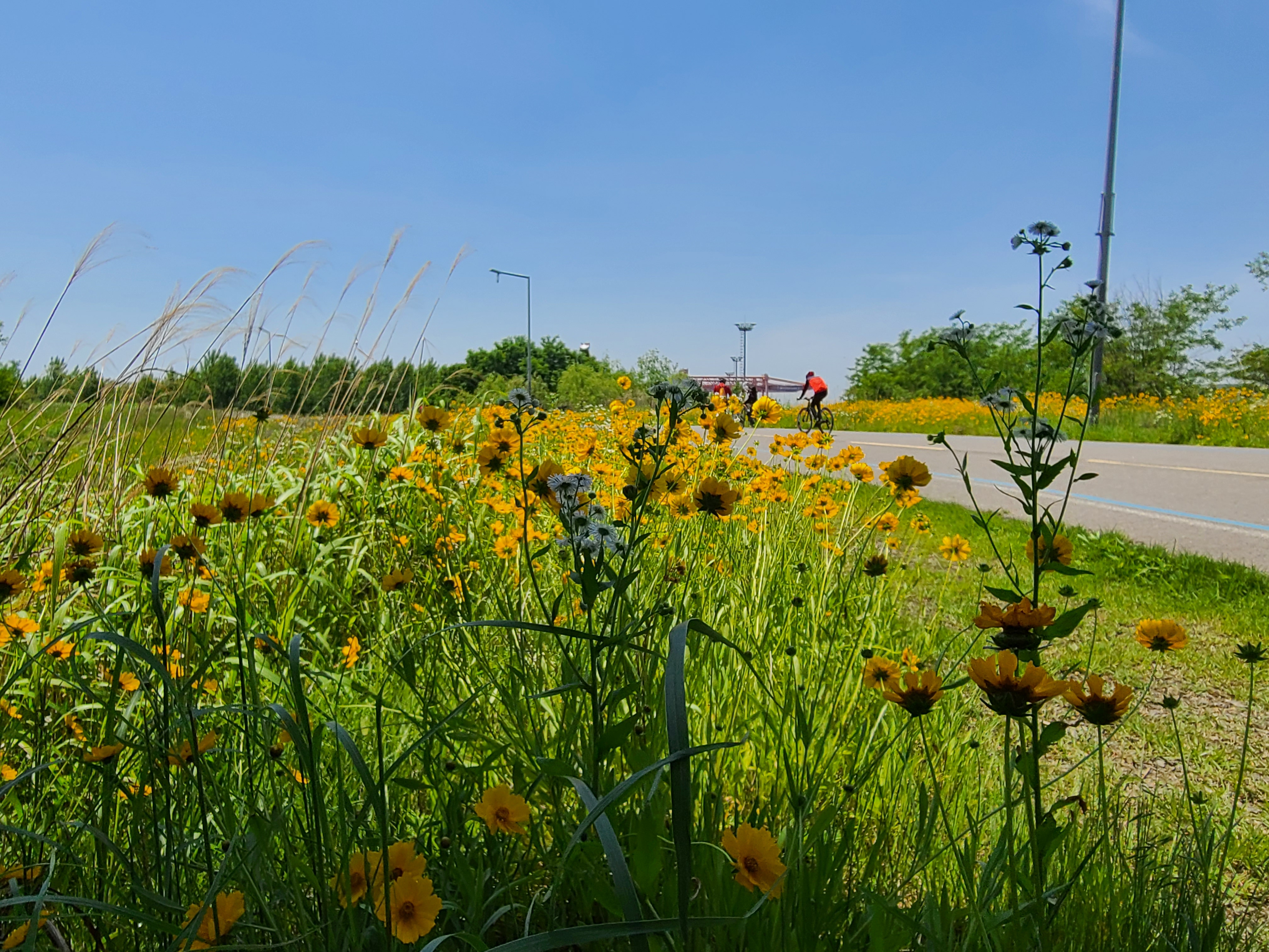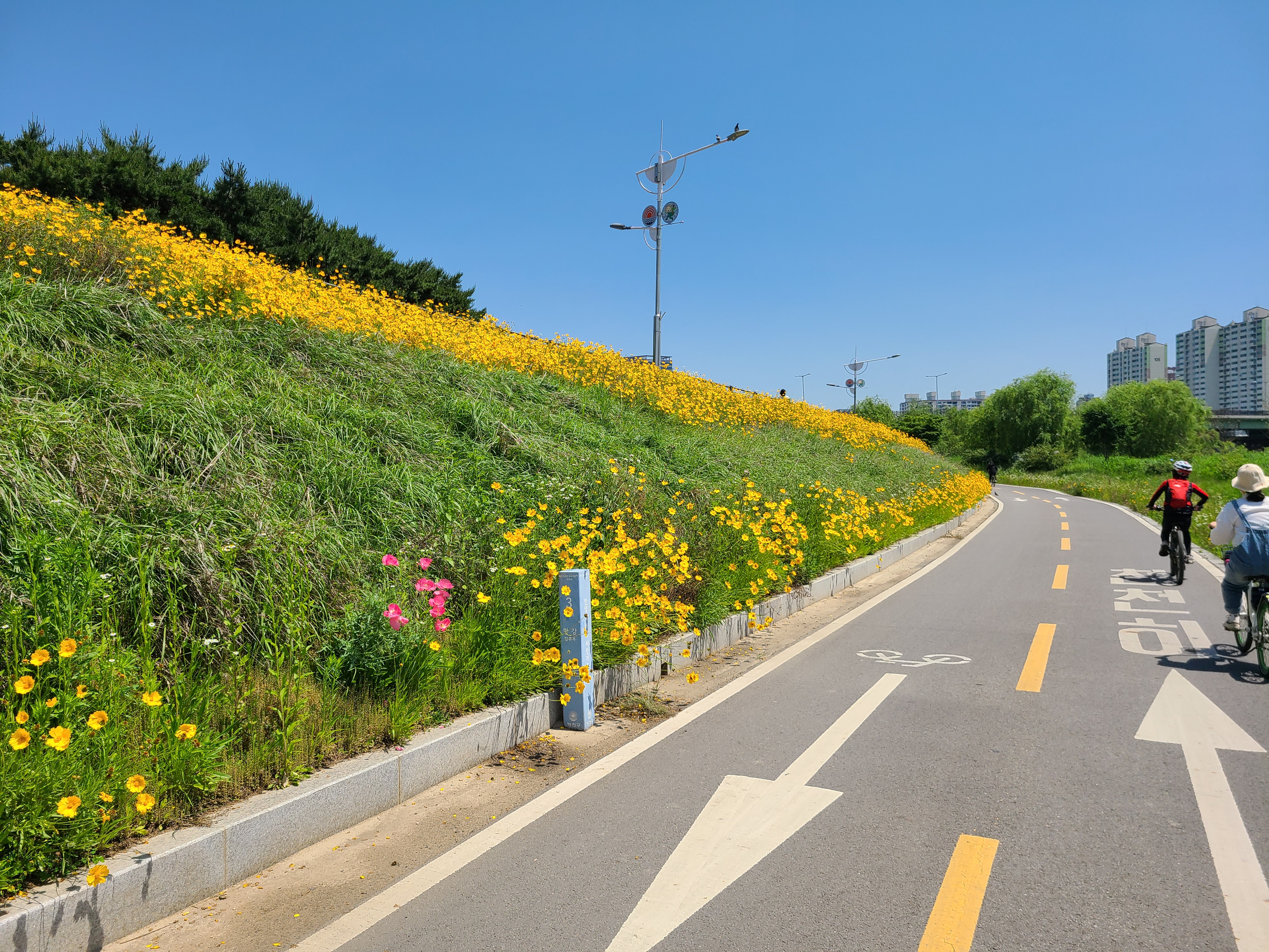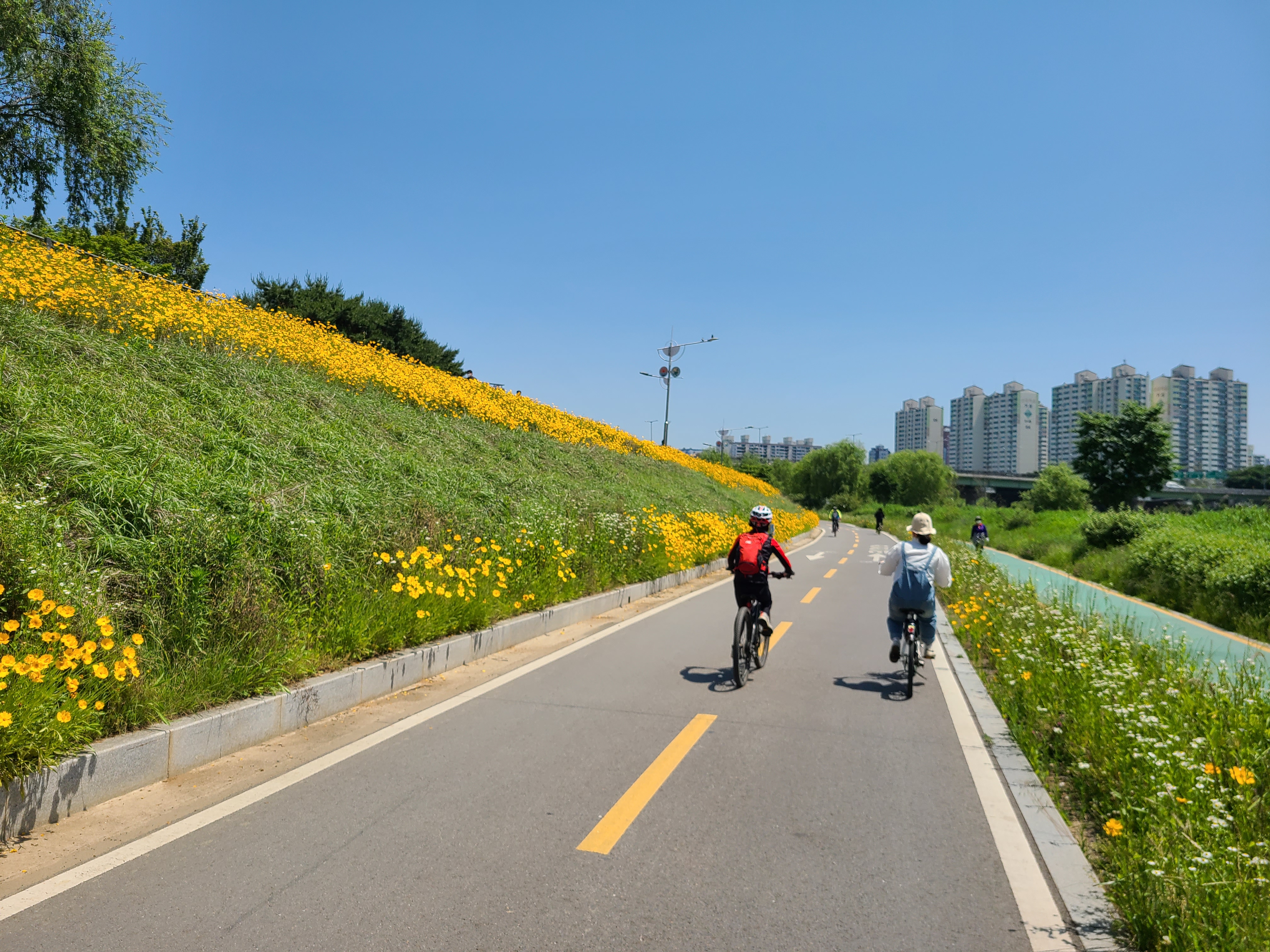 금계국이 뚝방양쪽에 무리지어 피어나고 곳곳을 아름답게 조성하여 한강공원,안양천변 공원이