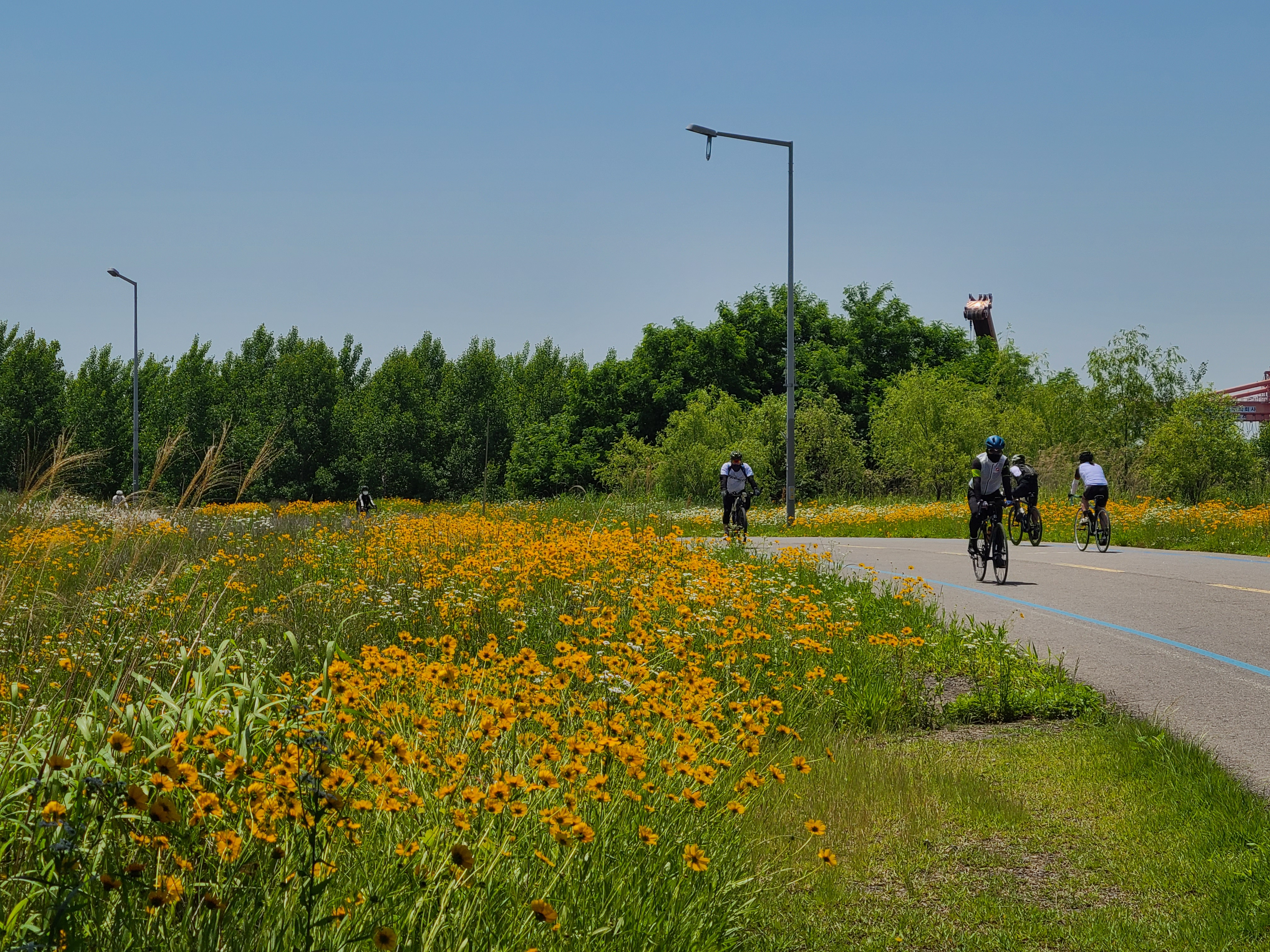 금계국이 뚝방양쪽에 무리지어 피어나고 곳곳을 아름답게 조성하여 한강공원,안양천변 공원이