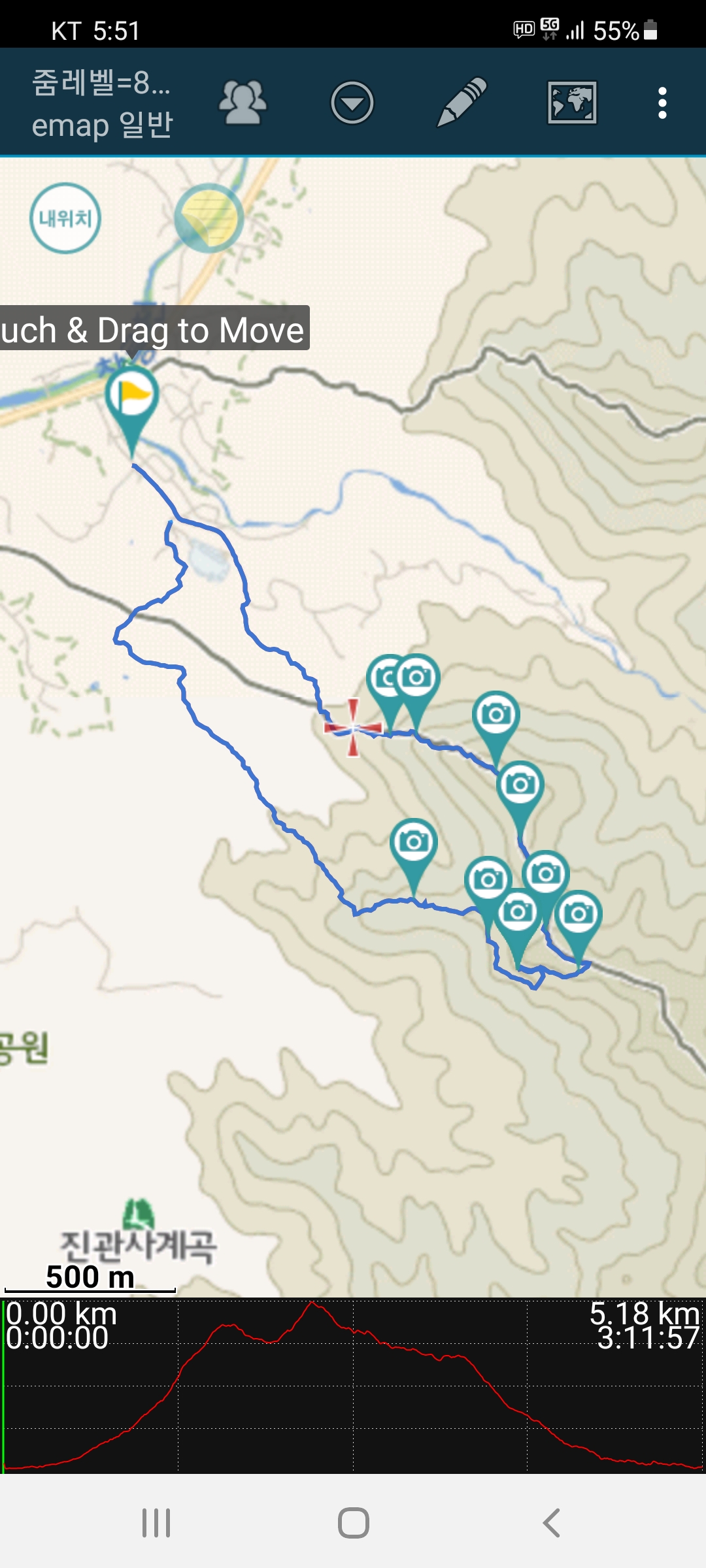 여섯시간반의 산행시간중 실제 움직인 시간은 3시간남짓이고 나머지는 휴식등으로 보냈다.