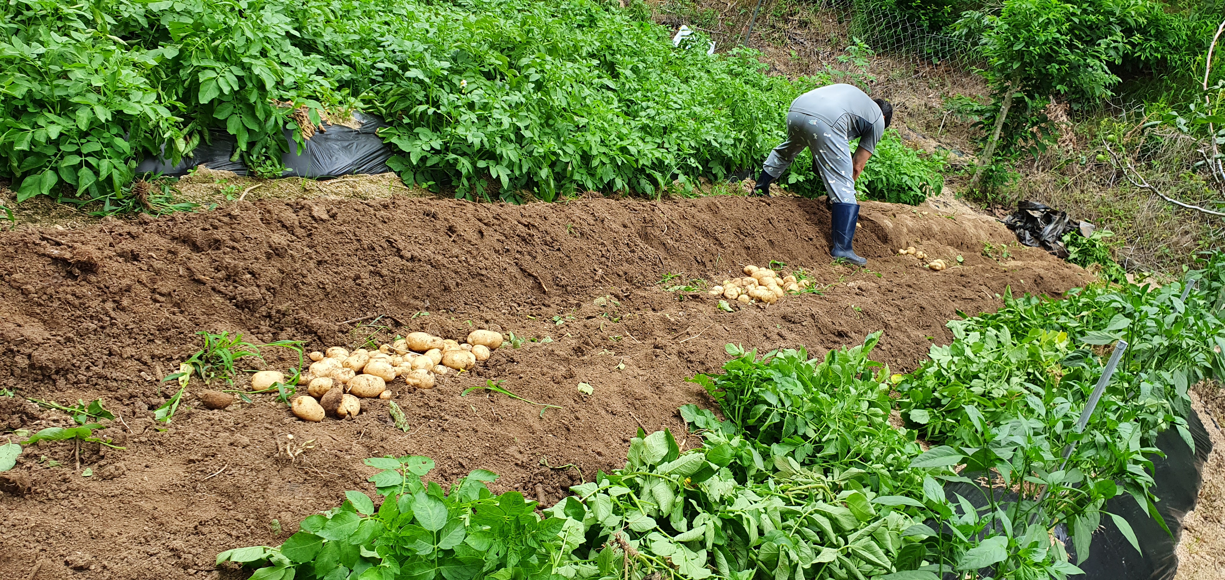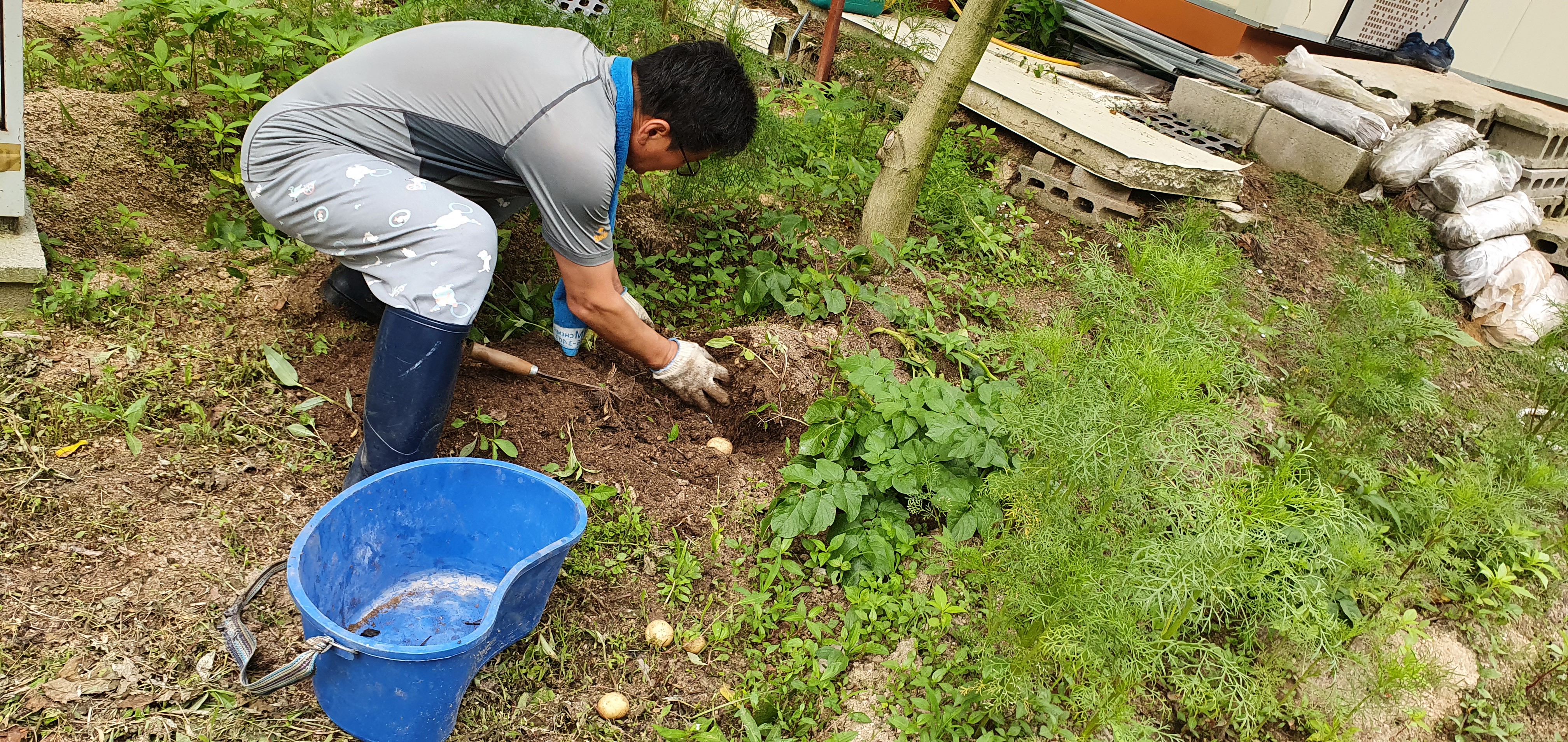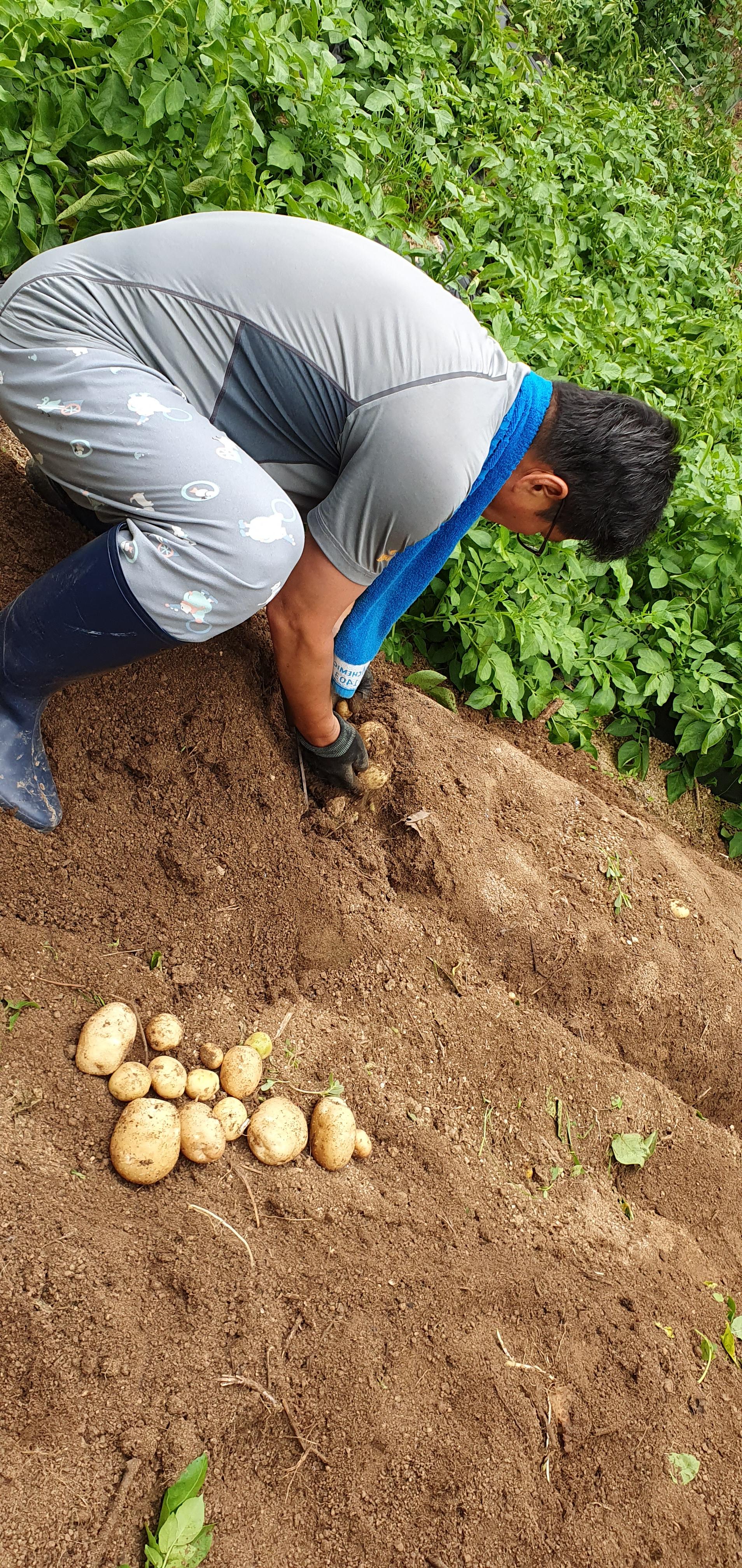 상쾌한 공기를 마시고는 푸르른 잎이 무성한 감자를 캐어본다.