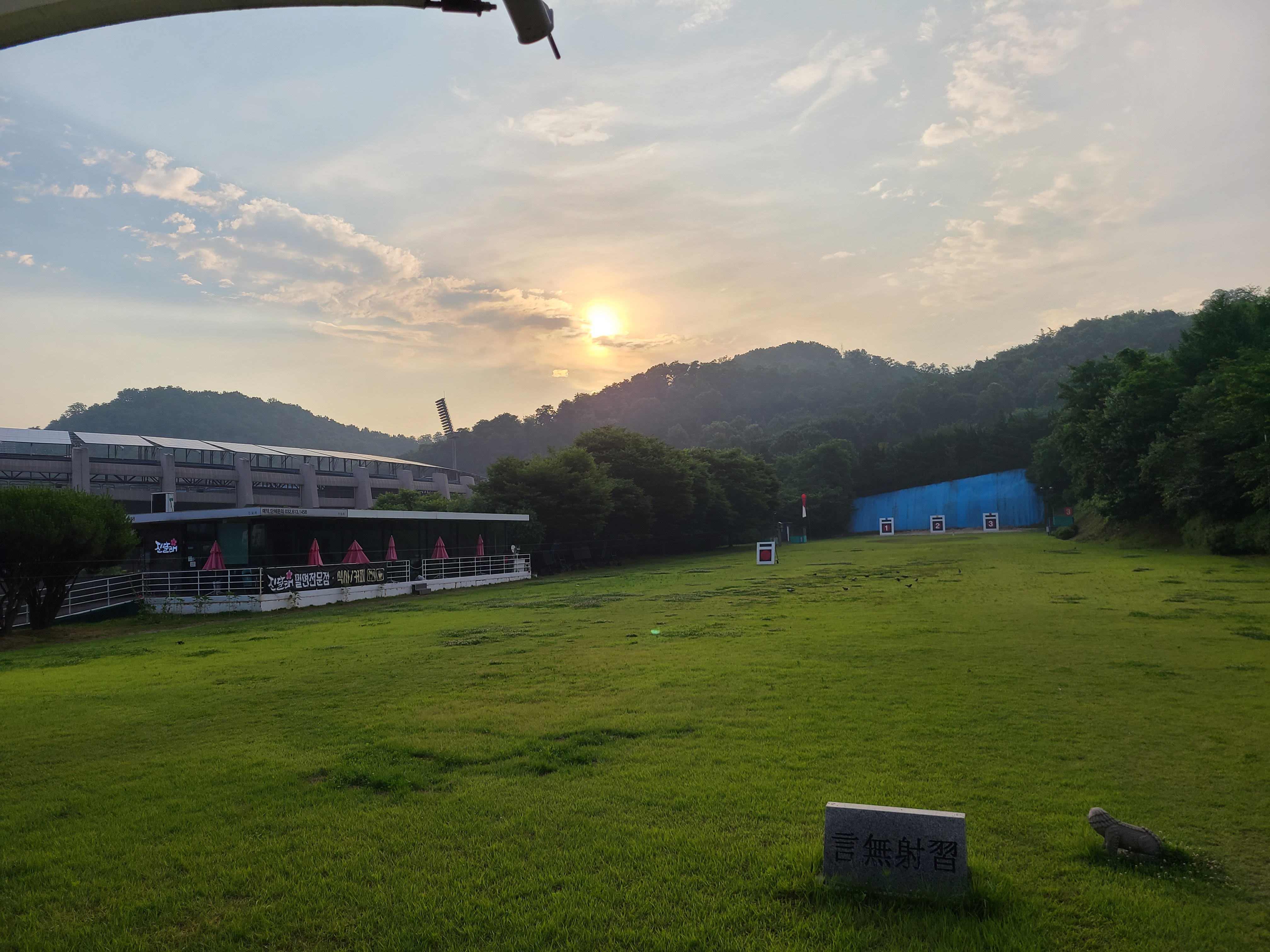 준비하여 사대에 서니 동향의 활터라 떠오르는 태양이 아침부터 따갑고 눈이 부시다.