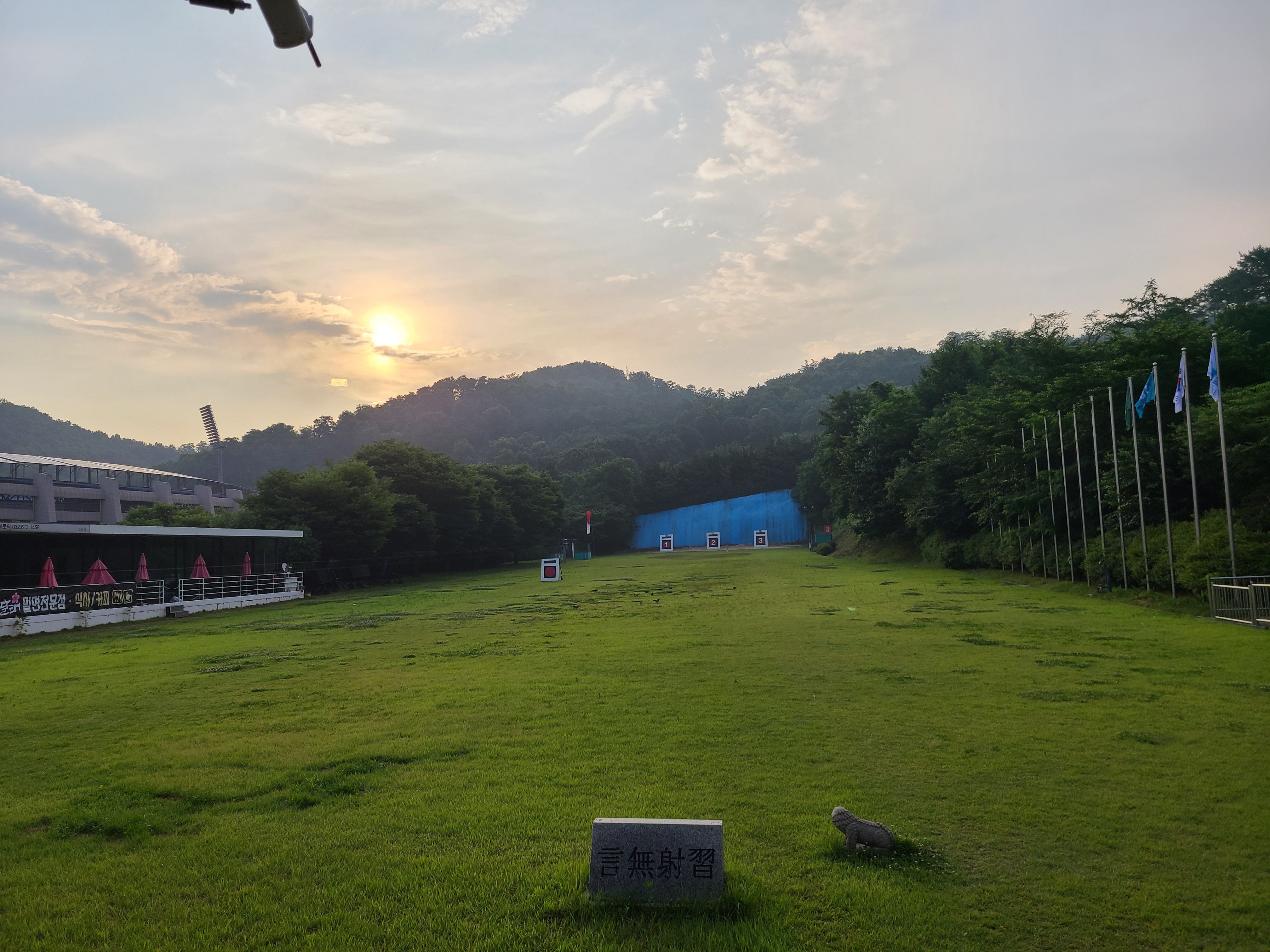 준비하여 사대에 서니 동향의 활터라 떠오르는 태양이 아침부터 따갑고 눈이 부시다.