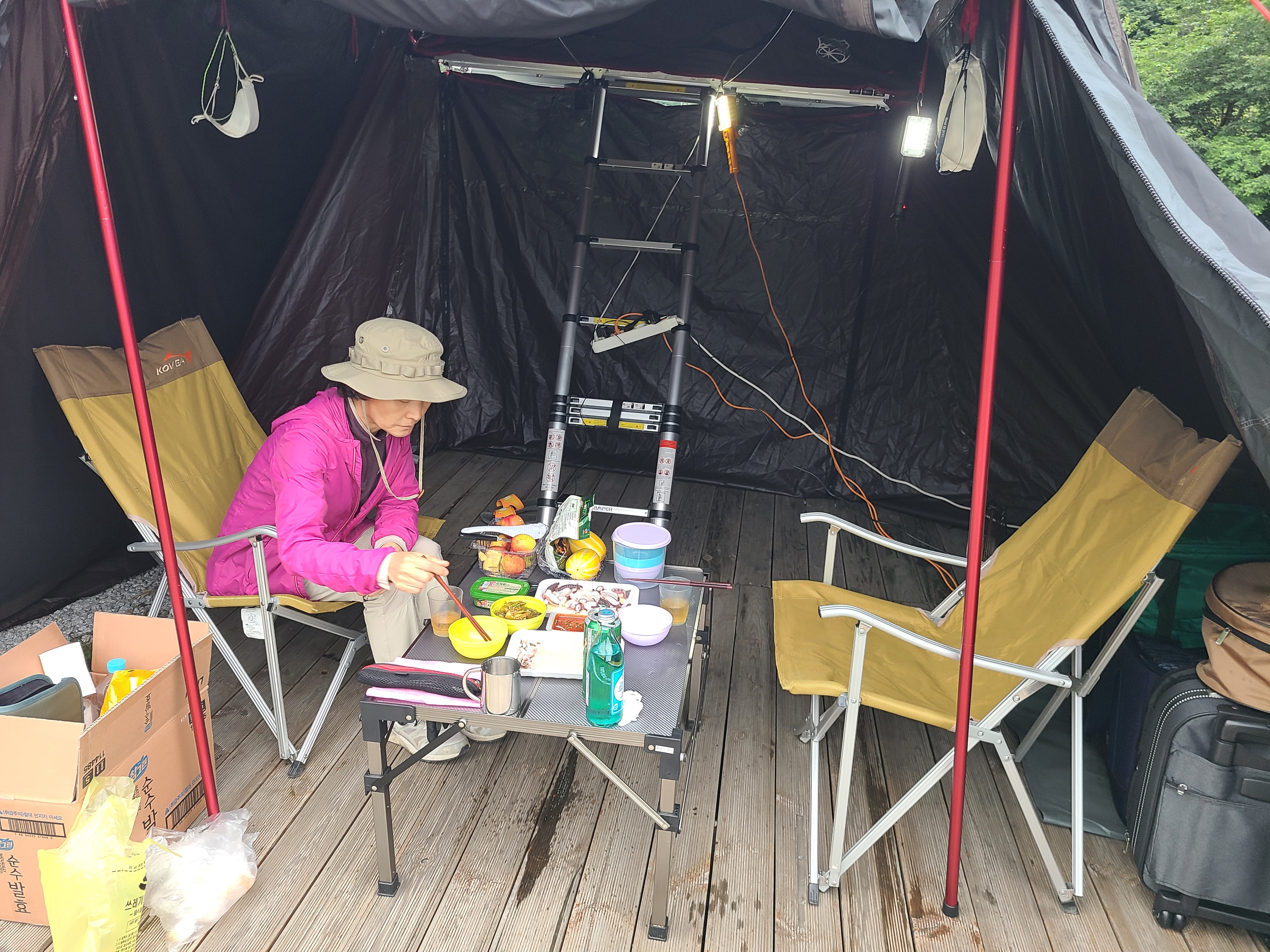 여기저기 알아보다가 해변이 아닌 계곡부근의 주문진글램핑장의 데크가 가능하다니 그곳으로 달려간다.