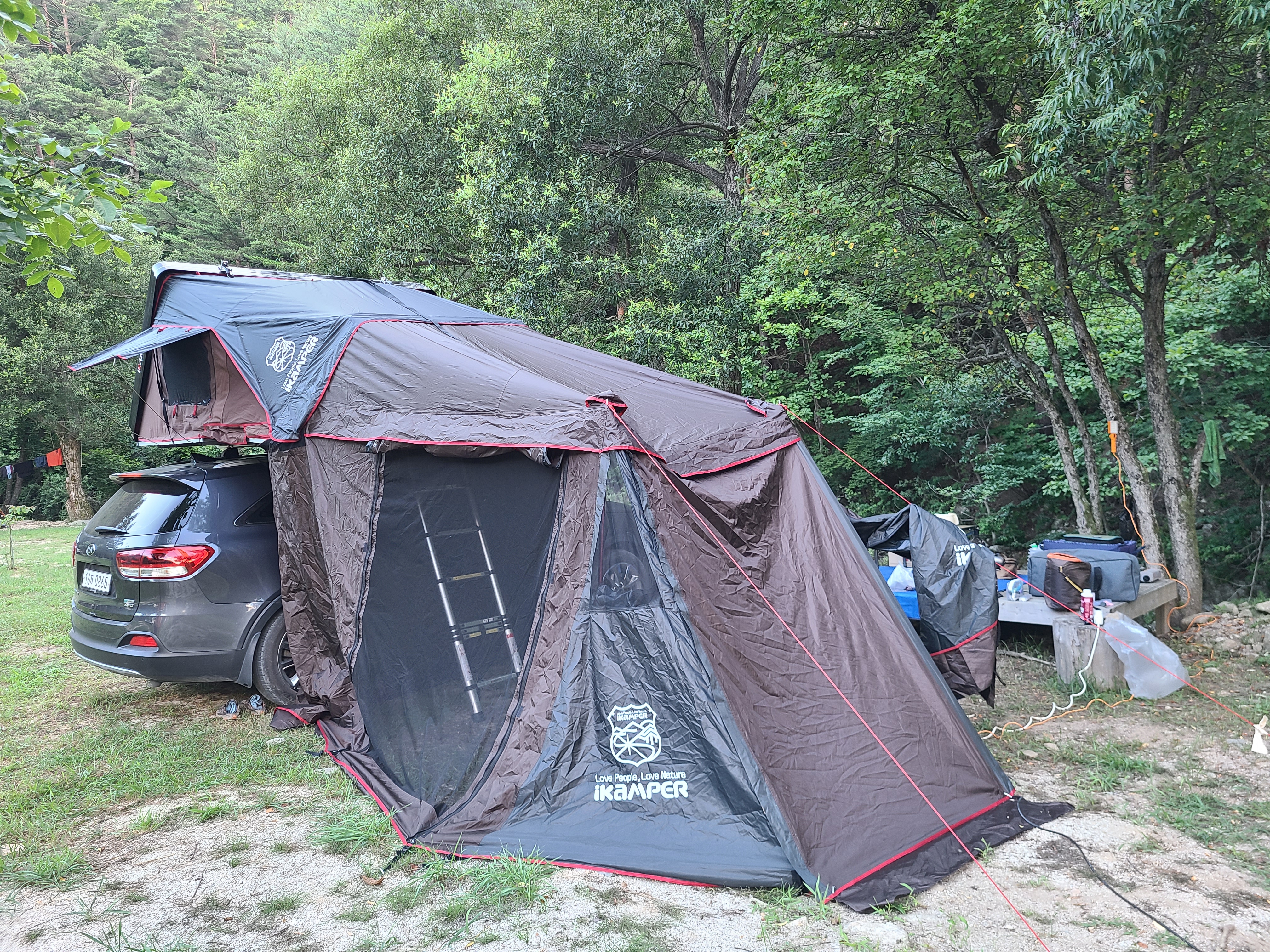 소나무숲속에 자리잡은 캠핑장은 바로옆에 계곡이 있어 물줄기가 흘려내리며 조용하고 한갓지다.