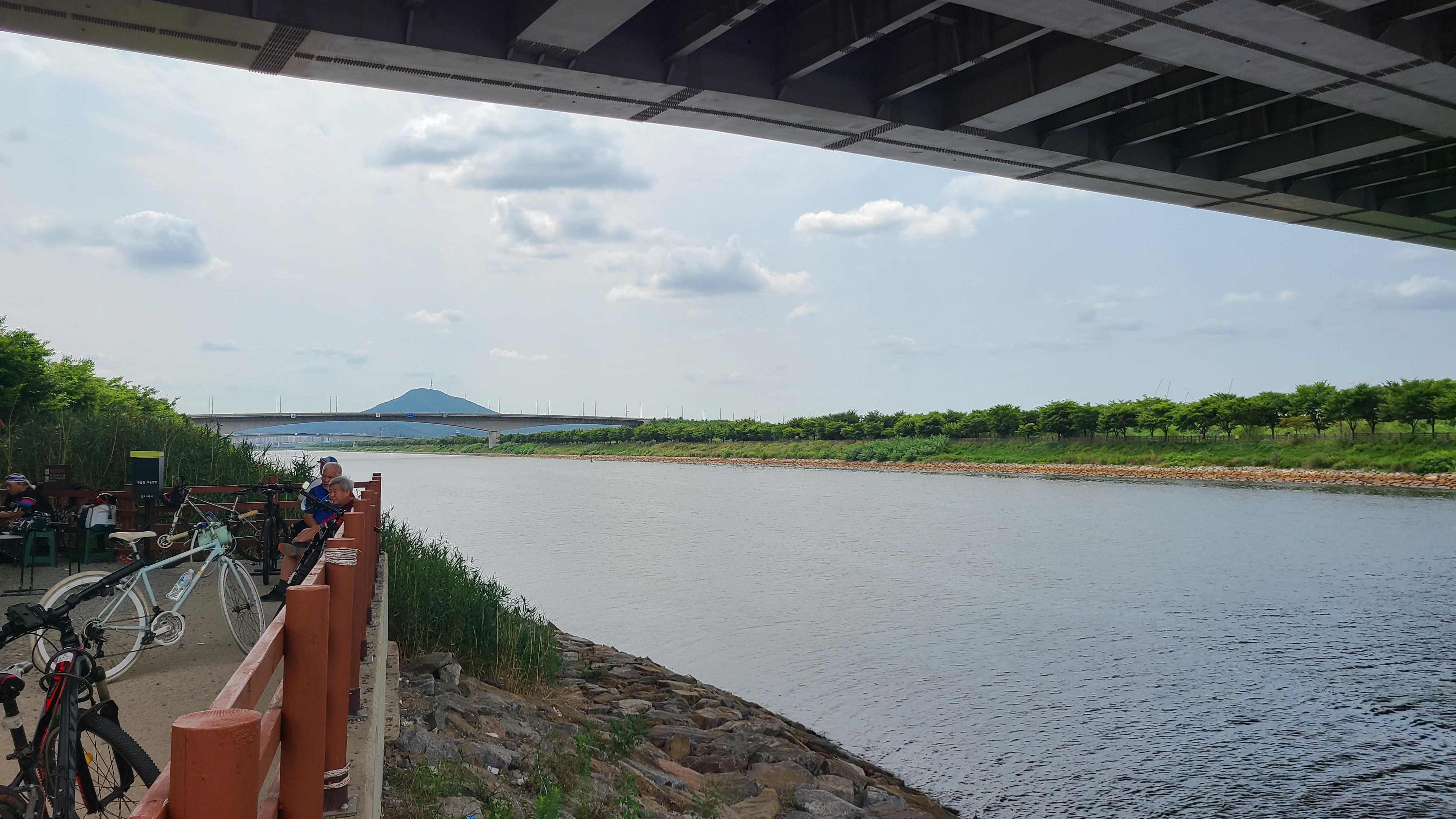 방화대교그늘에서 잠시 휴식을 취하다가 편의점 건너편 다리밑으로 이동하여 좌석을 잡고는 가져간