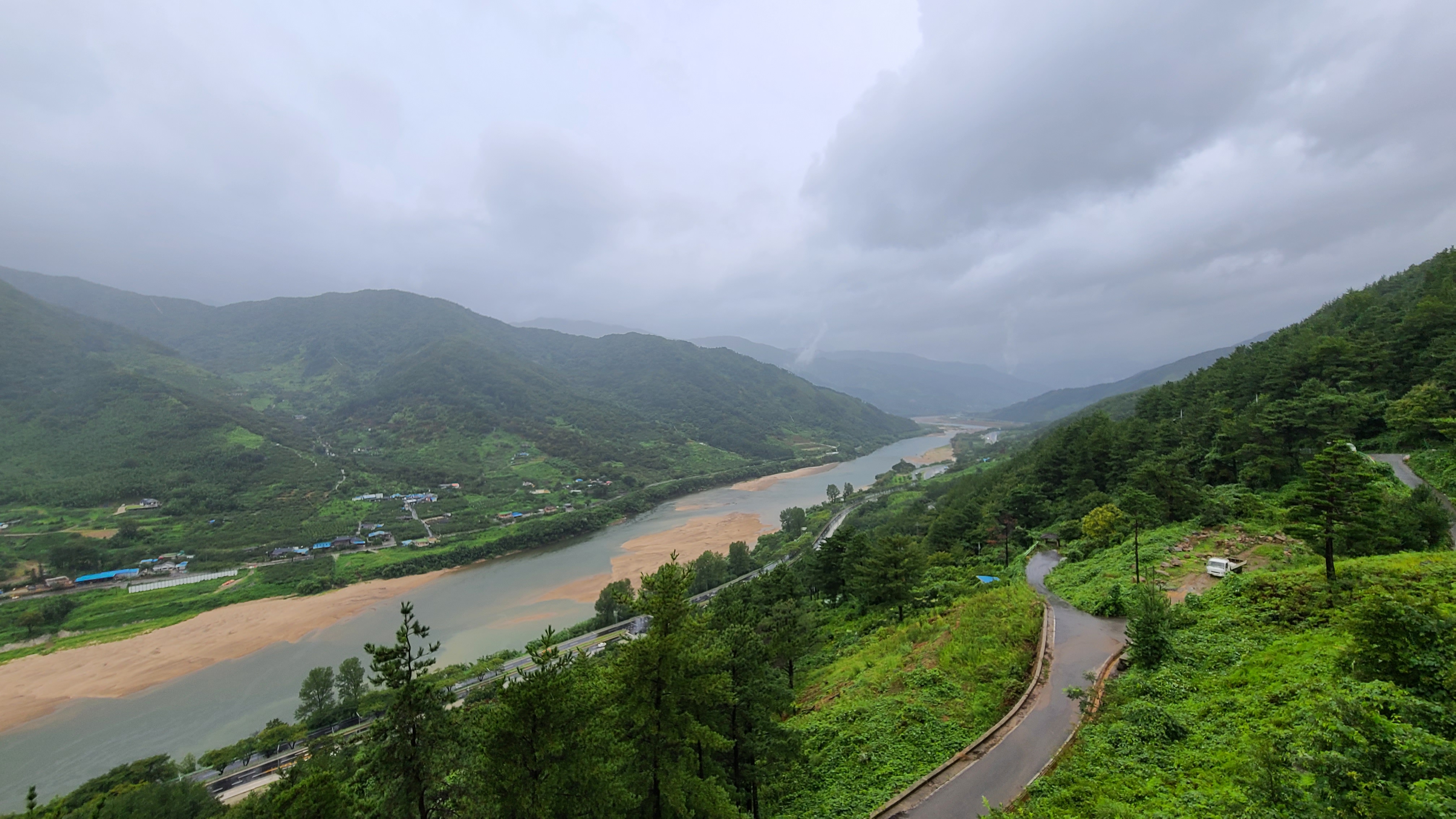 비는 소강상태에 들어가고 산자락에 조성한 스카이워크는 섬진강을 내려보는 자리에 조성되어