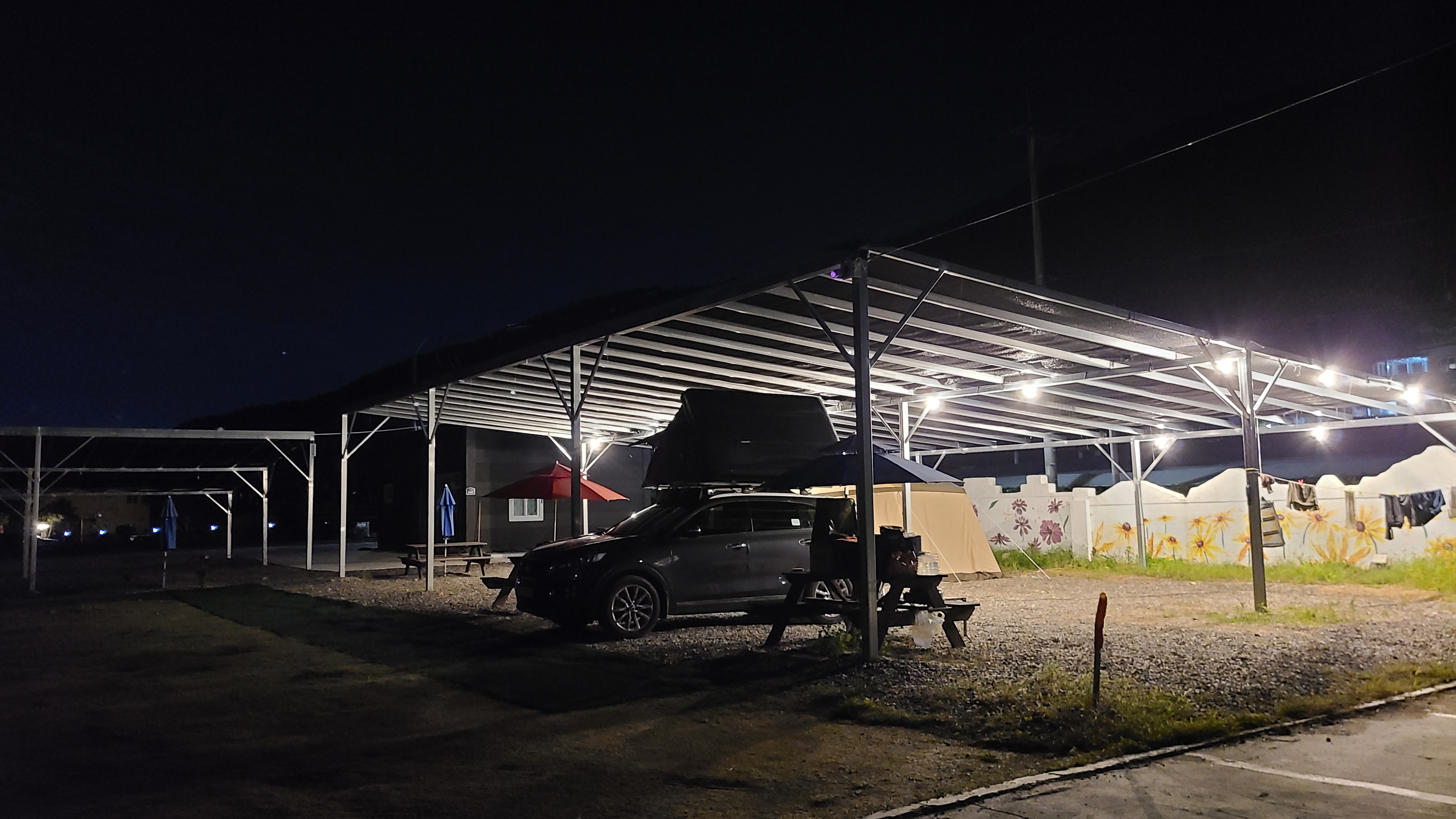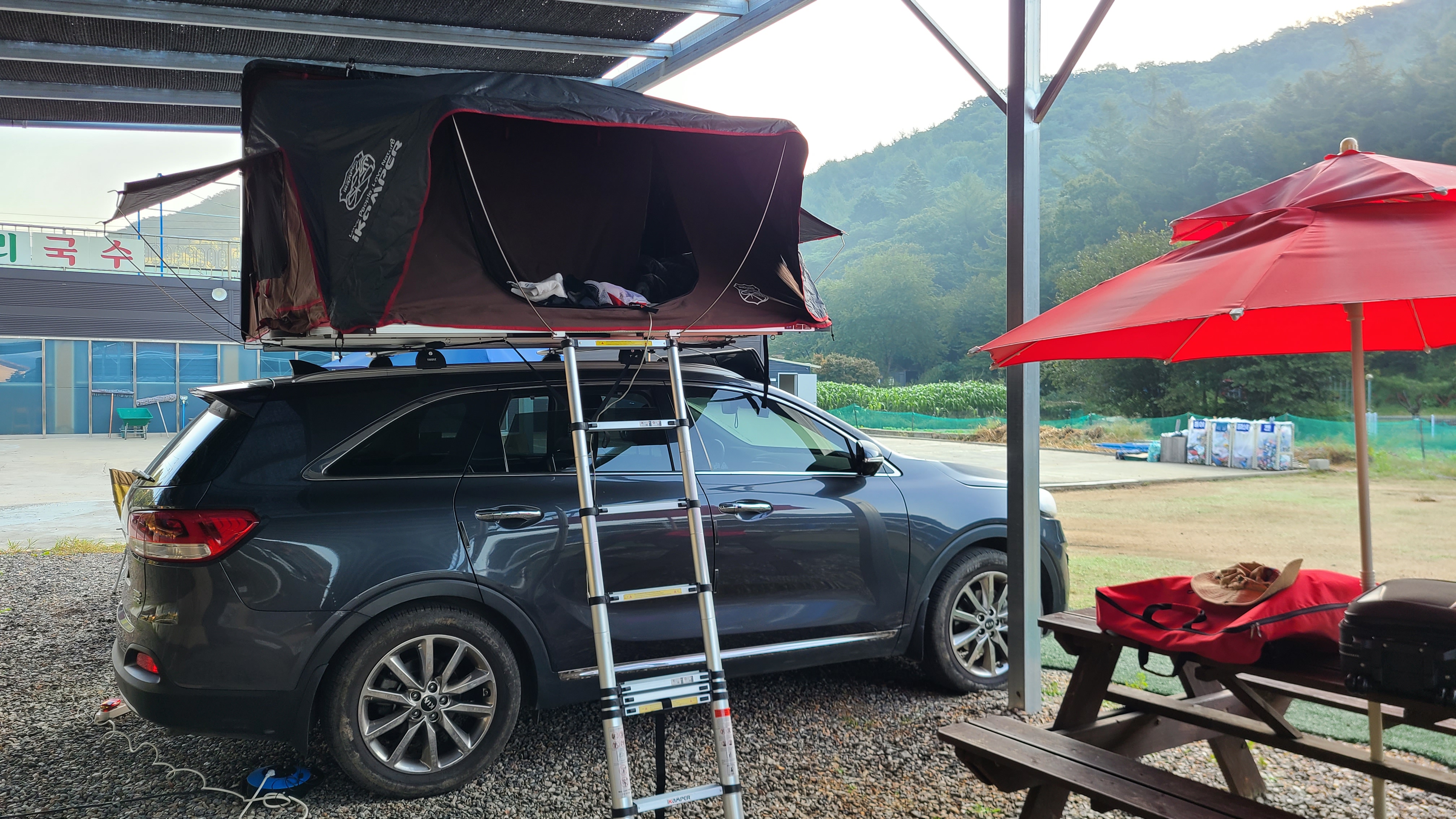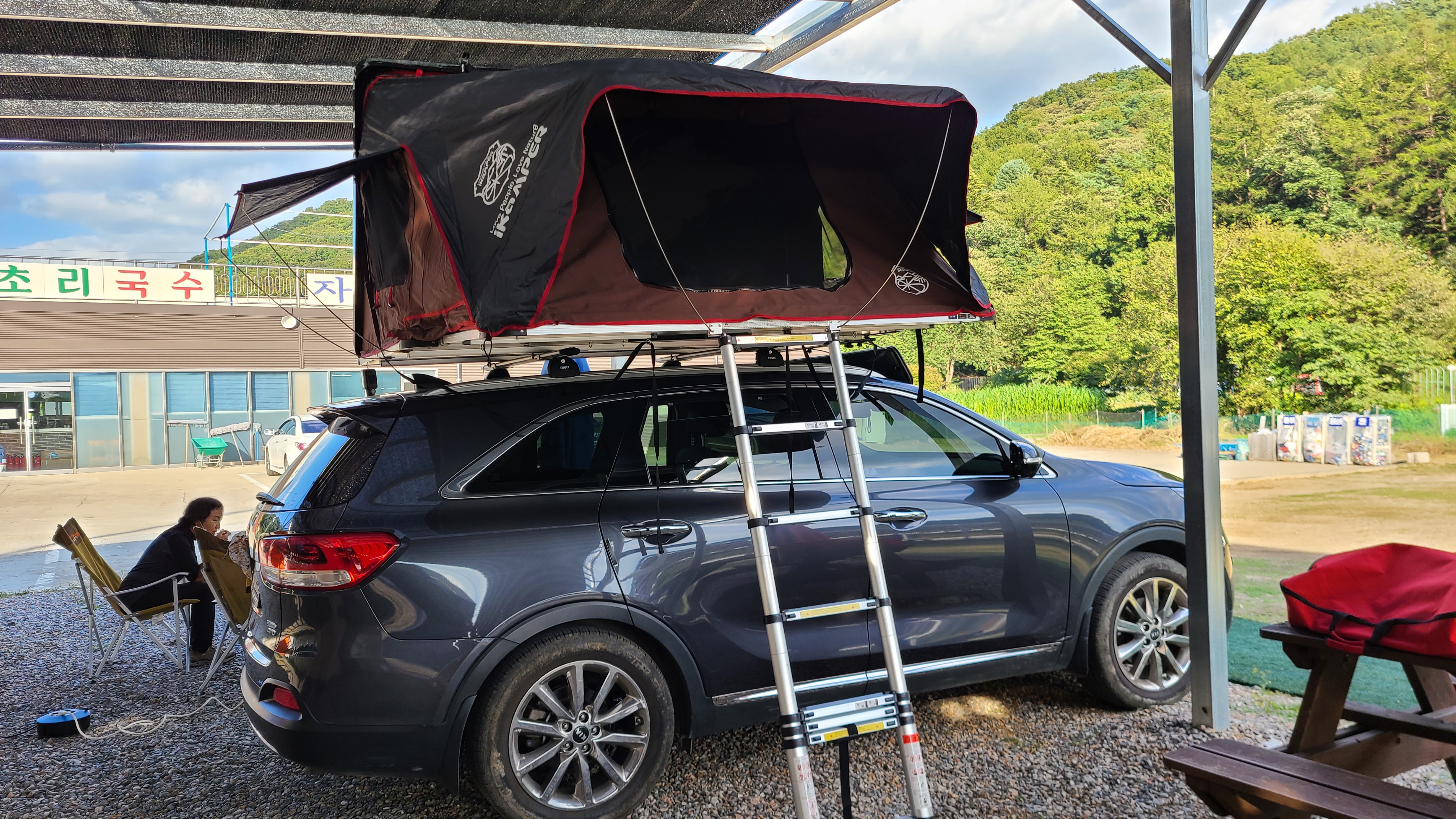 샤워장과 화장실이 가까운 그늘막이 쳐있는 장소에서 루프탑텐트만 펼치고 부근에 야외용벤치가 있으니