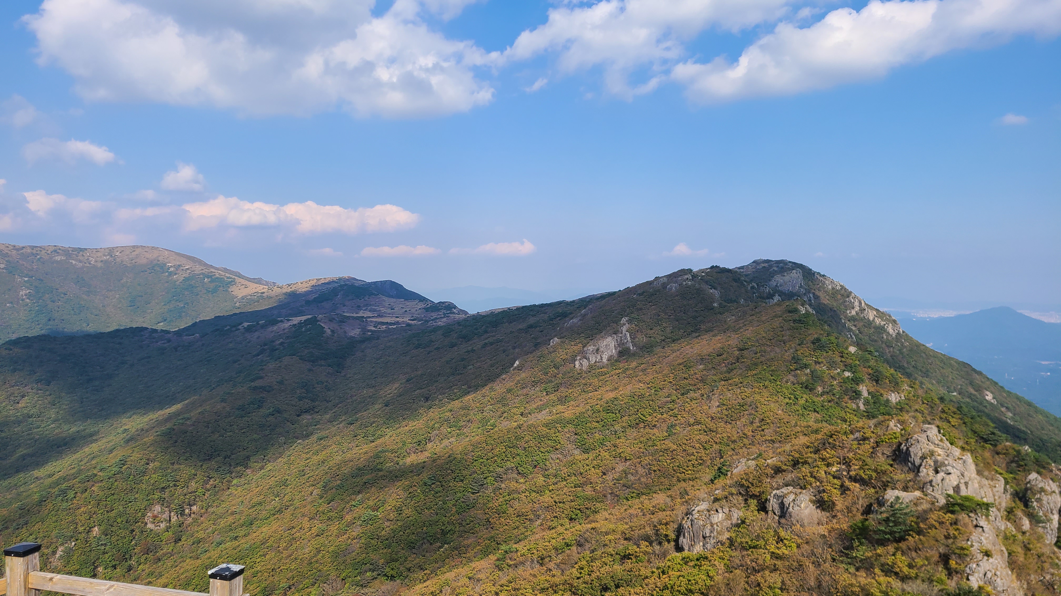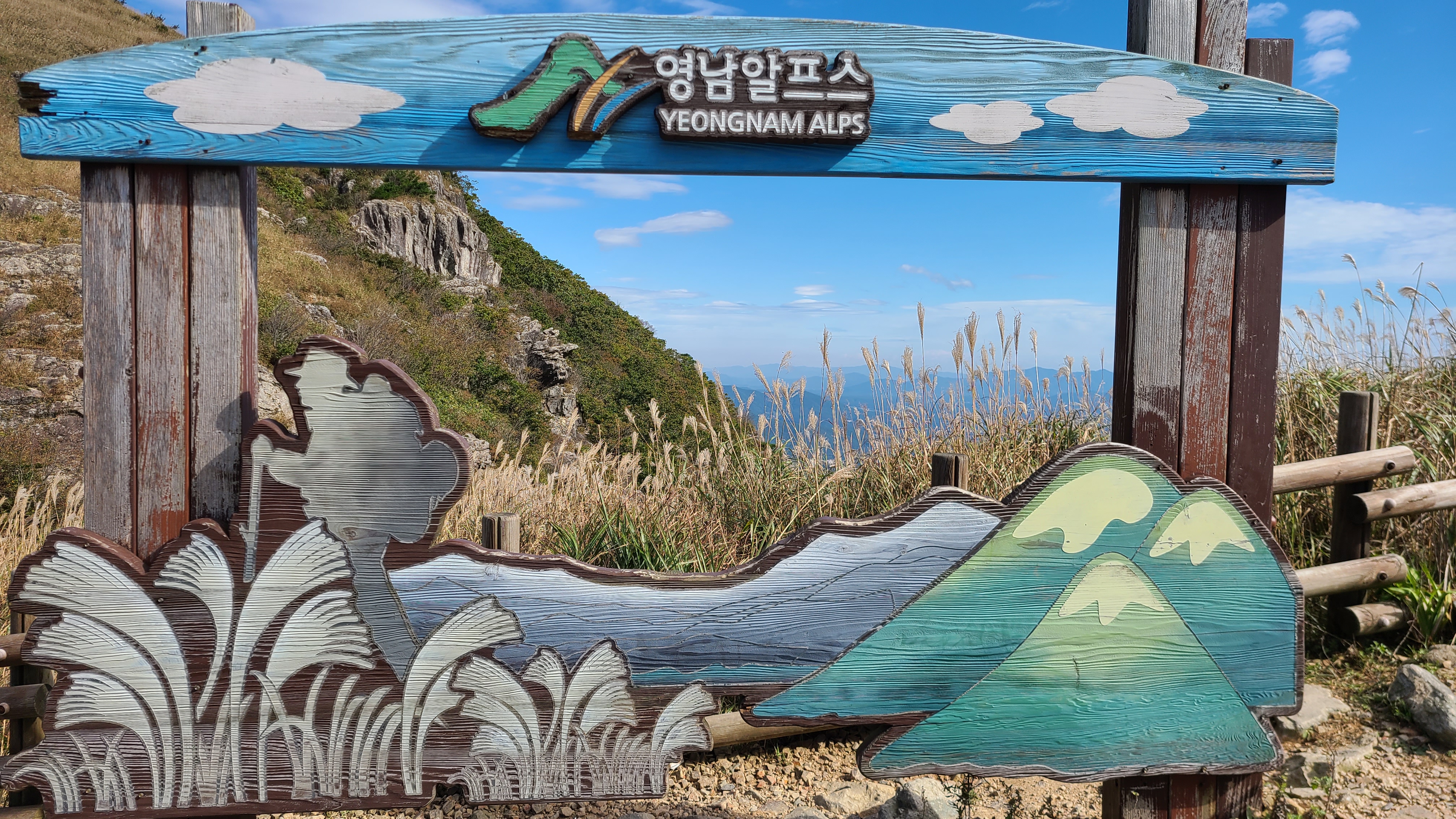 영남알프스산군들이 웅장하게 바라보이고 수면부족이지만  맑은 공기속에 걸으니 컨디션이 양호하다.